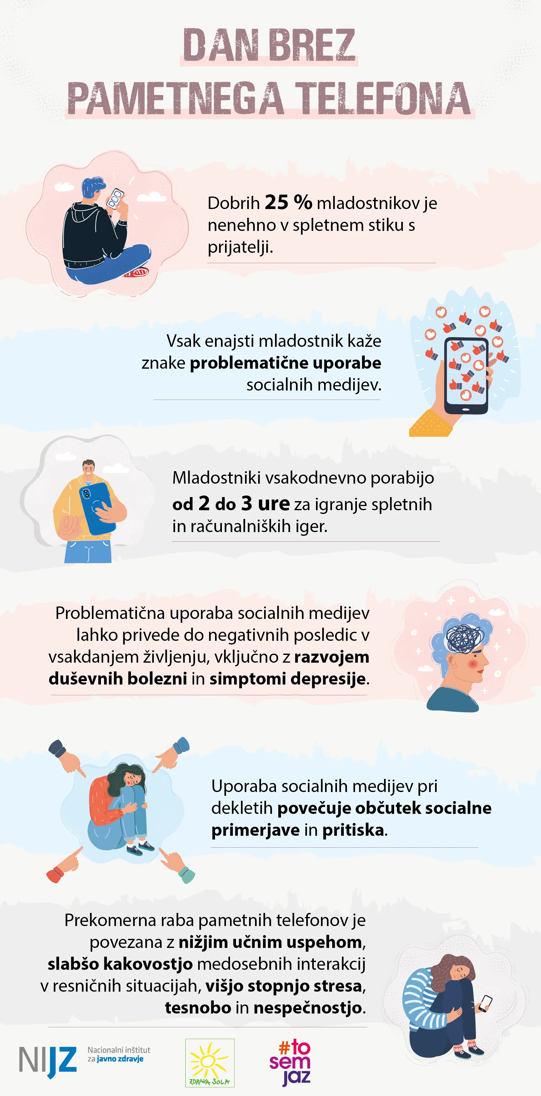 Naša šola, kot del mreže Zdravih šol, se tudi letos pridružuje pobudi Svetovni dnevi brez pametnega telefona, ki potekajo od 6. do 8. februarja. 6. februar je leta 2001 uvedel francoski pisatelj Phil Marso z namenom ozaveščanja o vplivu mobilnih naprav na naše življenje.