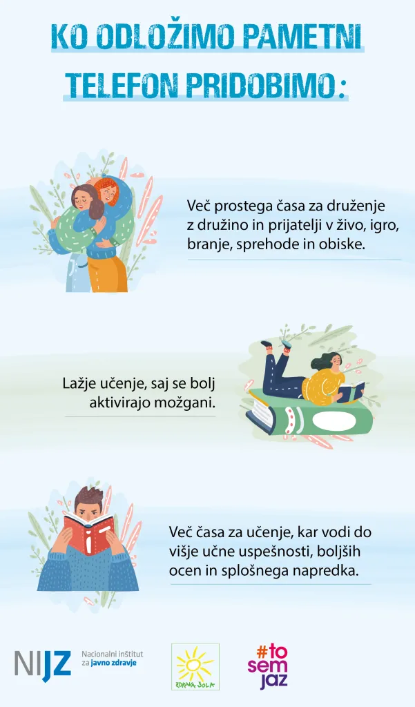 Vse učence, zaposlene, starše in krajane vabimo, da se pridružijo pobudi in skupaj z nami preizkusijo, kako je živeti brez pametnega telefona vsaj en dan. Verjamemo, da bomo skupaj odkrili veliko zanimivih načinov preživljanja prostega časa in okrepili medsebojne odnose!