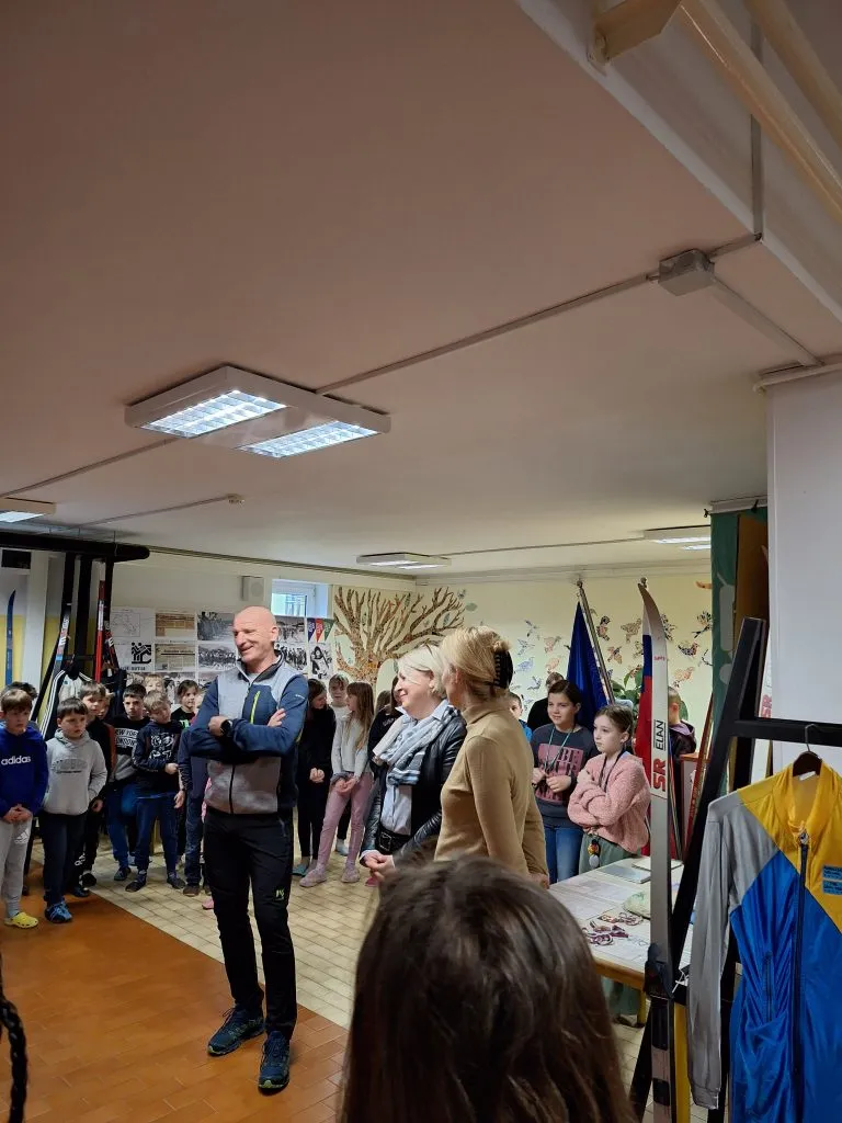 V šoli smo v ponedeljek,11.3., pouk začeli v avli. Spomine na tekaške uspehe je z nami delila naša učiteljica Marija Rupnik Hladnik, s smučarskim tekom pa se še vedno ukvarja učitelj športa Drago Kavčič, ki je trener v Tekaškem klubu Idrija.