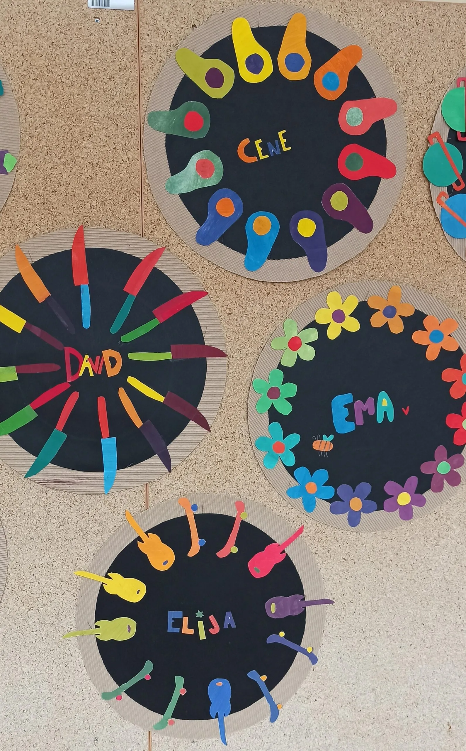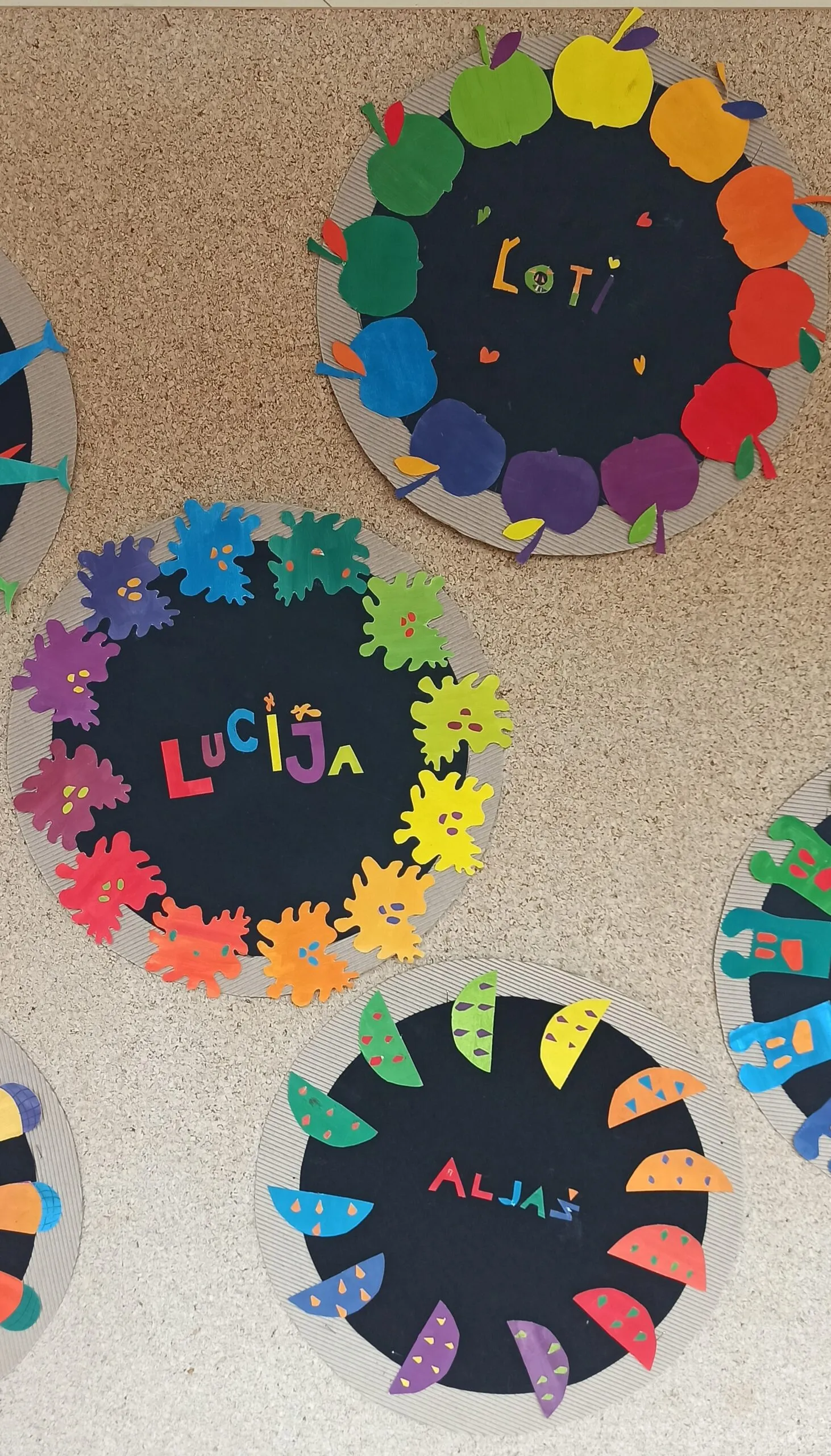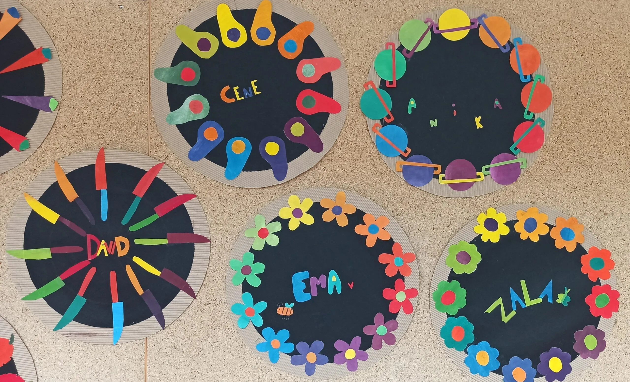 Učenci so spoznavali zakonitosti mešanja barv in jih razporedili v krog v poljubnem motivu, dodali pa so še detajl v nasprotni barvi.