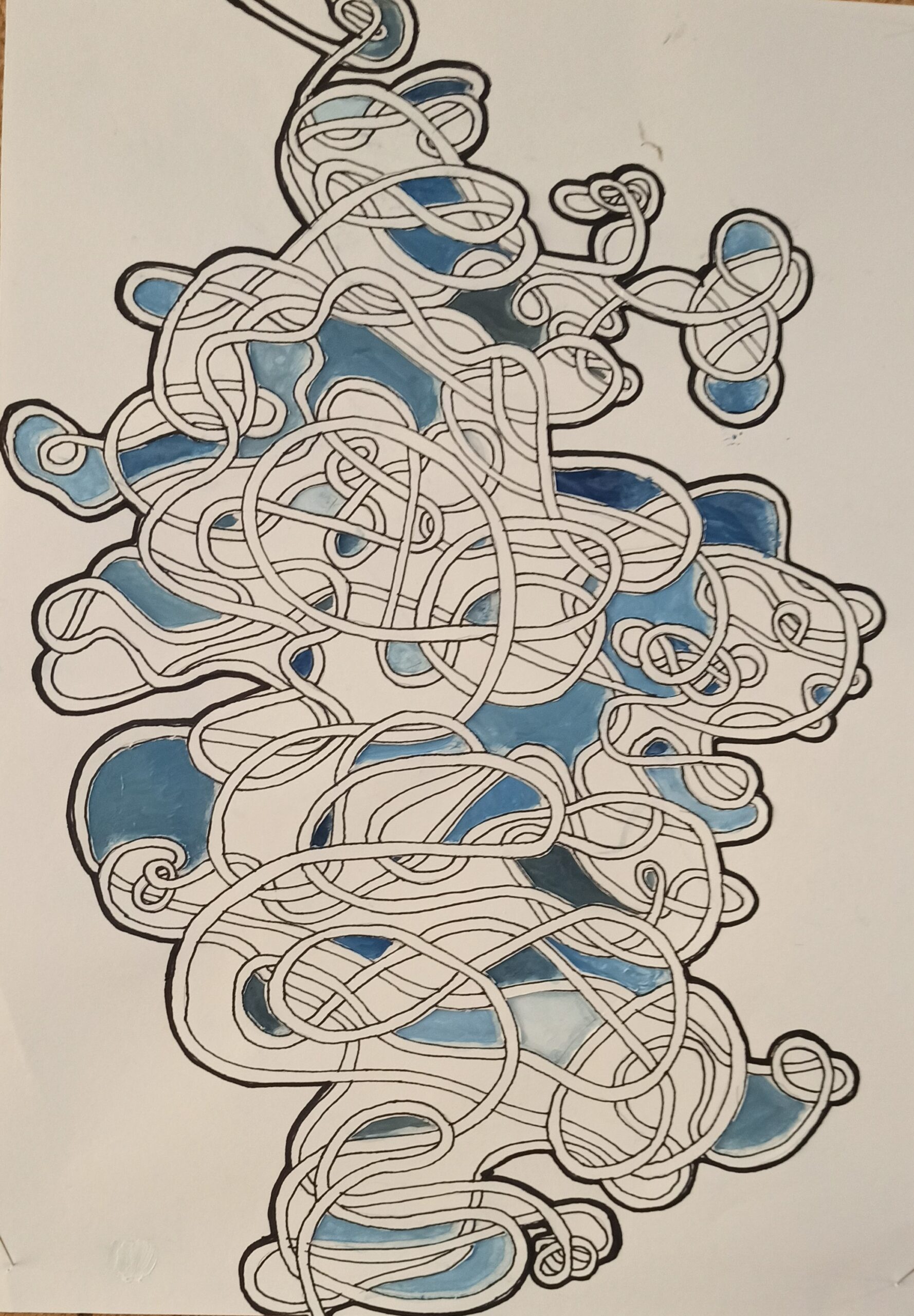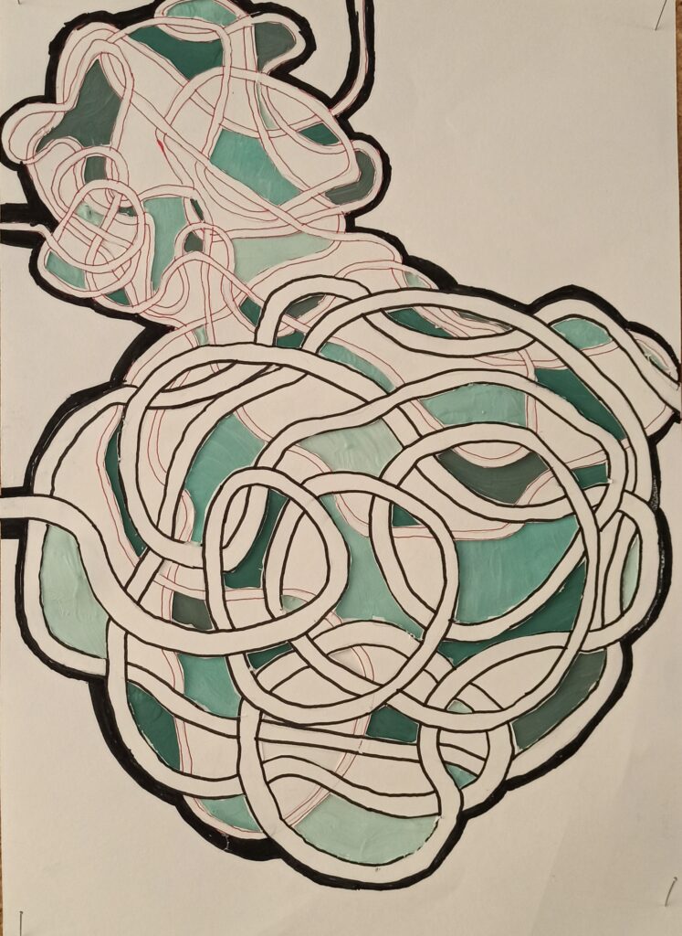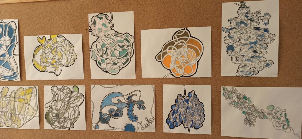 Spodaj, pa čez, pa zopet spodaj, dva vozla na levi in trije na desni …Vadimo mirno roko in prostorske predstave, potem pa se naučimo še nekaj o kakovostnem barvnem kontrastu.