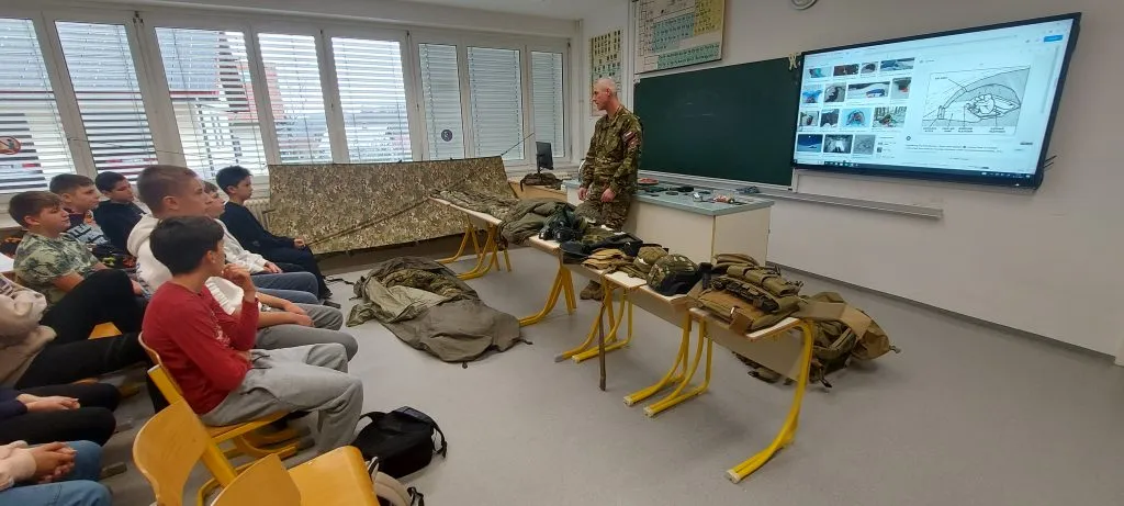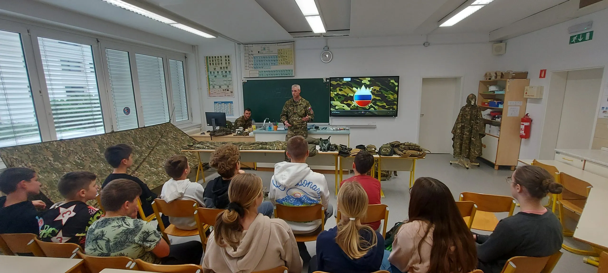 Pripadniki Slovenske vojske so iz Veščinskega centra v Vipavi prinesli pripomočke in opremo, ki jo potrebujejo pri delu in bivanju na terenu. Učenci so spoznali oblike bivakov, pravilno rabo spalne vreče in kaj narediti, če se znajdemo v gorah, kjer ne najdemo drugega bivališča kot beli sneg.