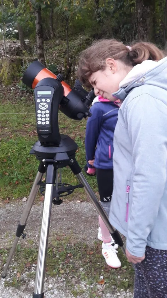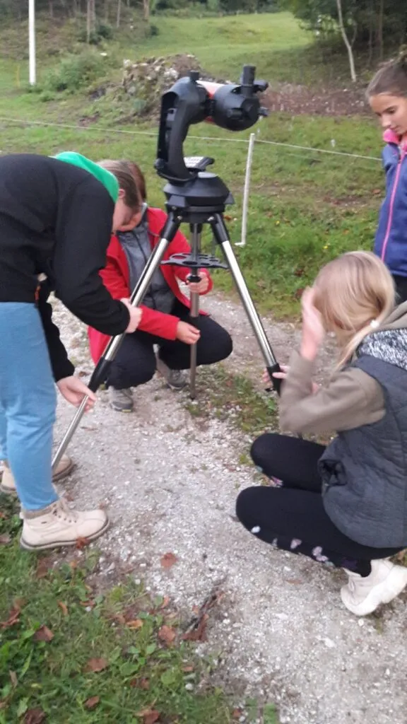 Učenci, ki obiskujemo astronomski krožek, smo se v torek, 21. septembra, zbrali na šolskem igrišču, da bi opazovali polno Luno. Najprej smo se naučili sestaviti in umeriti teleskop. Na začetku opazovanja so nam ponagajali oblaki, ki so povsem zakrili Luno. Hitro smo na nebu našli druge objekte in se lotili njihovega opazovanja. Skozi teleskop smo opazovali Jupiter in njegove štiri lune, kasneje pa še Saturn. Zelo lepo so bili vidni tudi njegovi obroči. Ko se je prikazala še Luna, smo na njej opazovali kraterje in temne planote, ki se imenujejo morja.