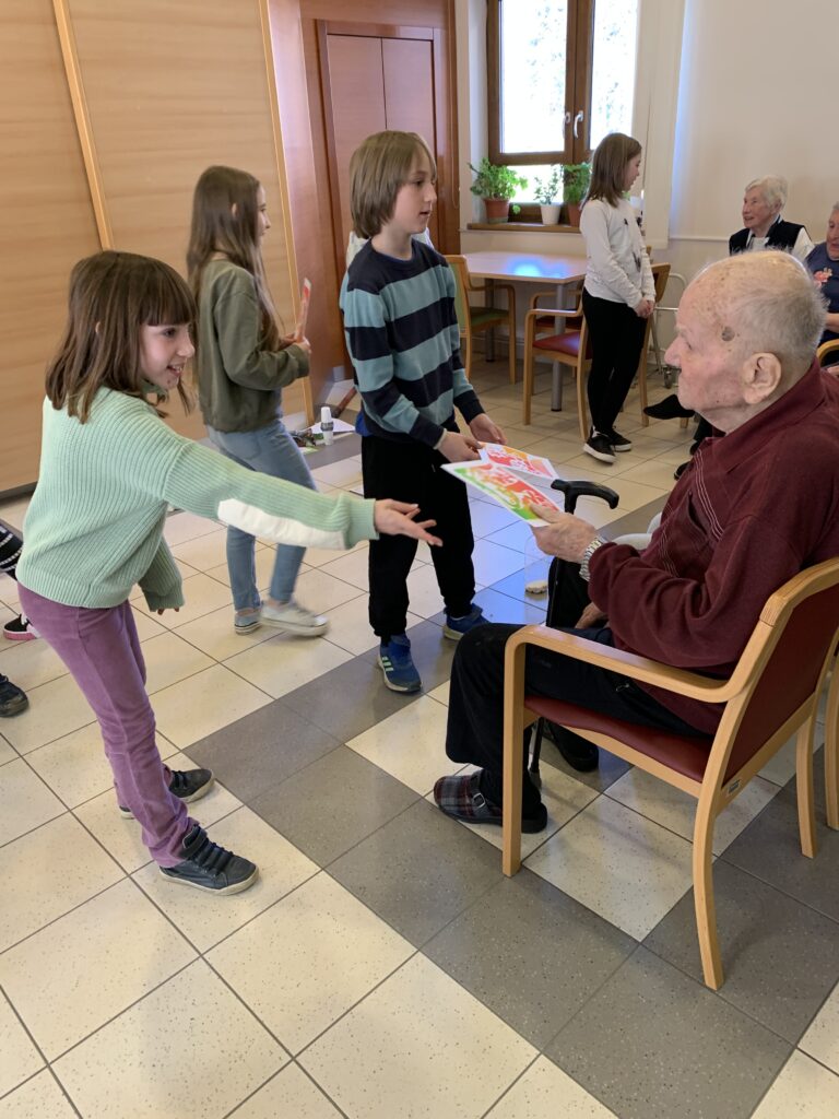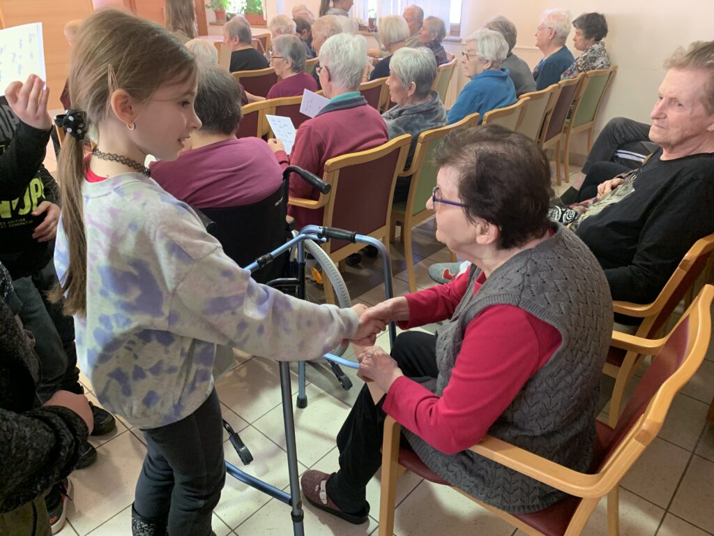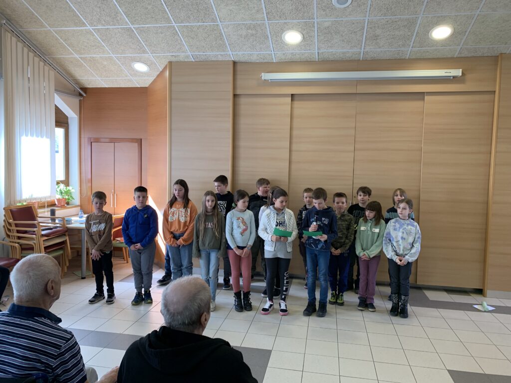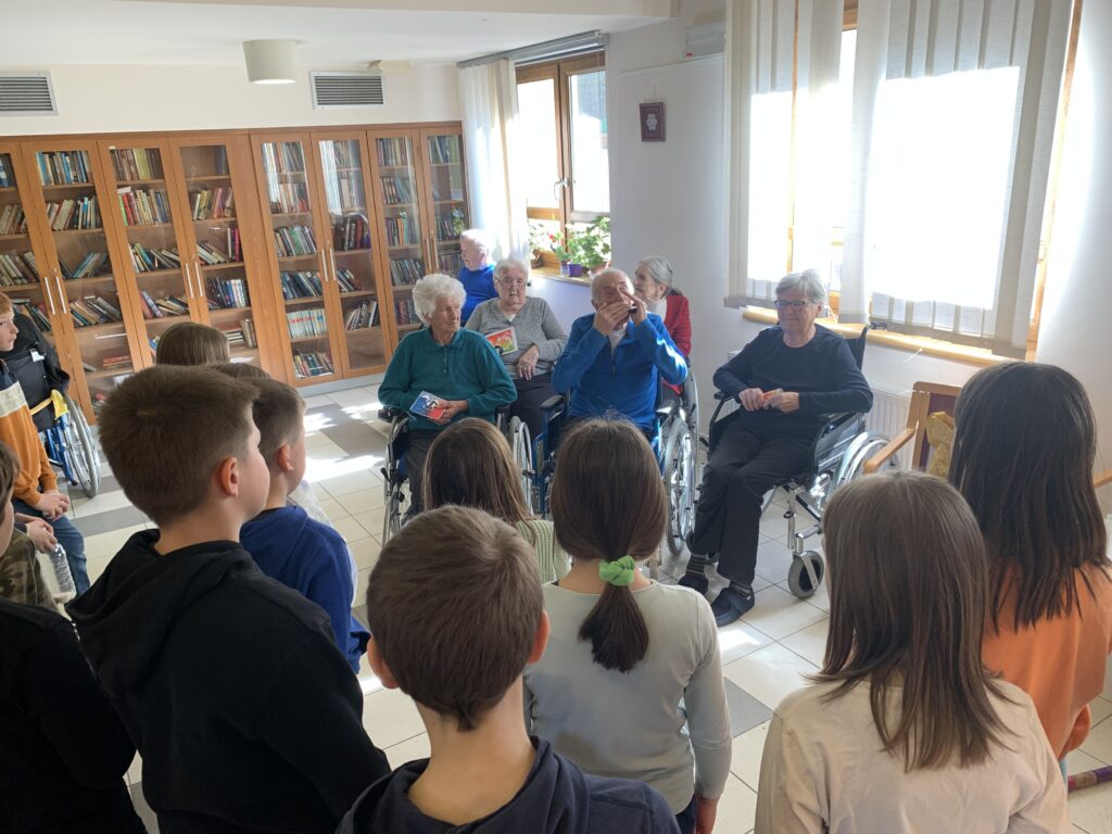 Danes so učenci 4. razreda obiskali oskrbovance Vitadomu. Recitrali so jim, peli, brali basni, igrali na instrumente, brali opise in zastavljali uganke ter z obiskom ogreli njihova srca. Oskrbovanci so bili obiska veseli. Razveselili so se pomladne voščilnice, pogleda v oči, stiska roke in klepeta z učenci. Marsikomu se je orosilo oko.