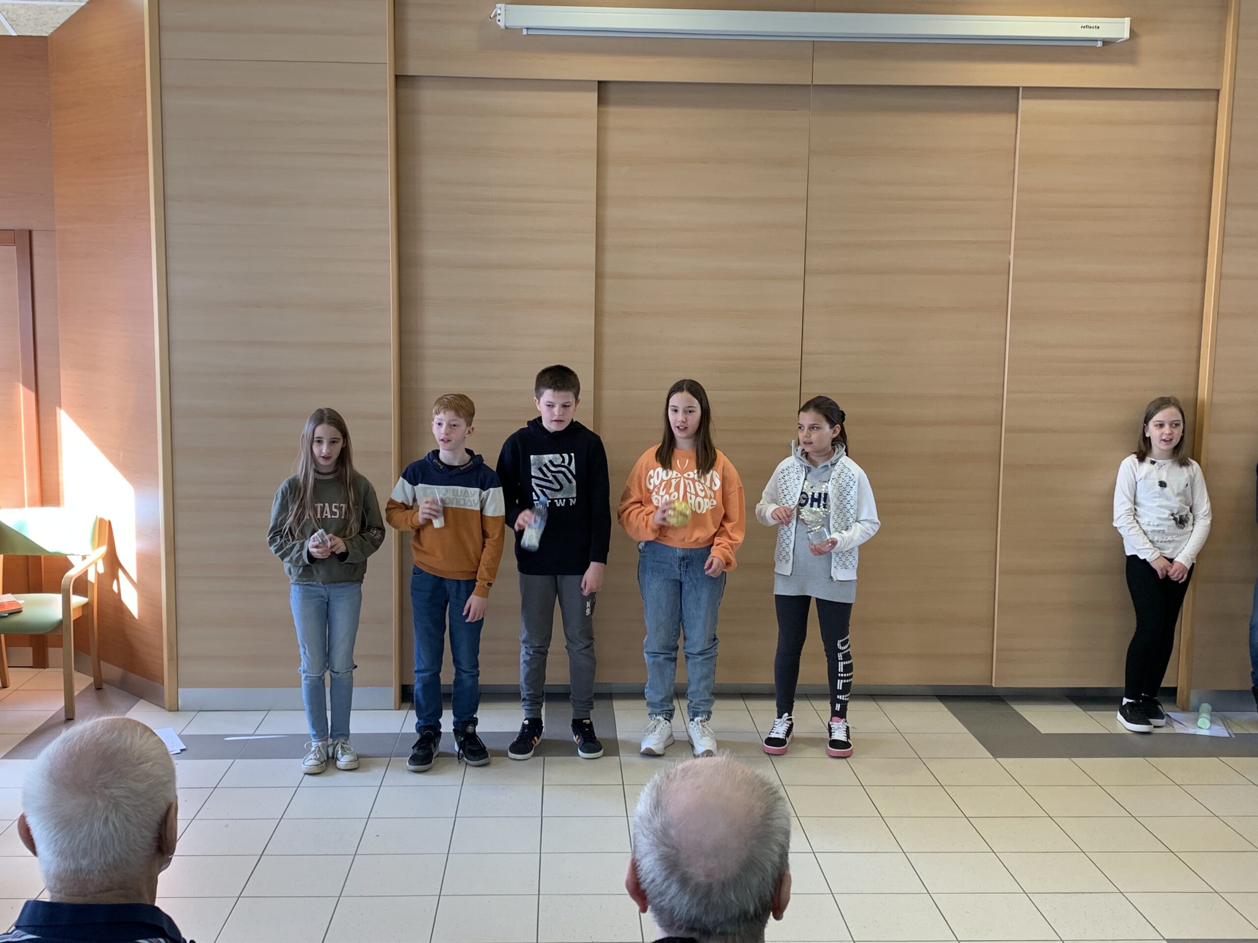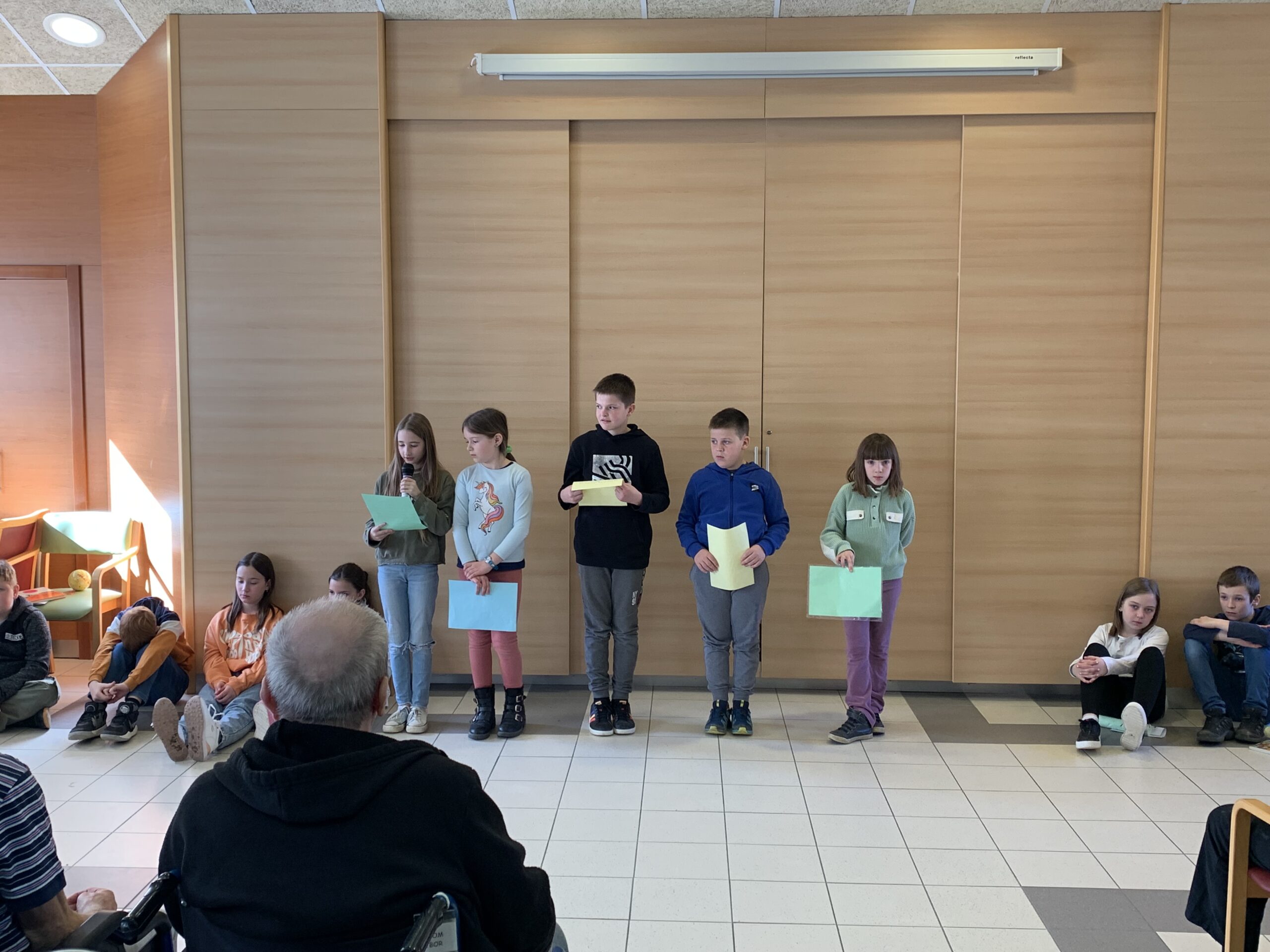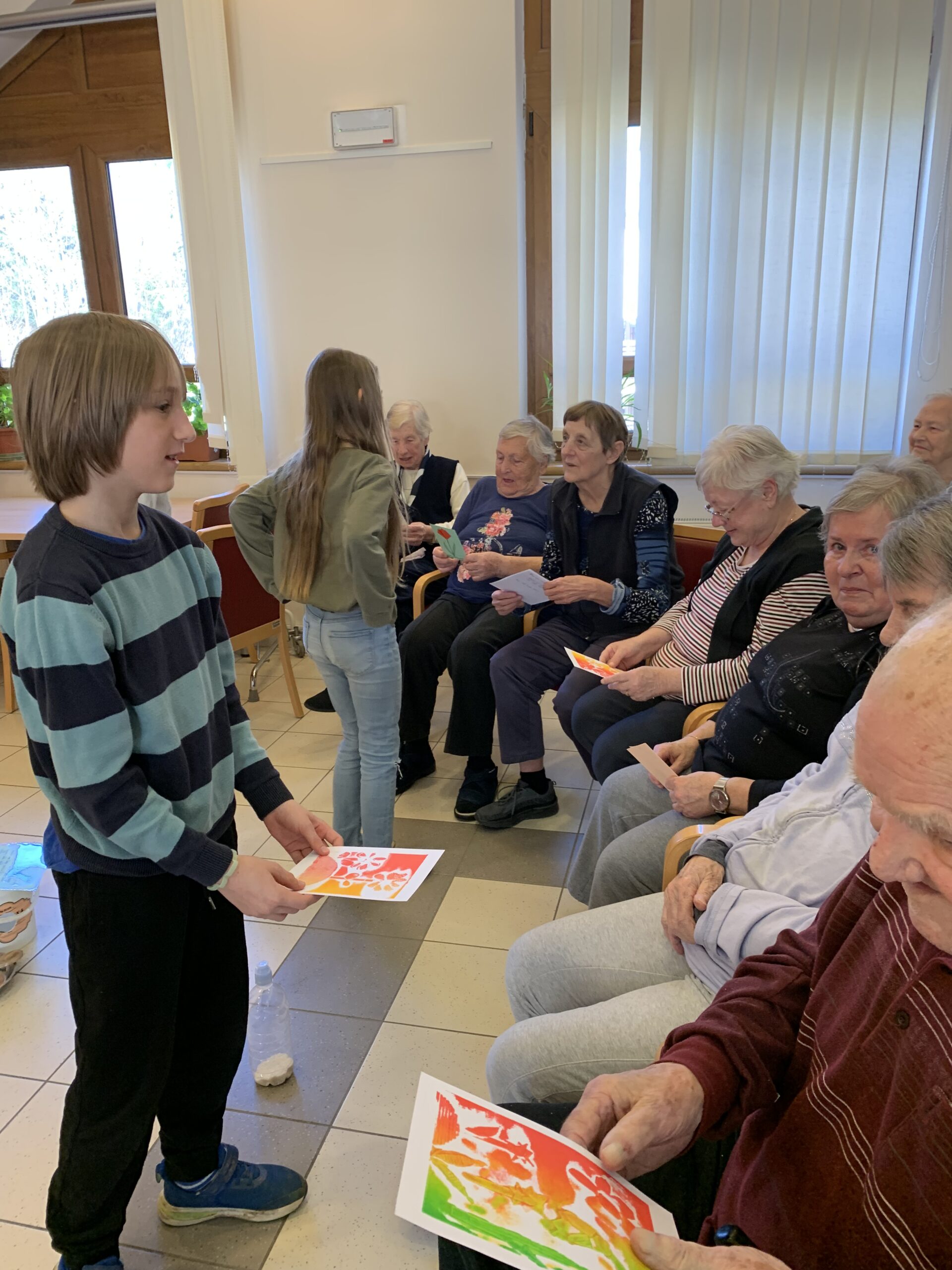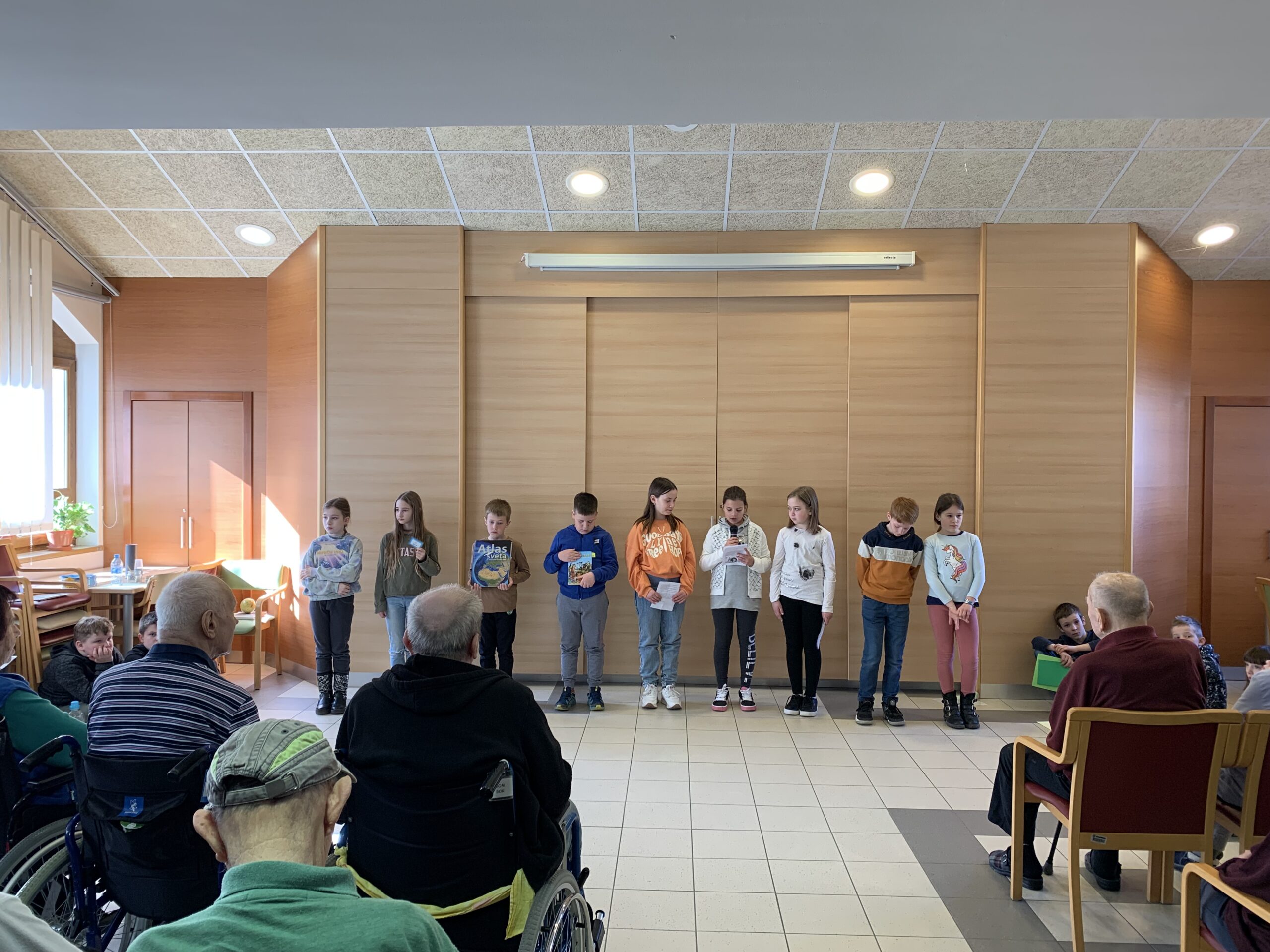 Danes so učenci 4. razreda obiskali oskrbovance Vitadomu. Recitrali so jim, peli, brali basni, igrali na instrumente, brali opise in zastavljali uganke ter z obiskom ogreli njihova srca. Oskrbovanci so bili obiska veseli. Razveselili so se pomladne voščilnice, pogleda v oči, stiska roke in klepeta z učenci. Marsikomu se je orosilo oko.