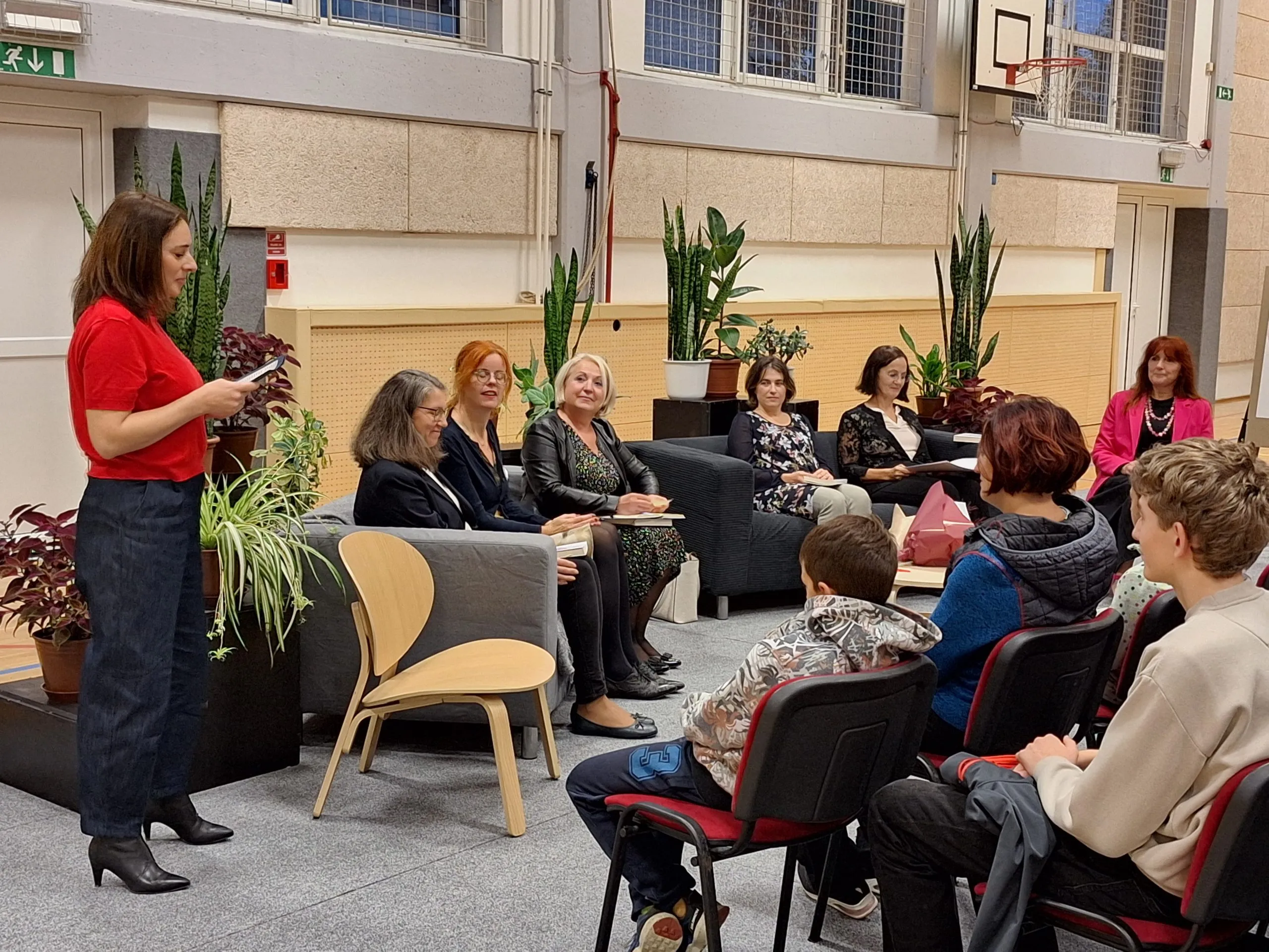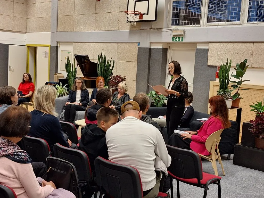 Kdor je že prebral roman Lilijane Homovec Nekdo vedno odide prvi, ve, da je Lila, glavna junakinja, cvetličarka. Šolska telovadnica je v četrtek, 17. 10. 2024, postala cvetličarna, ki je literarnemu večeru, ki ga je povezovala Valentina Tominec, dodala posebno vzdušje. Urednica knjige Gabriela Babnik Ouattara je na kratko orisala prva srečanja z Lilijano in kako je padla ideja o romanu. Ker Lila z imenom spominja na Lilijano, se je postavilo tudi vprašanje, v kolikšni meri je Lila Lilijana. Na to vprašanje je dala odgovor avtorica. Bralci, ki Lilijano poznajo, pa bodo lahko iskali podobnosti sami. V resnici je Lila slehernica. V njeni zgodbi se bo našel marsikdo od nas.