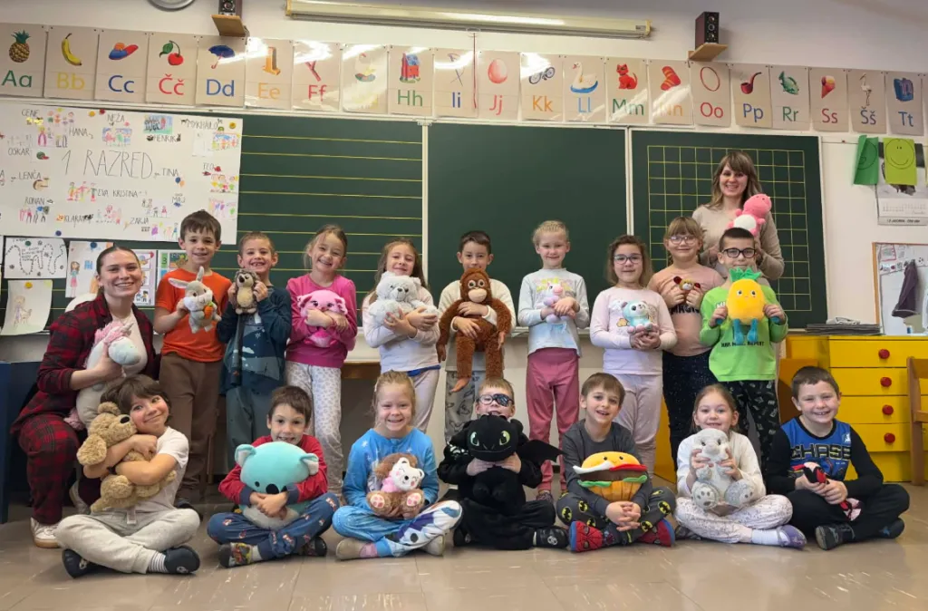 V 1. razredu smo v petek, 6. 3. 2026, v sklopu praznovanja 2. evropskega dneva pižam preživeli dan nekoliko drugače kot po navadi. V šolo smo prišli oblečeni v naših pižamah.
