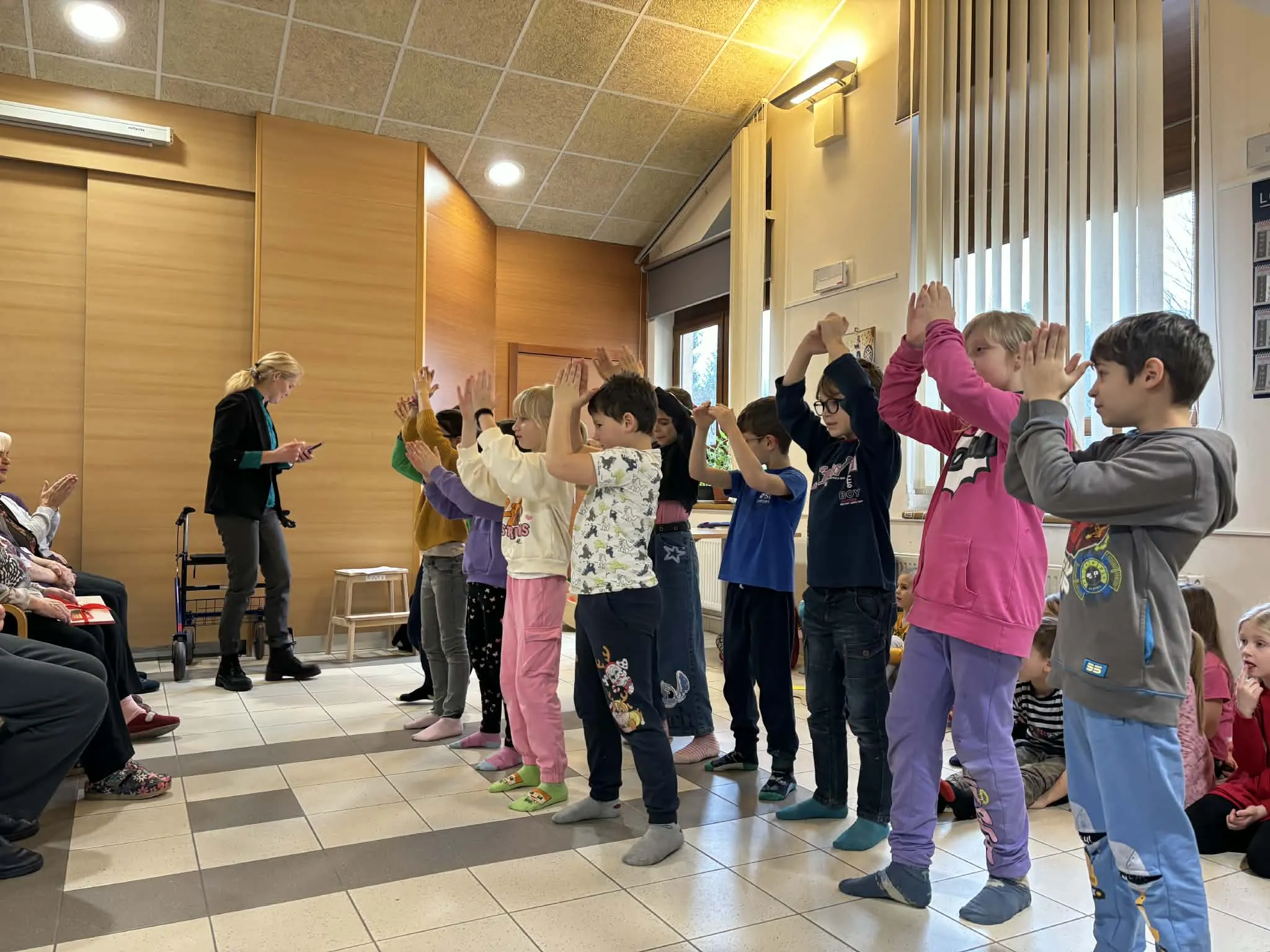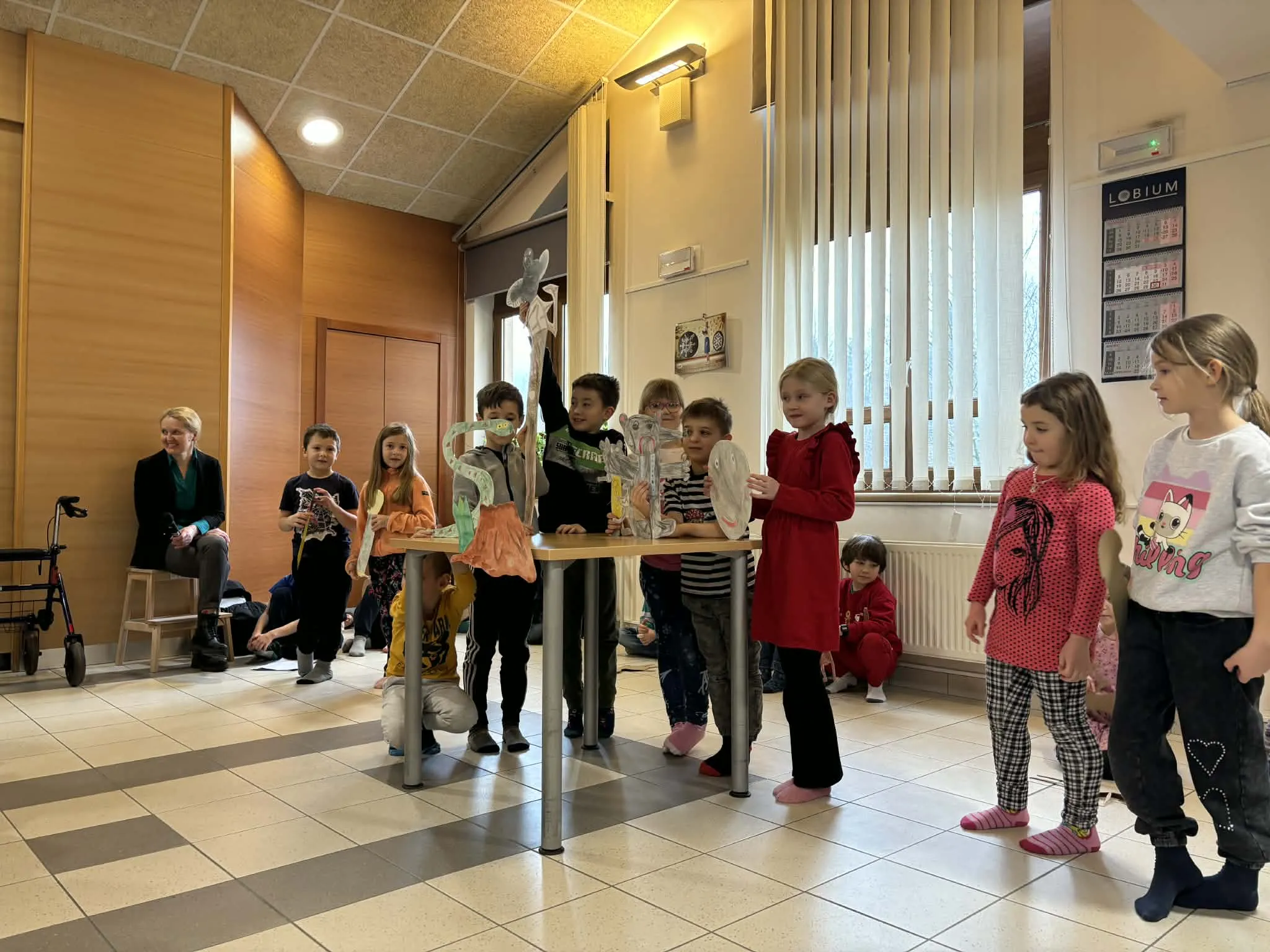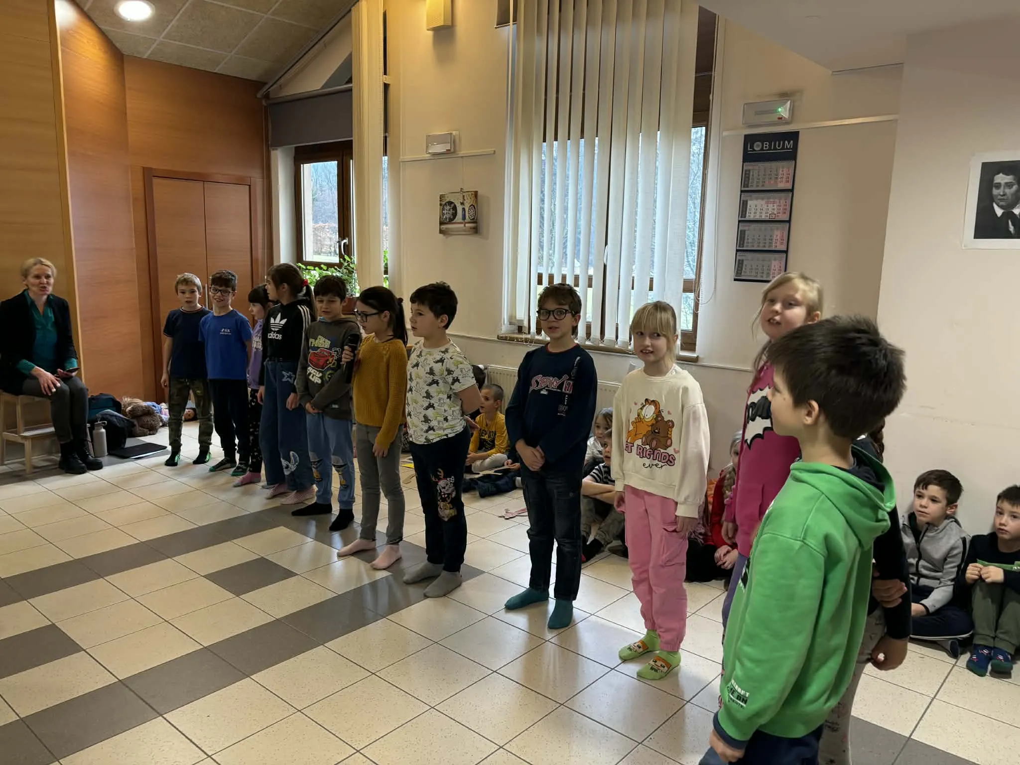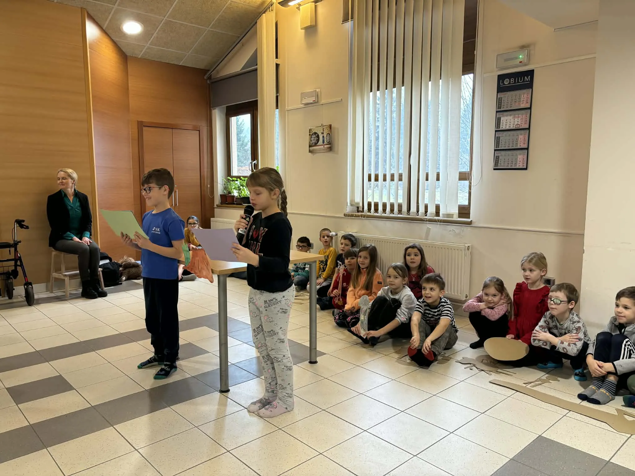 Učenci 1. razreda so nastopili z lutkovno predstavo O zares glasnem strahu, avtorice Aksinje Kermauner. Kasneje so zapeli še tri pesmi, avtorja Janeza Bitenca – Medvedek pleše, Na saneh ter Mravlja in polž.