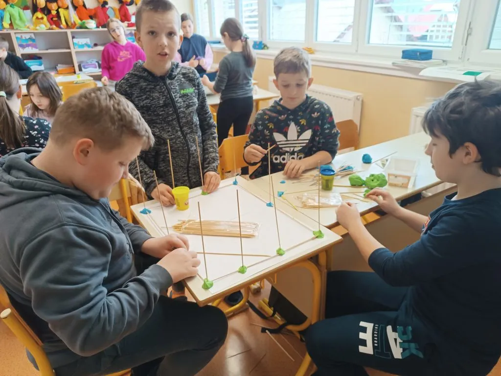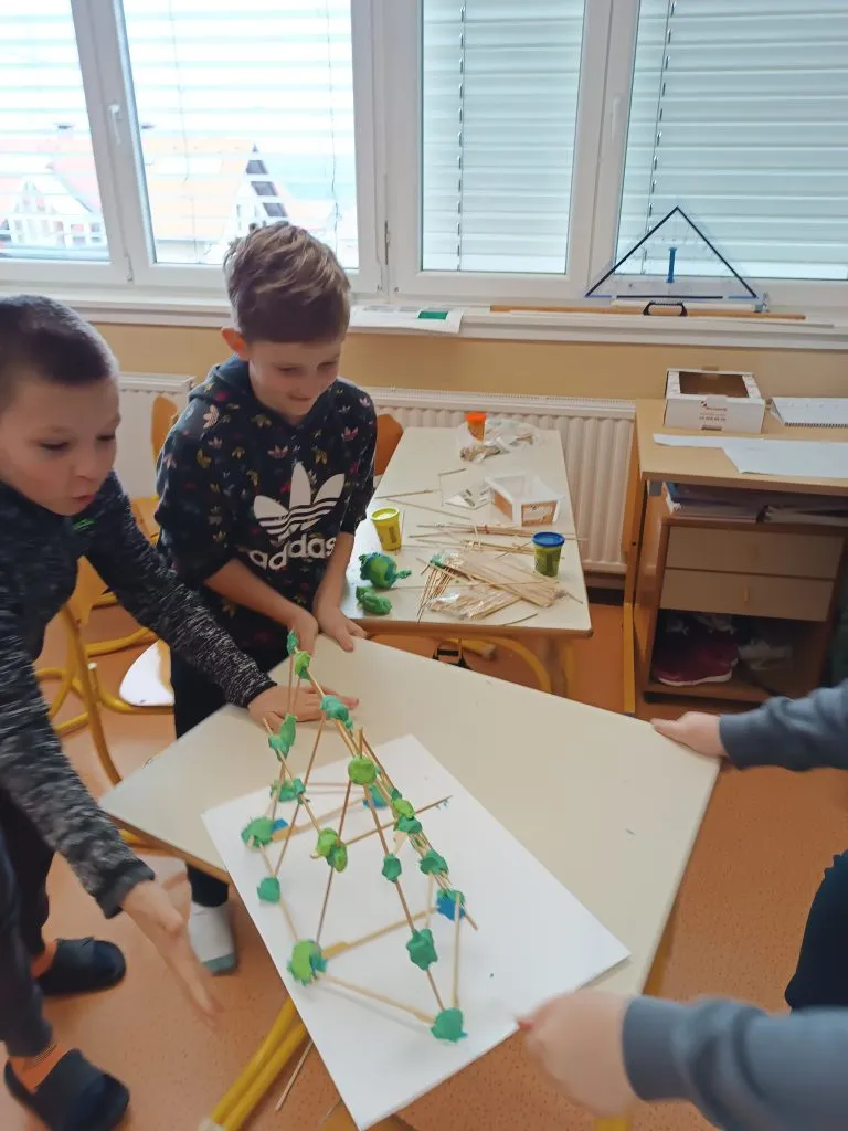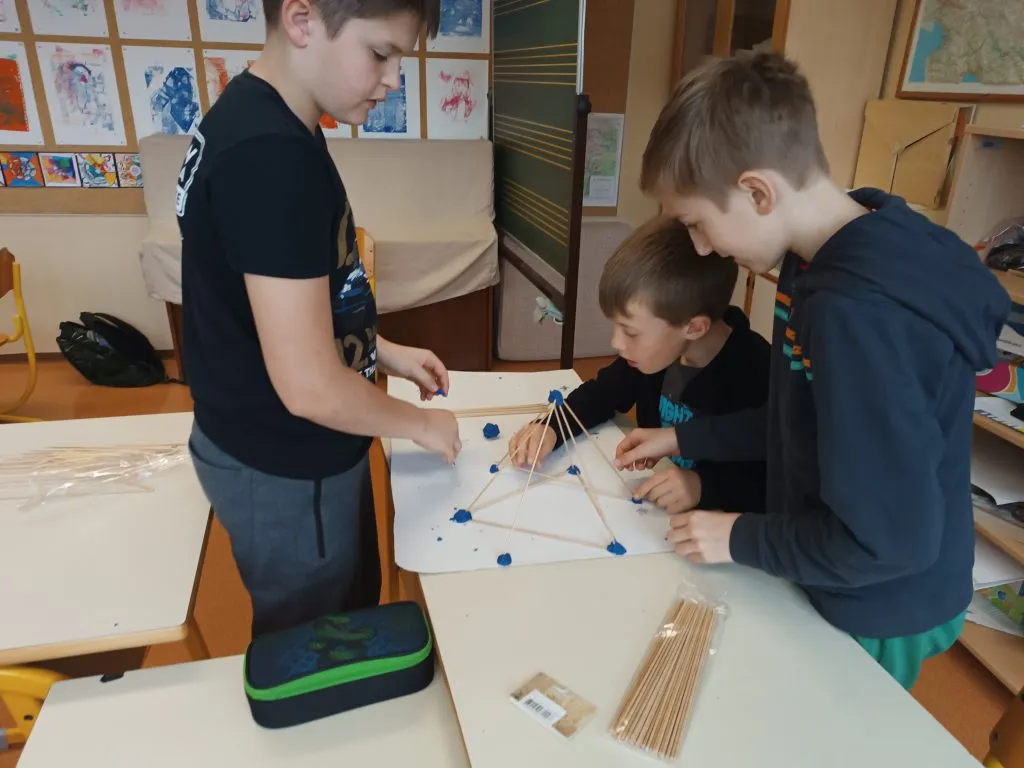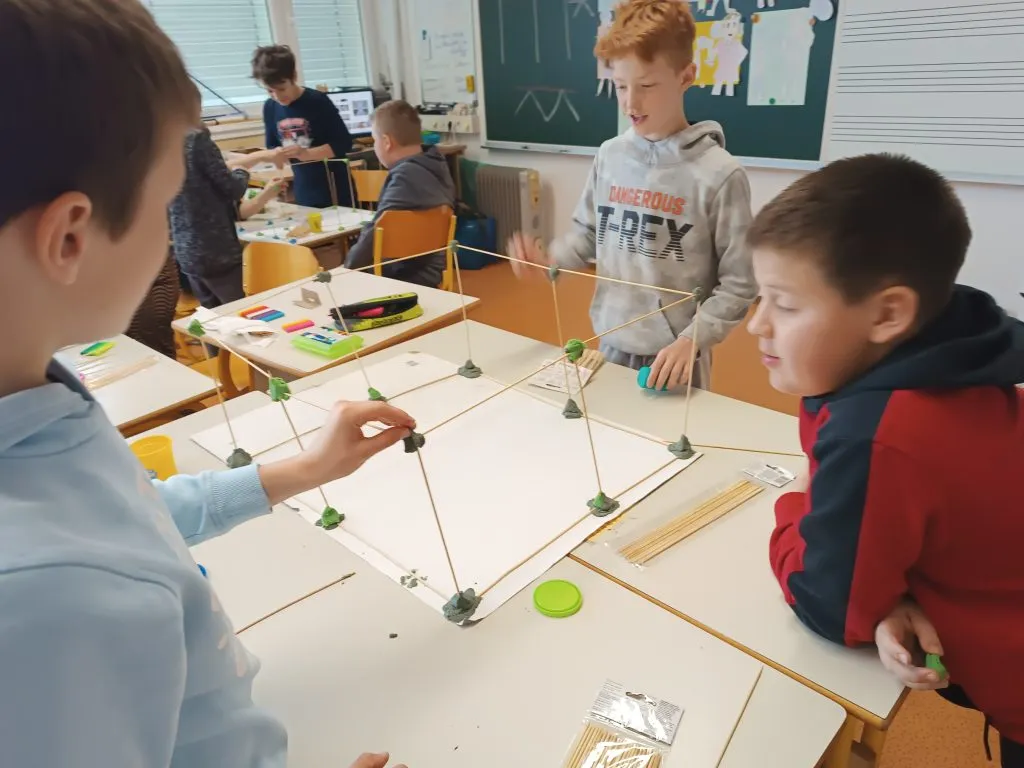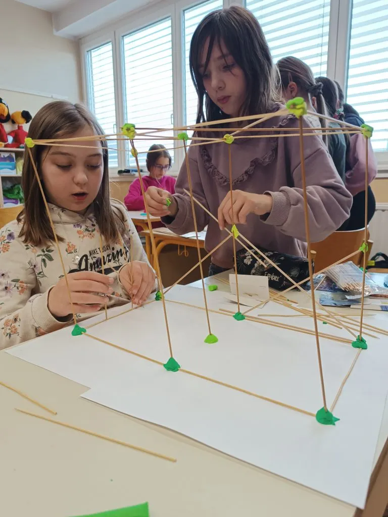 Učenci so ugotovili, da pri gradnji potrebujejo stebre in nosilce in da ni vseeno, kako jih razporedijo v prostor. Začetni poskusi ravne, navpične gradnje so se podrli, a učenci so bili motivirani za gradnjo stabilnejših skulptur. Stabilnost so povečali: z dodajanjem navpičnih stebrov, z dodajanjem poševno nameščenih nosilcev, z gradnjo od širšega dela prosti ožjemu, z ojačanjem kotov ali/in nameščanjem dodatnih nosilcev. Med delom je bilo ključno vprašanje: Kaj bi se najprej podrlo, če bi prišlo do potresa? Učenci so potres z veseljem simulilari in podrte dele zgradb obnovili v stabilnejšo obliko. Ob koncu smo si ogledali še nekaj znanih zgradb, ki so nastale po načrtih slovenskih arhitektov: Jožeta Plečnika, Ivana Vurnika in Maksa Fabianija.