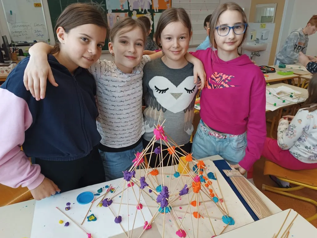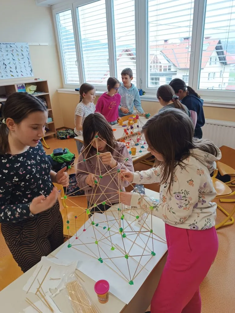 Medpredmetno povezovanje je ena od značilnosti sodobnega pouka. Izpostavlja postopno, procesno učenje ob izvajanju dejavnosti in ima dolgoročne učinke, saj spodbuja doseganje ciljev na višjih nivojih, spodbuja kritično mišljenje, komunikacijo in raziskovanje. Pri pouku matematike so se petošolci lotili učnega sklopa Gometrija. Večina pojmov učenci že poznajo: točka, premica, daljica, ravnina, geometrijski liki in telesa, … Kako pa so ti pojmi med sabo povezani? Kje se pojavljajo in kako vplivajo drug na drugega? – taka vprašanja smo si zastavljali pri urah likovne umetnosti, ob ustvarjanju skeletne gradnje.