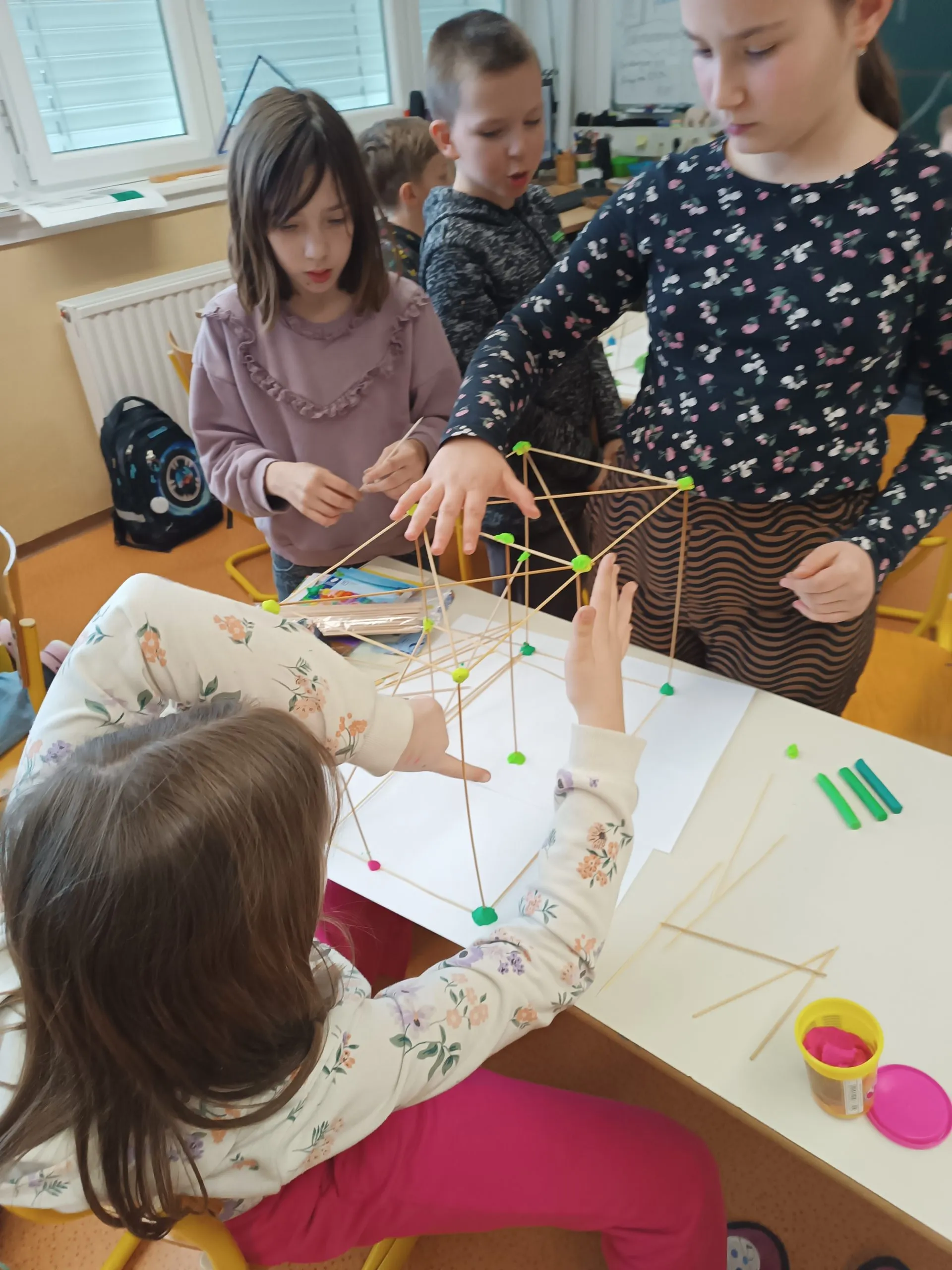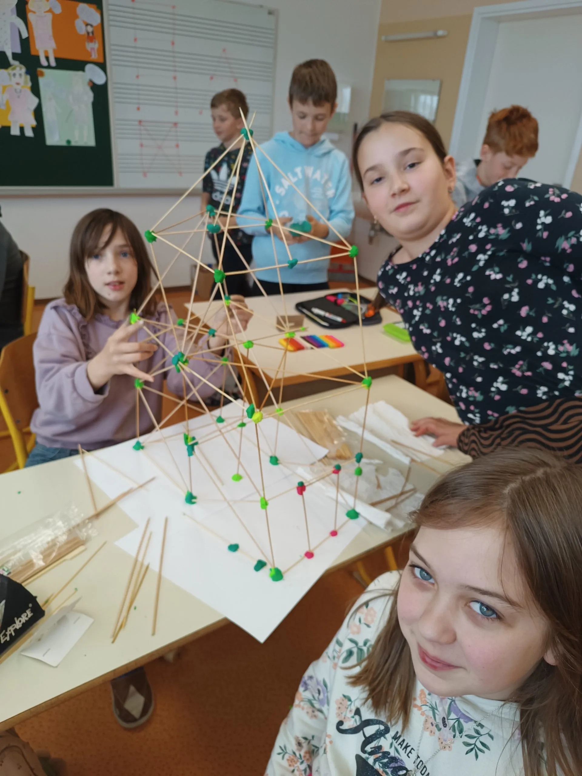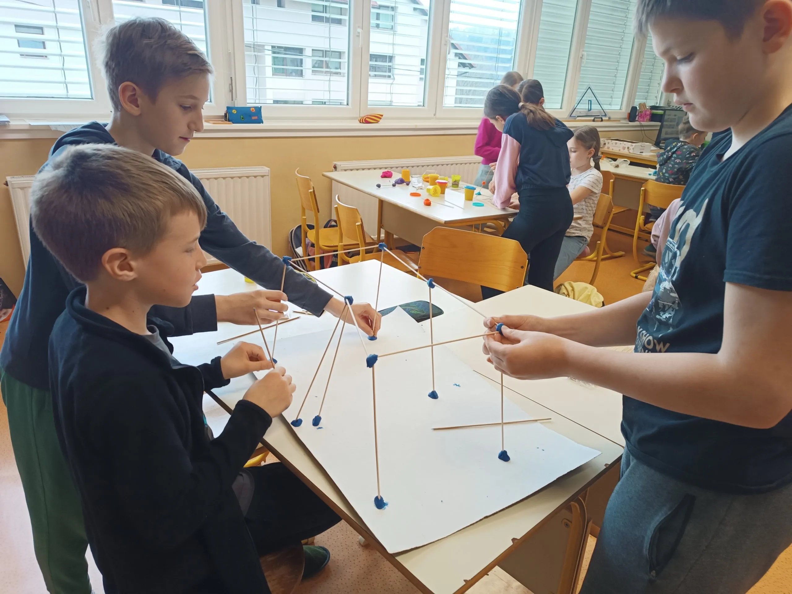 Medpredmetno povezovanje je ena od značilnosti sodobnega pouka. Izpostavlja postopno, procesno učenje ob izvajanju dejavnosti in ima dolgoročne učinke, saj spodbuja doseganje ciljev na višjih nivojih, spodbuja kritično mišljenje, komunikacijo in raziskovanje. Pri pouku matematike so se petošolci lotili učnega sklopa Gometrija. Večina pojmov učenci že poznajo: točka, premica, daljica, ravnina, geometrijski liki in telesa, … Kako pa so ti pojmi med sabo povezani? Kje se pojavljajo in kako vplivajo drug na drugega? – taka vprašanja smo si zastavljali pri urah likovne umetnosti, ob ustvarjanju skeletne gradnje.