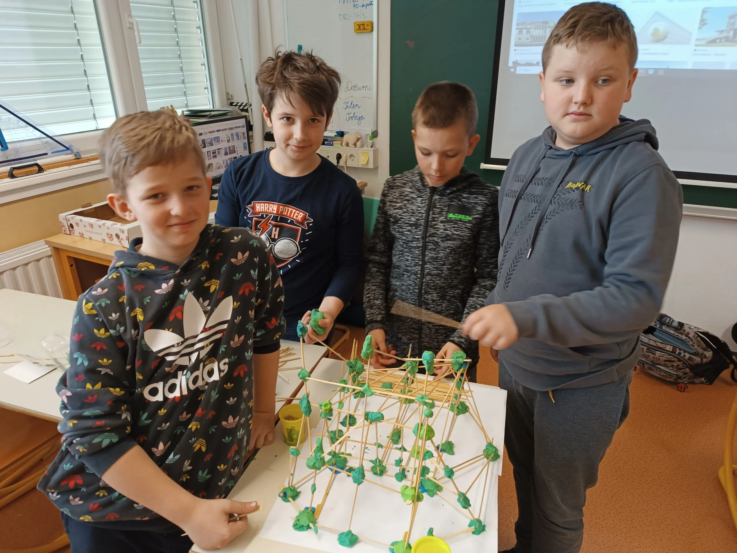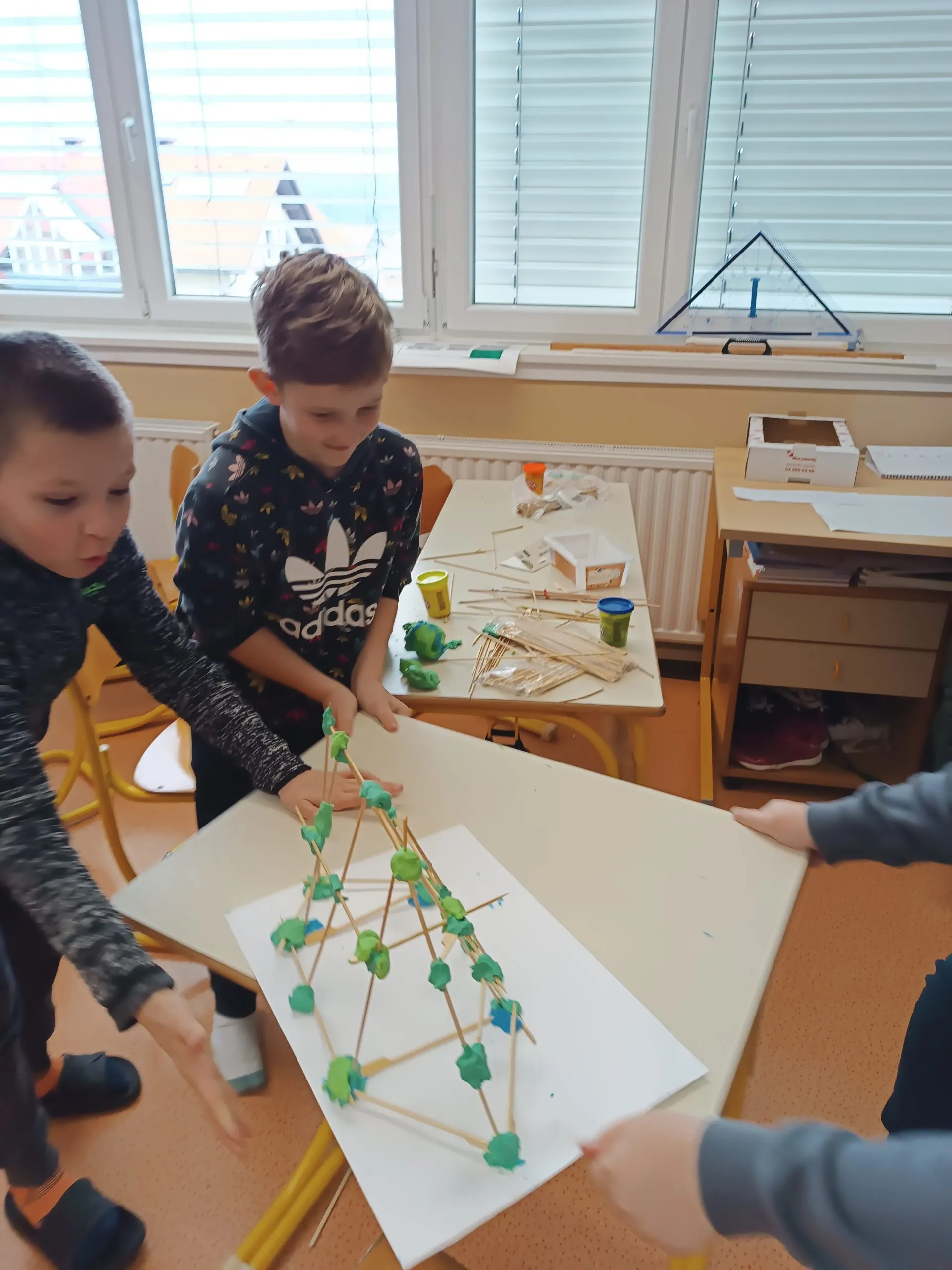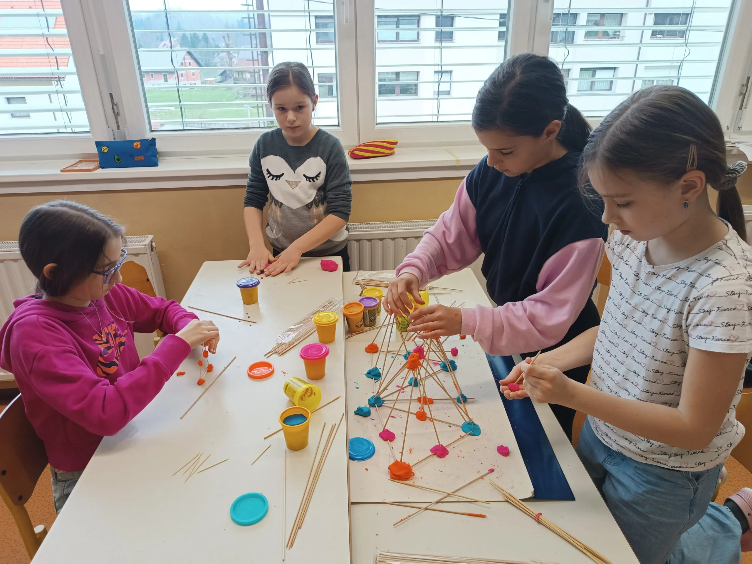 Medpredmetno povezovanje je ena od značilnosti sodobnega pouka. Izpostavlja postopno, procesno učenje ob izvajanju dejavnosti in ima dolgoročne učinke, saj spodbuja doseganje ciljev na višjih nivojih, spodbuja kritično mišljenje, komunikacijo in raziskovanje. Pri pouku matematike so se petošolci lotili učnega sklopa Gometrija. Večina pojmov učenci že poznajo: točka, premica, daljica, ravnina, geometrijski liki in telesa, … Kako pa so ti pojmi med sabo povezani? Kje se pojavljajo in kako vplivajo drug na drugega? – taka vprašanja smo si zastavljali pri urah likovne umetnosti, ob ustvarjanju skeletne gradnje.