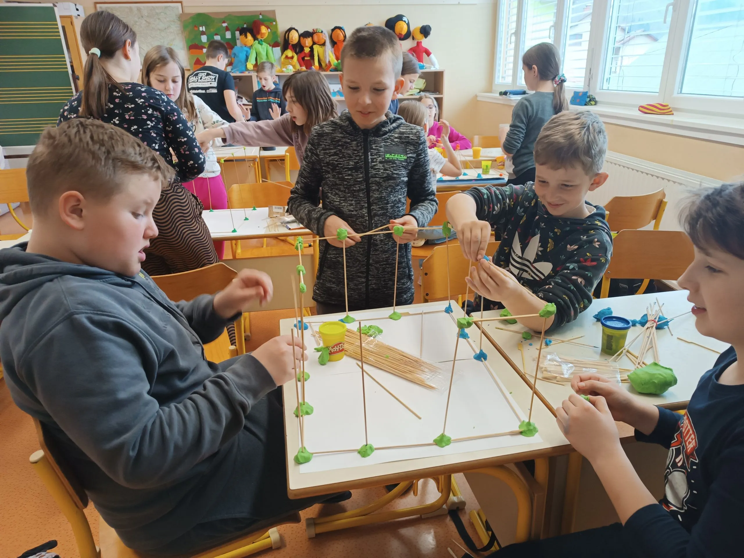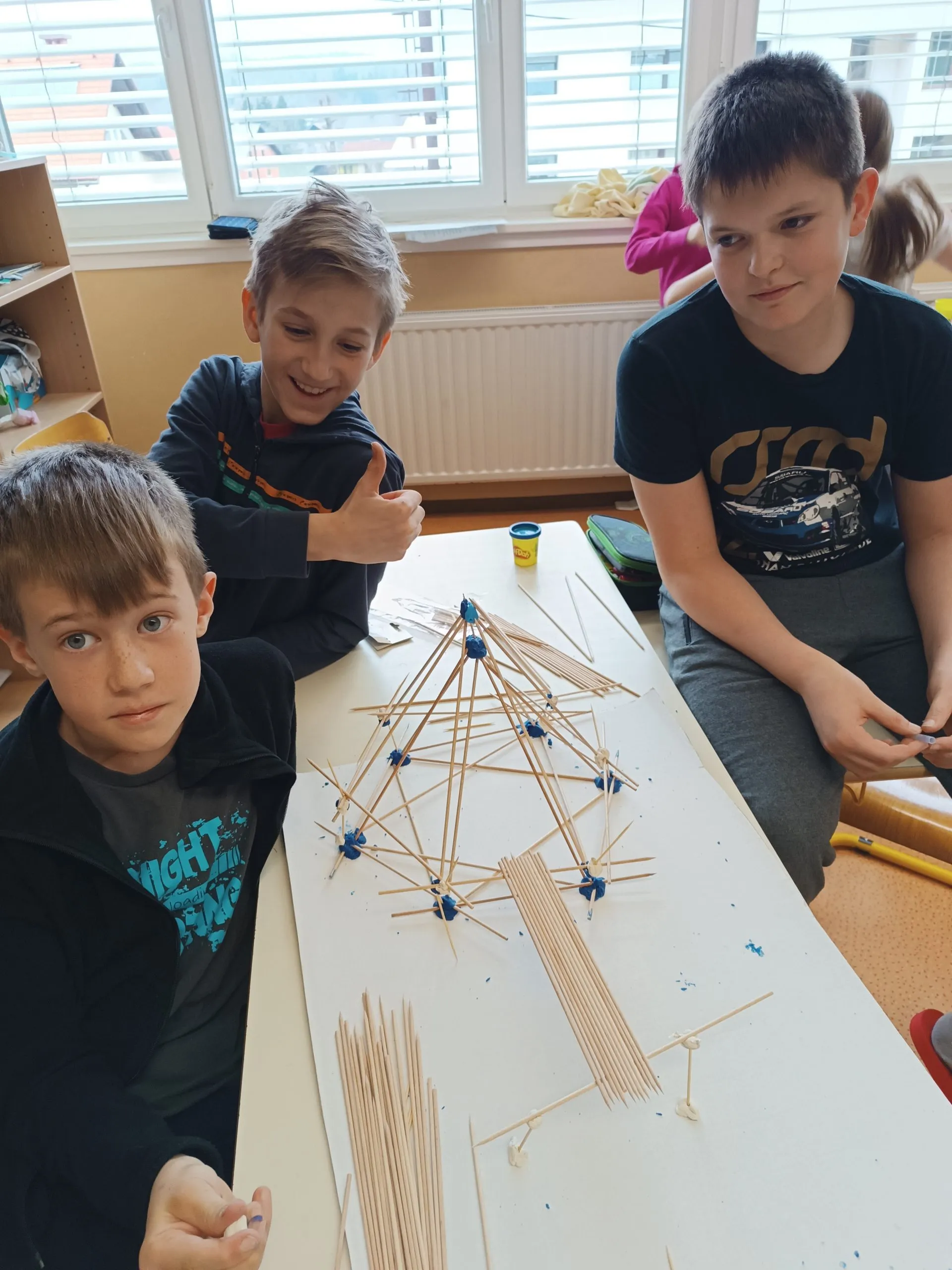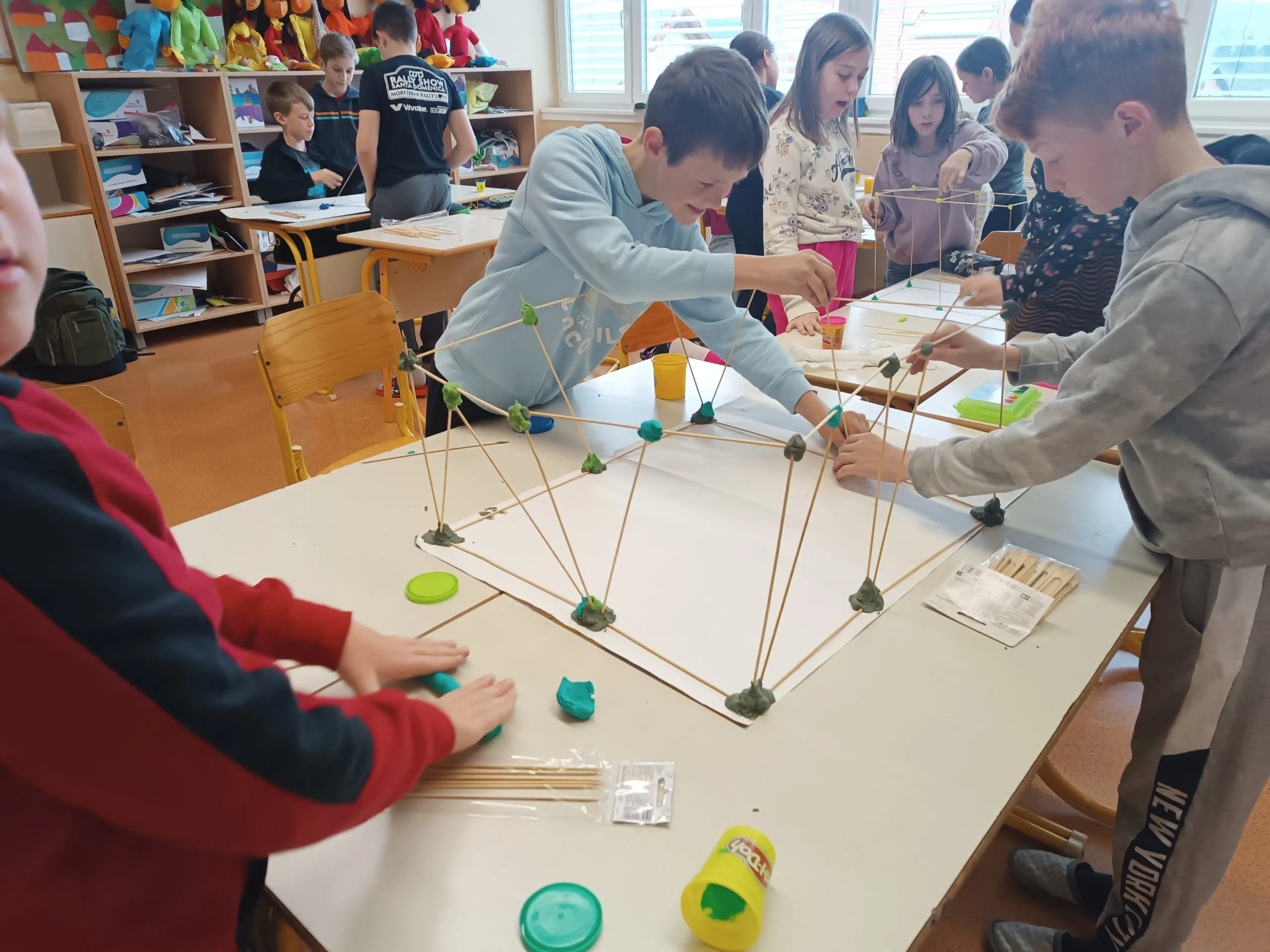 Učenci so ugotovili, da pri gradnji potrebujejo stebre in nosilce in da ni vseeno, kako jih razporedijo v prostor. Začetni poskusi ravne, navpične gradnje so se podrli, a učenci so bili motivirani za gradnjo stabilnejših skulptur. Stabilnost so povečali: z dodajanjem navpičnih stebrov, z dodajanjem poševno nameščenih nosilcev, z gradnjo od širšega dela prosti ožjemu, z ojačanjem kotov ali/in nameščanjem dodatnih nosilcev. Med delom je bilo ključno vprašanje: Kaj bi se najprej podrlo, če bi prišlo do potresa? Učenci so potres z veseljem simulilari in podrte dele zgradb obnovili v stabilnejšo obliko. Ob koncu smo si ogledali še nekaj znanih zgradb, ki so nastale po načrtih slovenskih arhitektov: Jožeta Plečnika, Ivana Vurnika in Maksa Fabianija.