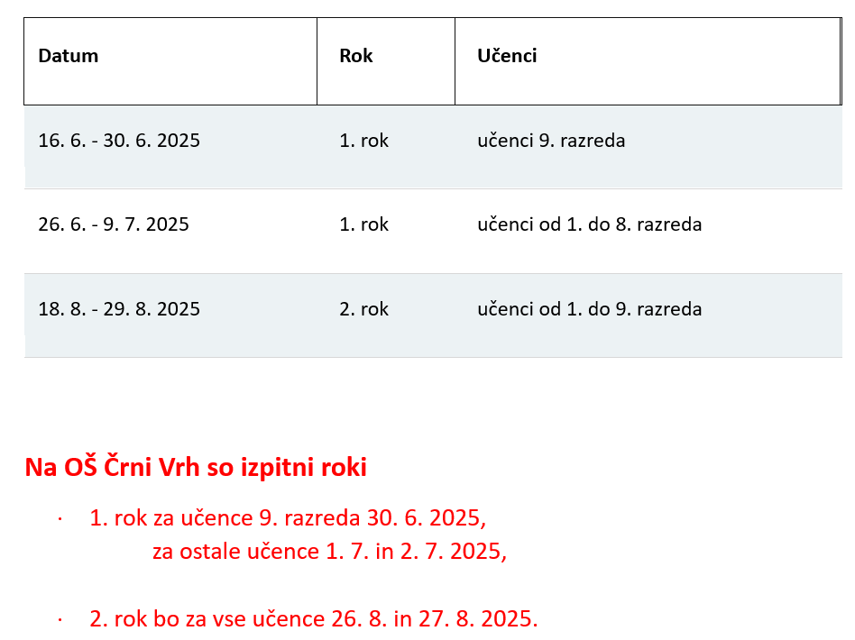 Izpitni roki za predmetne in popravne izpite