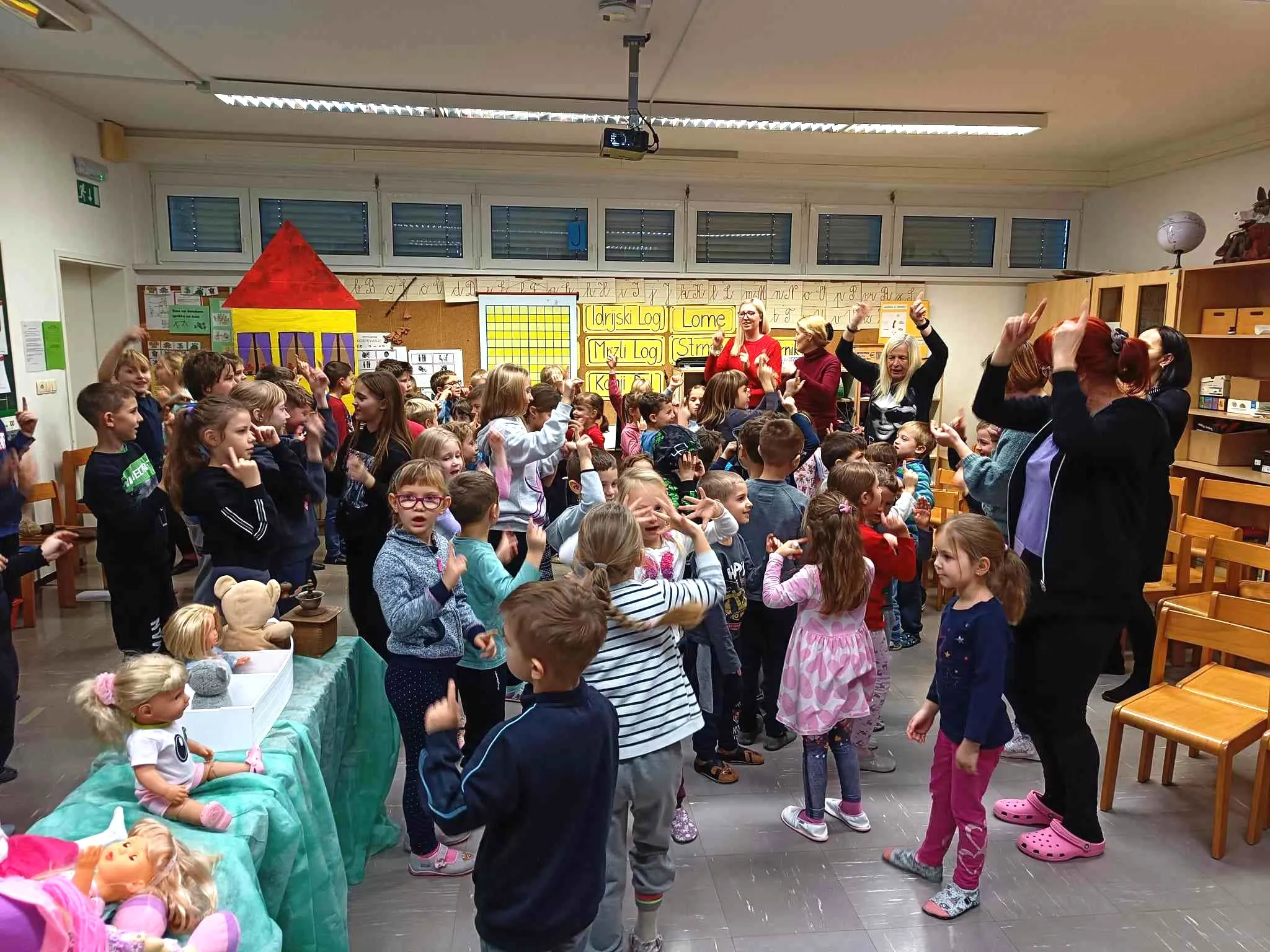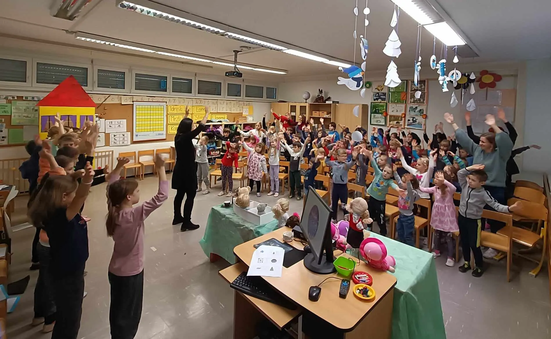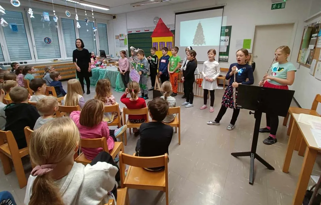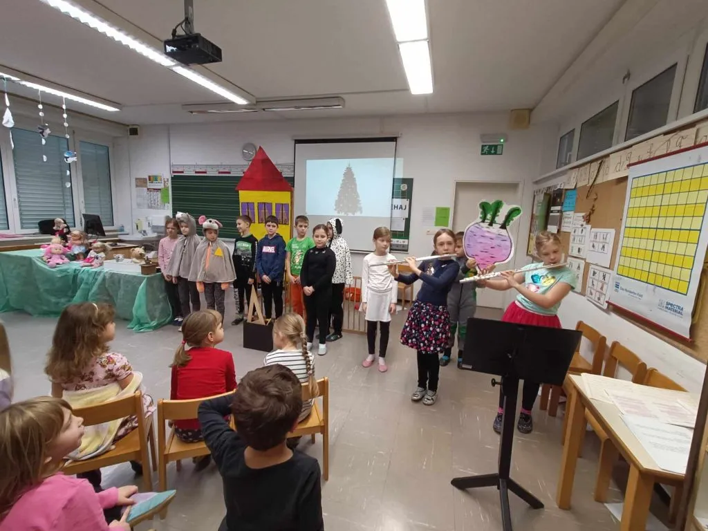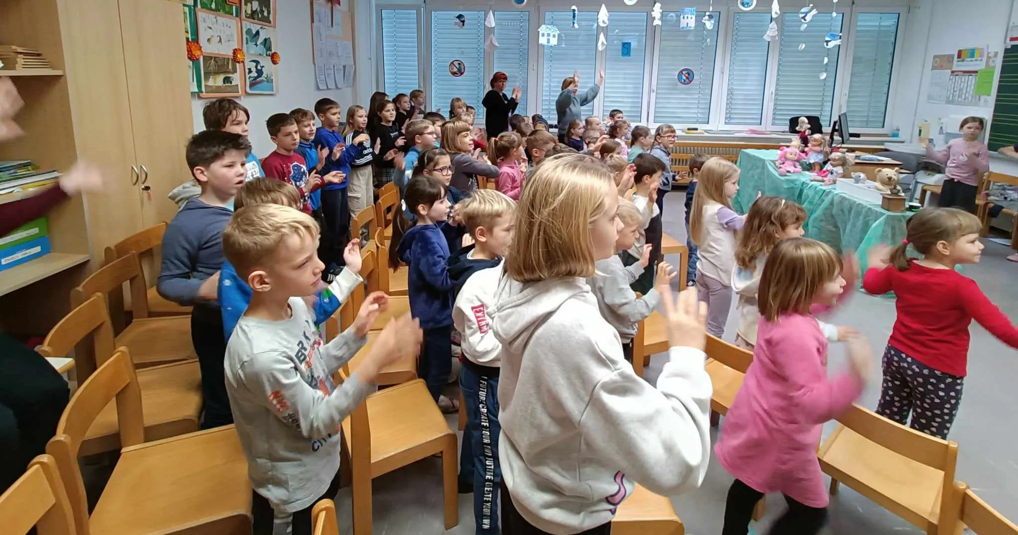 Učenci 1., 2. in 4. razreda ter Konjički iz vrtca so v petek, 20. 12. 2024 del dopoldneva skupaj preživeli v 3. razredu naše šole. Druženje otrok je potekalo igrivo in sproščeno. Tretješolci so se predstavili z glasbeno pravljico Debela repa, z Zlato ladjo pa so vse prisotne odpeljali na potovanje v pravljične dežele, kjer so peli, se spoznavali in plesali. Poglavitna značilnost druženja je bila v interpretaciji pesmi (Jesenska, Pekarne, Zlata ladja, Pustite nam ta svet, Smrečica in Lučke) in glasbene pravljice Debela repa ter v povezovalnem dogajanju. Skozi igro, petje, ples in druženje so se otroci zabavali in učili.