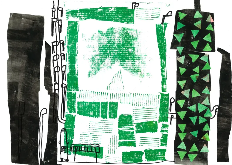 Strokovno komisijo je prepričal z grafiko zelene hišice med temnimi, sivimi mestnimi stavbami, ki so izdelane iz recikliranega kolaža.