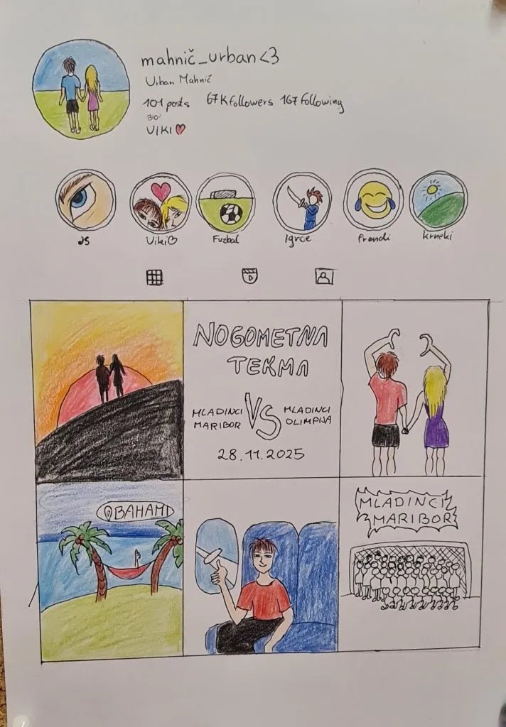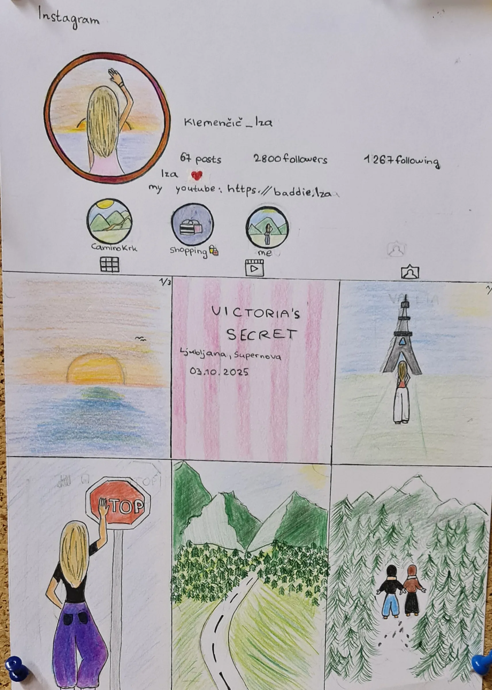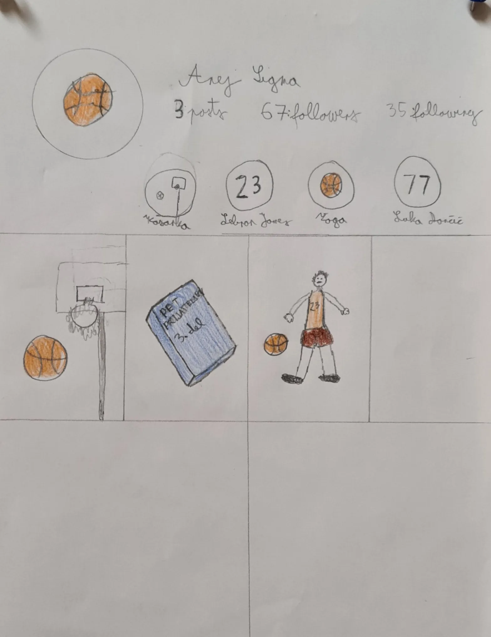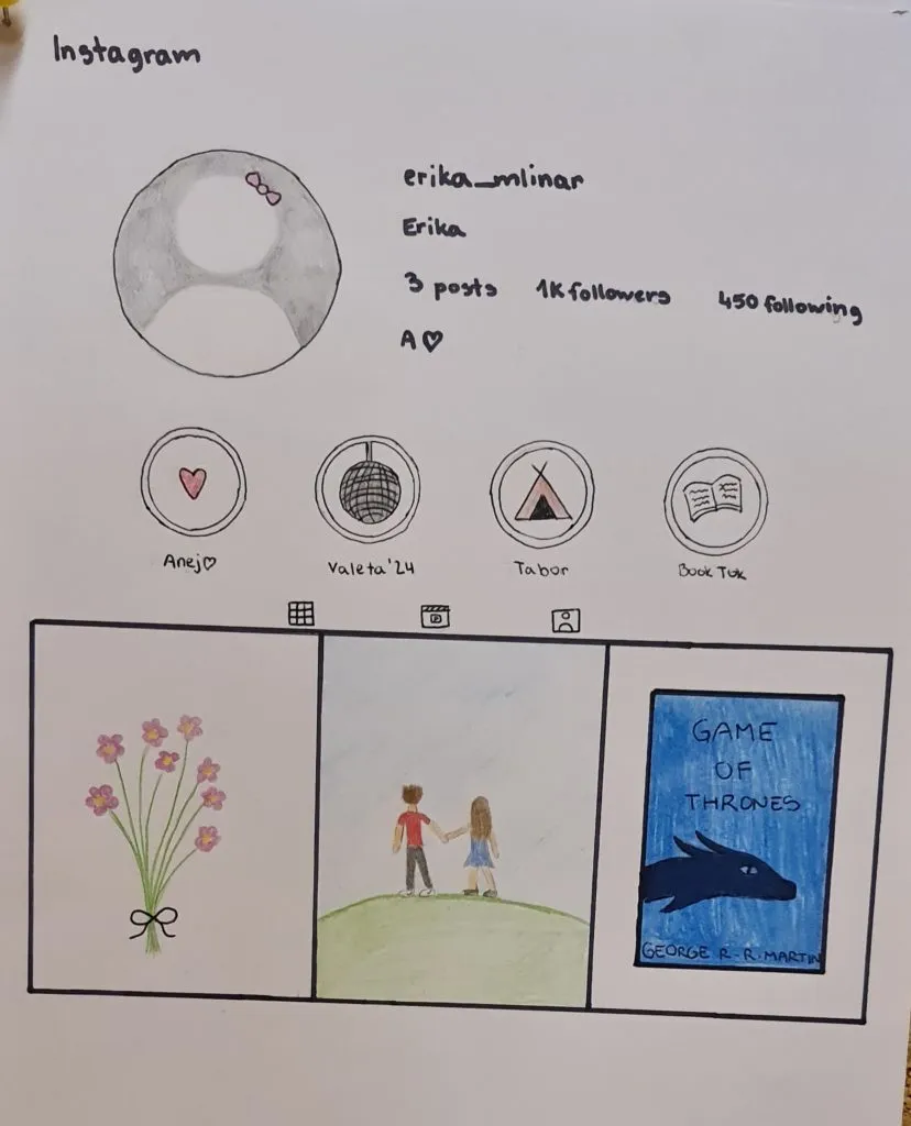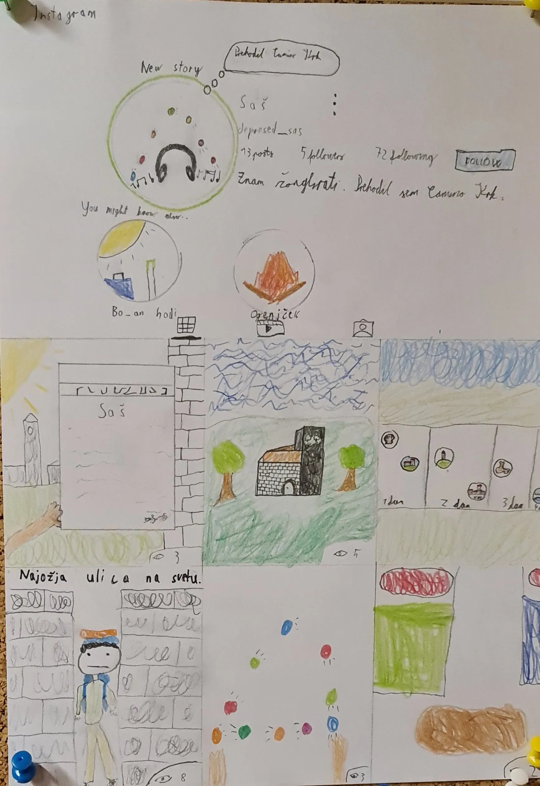 Učence je nato čakal še zadnji del; zaradi nenehnega stika z družabnimi omrežji – tako najstniki v knjigi kot naši otroci v resničnosti – so morali izdelati analogni Instagram profil ene od književnih oseb iz prebranega romana. Nastali so čudoviti izdelki, iz katerih lahko s skoraj nič besedami, a veliko ilustracijami izvemo, kakšni so junaki.
