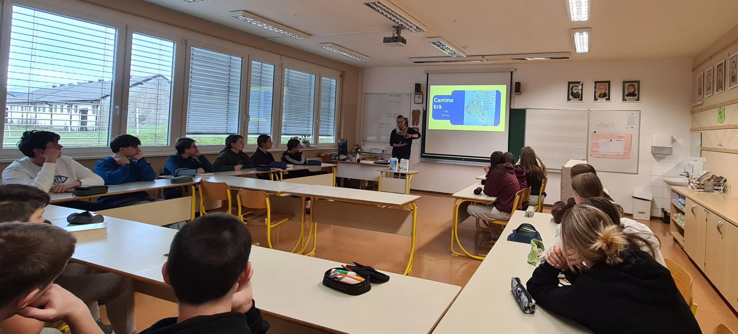 Ker knjiga Vidmarjeve opisuje doživljanje najstnikov na pohodu po Caminu Krk, sem prosila sodelavko, go. Fajdiga, da nam v sliki in besedi predstavi svojo pot, ki jo je prehodila nekaj časa nazaj. Tako so si učenci lažje predstavljali, kako pot izgleda in kaj te na njej čaka. S seboj je prinesla tudi knjižnico z žigi, ki jih je zbirala na poti, zemljevid poti in Jakobovo školjko. Polurna predstavitev je minila, kot bi mignil.