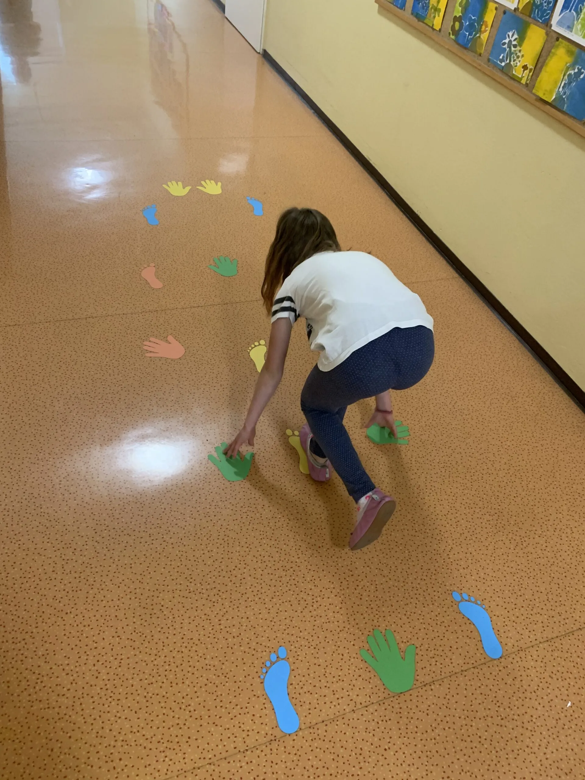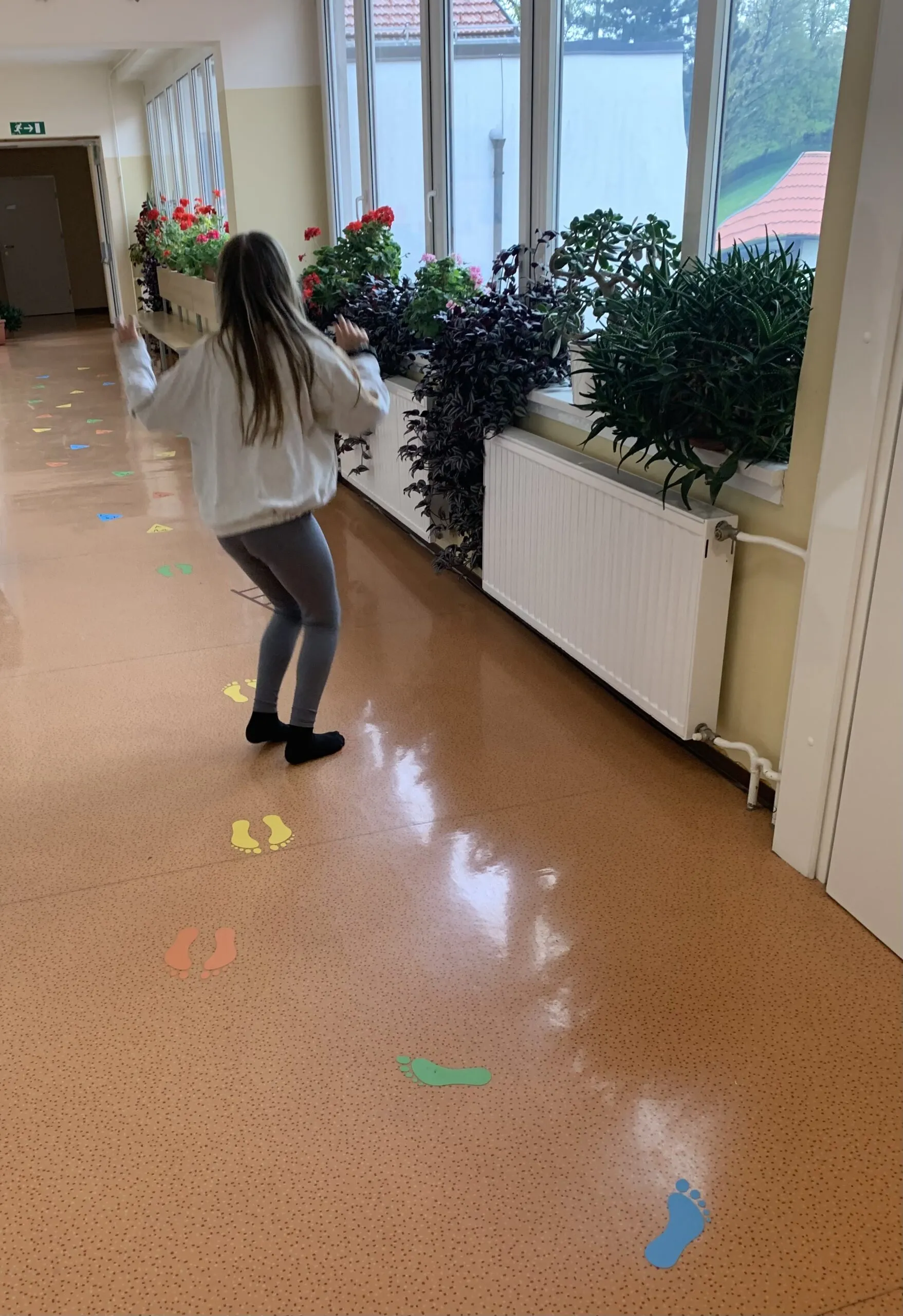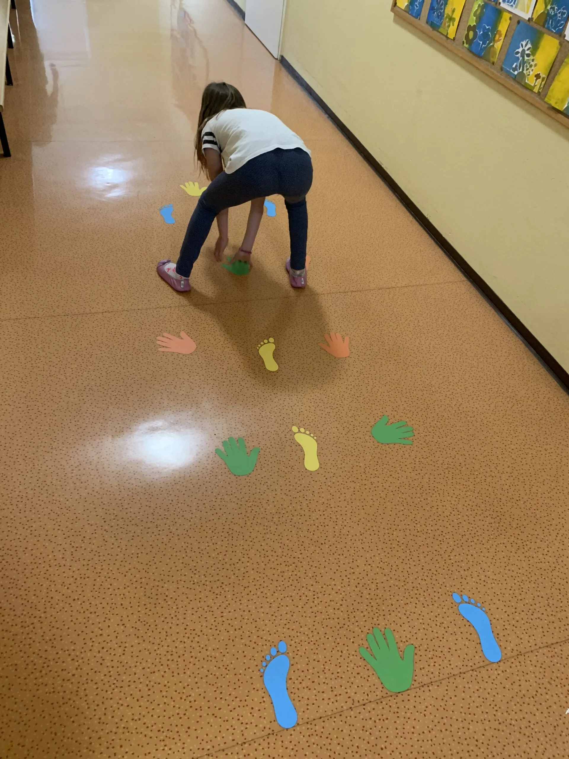 Naša motorična pot je sestavljena iz več delov, na eni strani je »twister«, ki lahko postane tudi 4 v vrsto ali prikaz. Sledi mu gibanje po prstih ali rokicah, nato pa je potrebno najdi zaporedje števil ali pa utrjujemo barve. Preden pa na smrečicah utrjujemo abecedo, se zavrtimo in preizkušamo ravnotežje s poskakovanjem po stopinjah. Na drugem koncu hodnika utrjujemo znanje teles in likov ter osnovnih geometrijskih pojmov.
