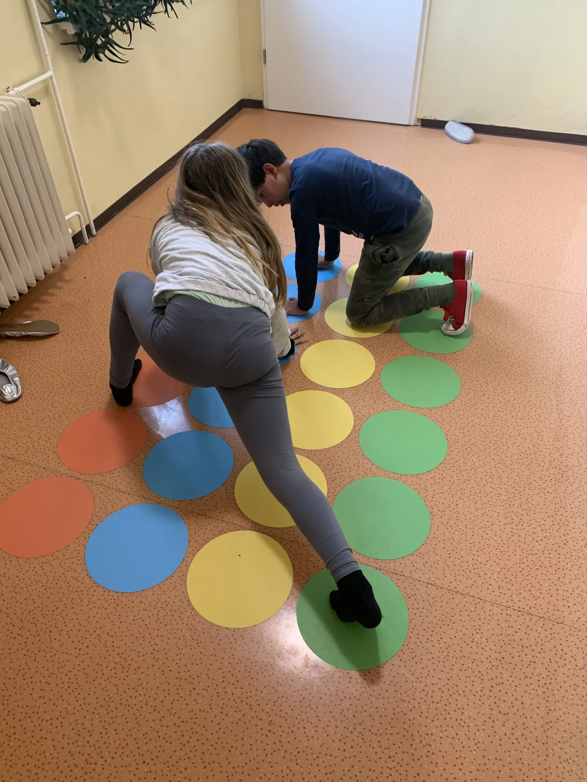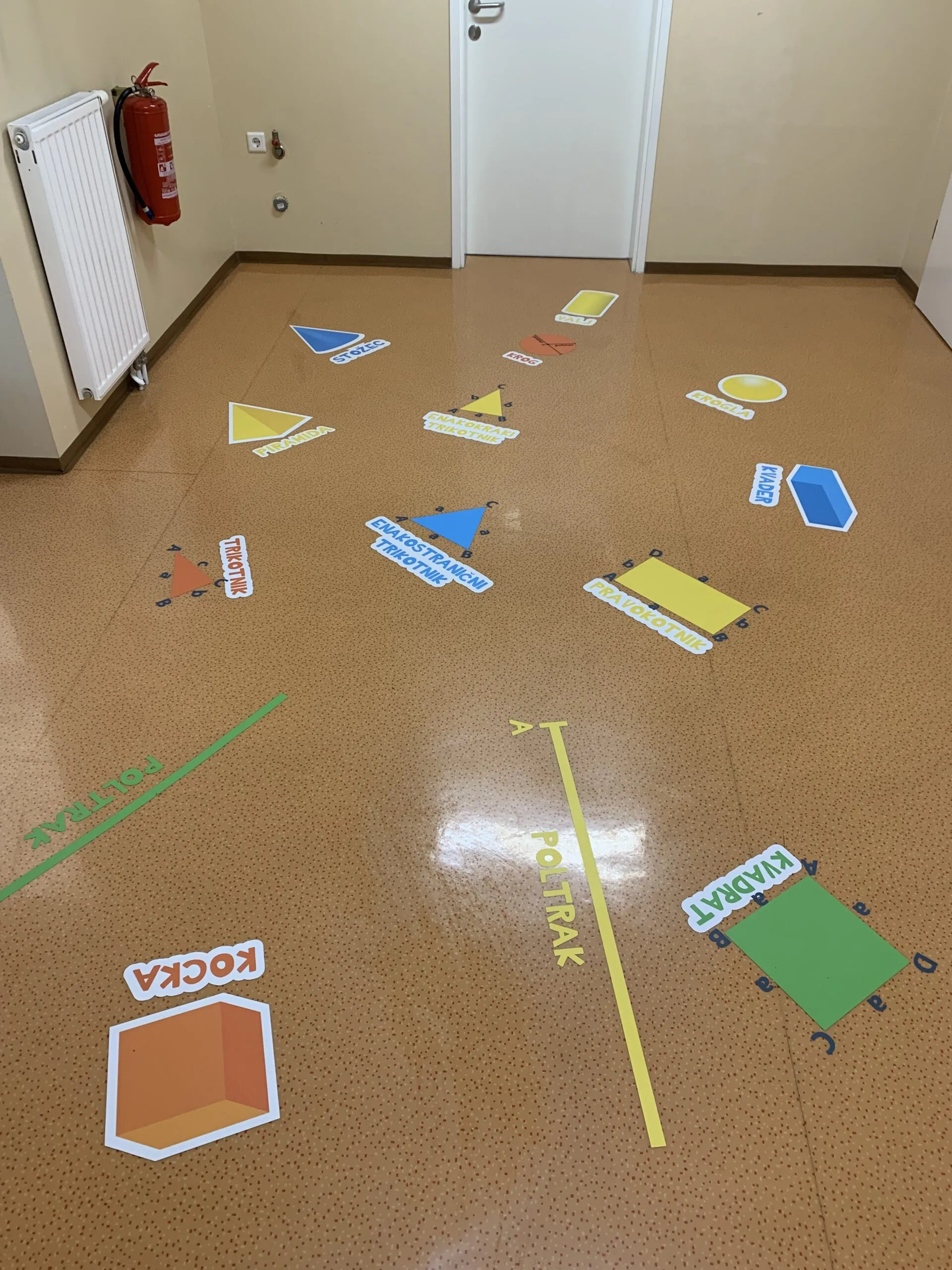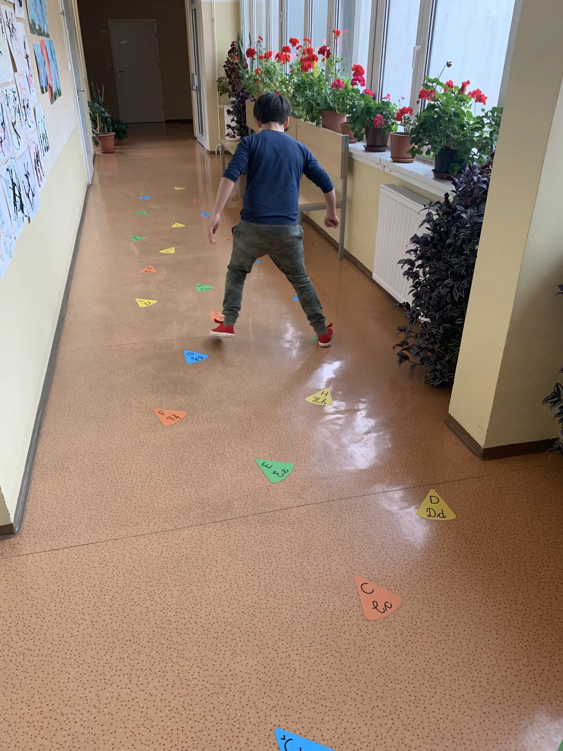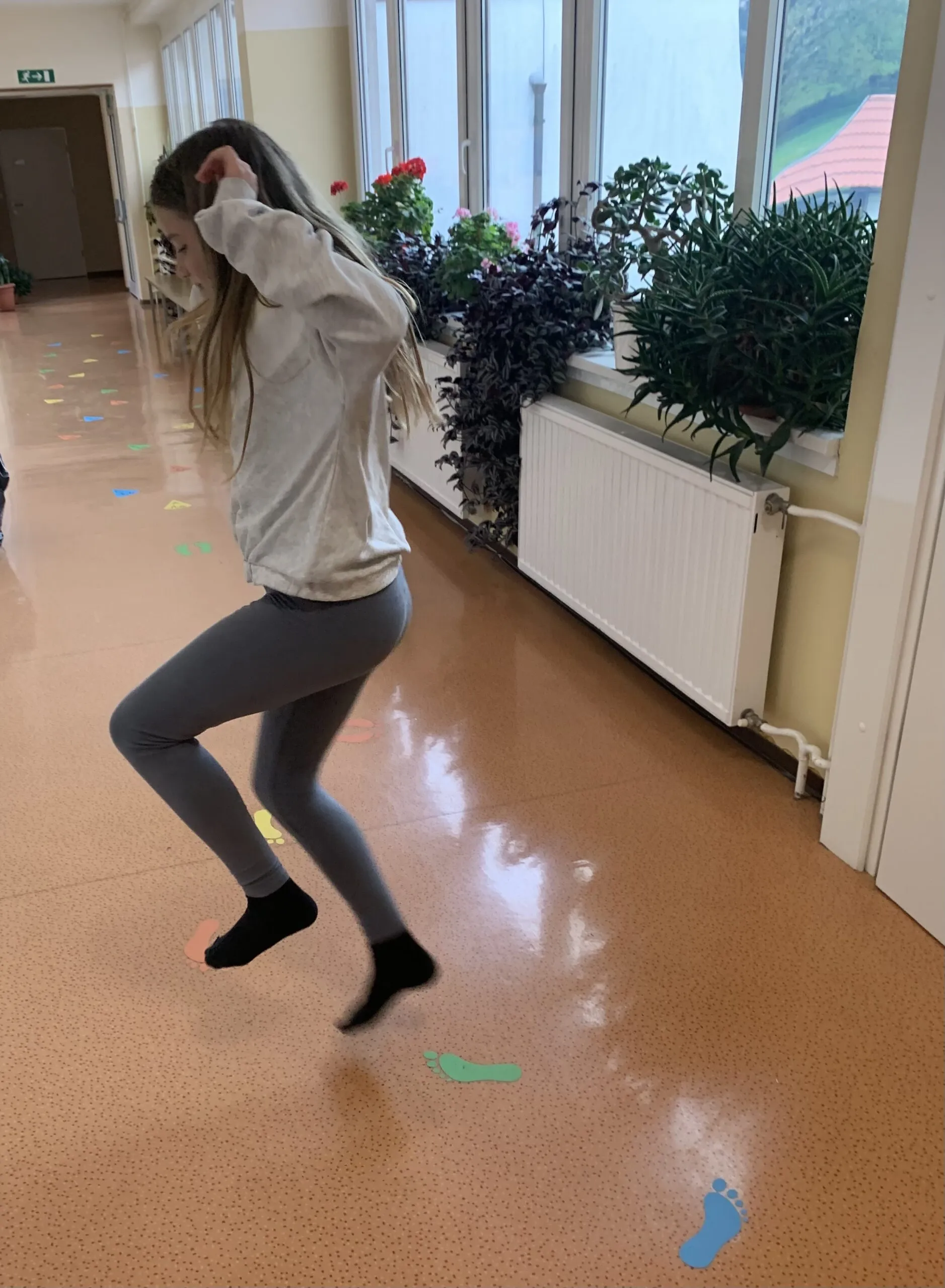 Naša motorična pot je sestavljena iz več delov, na eni strani je »twister«, ki lahko postane tudi 4 v vrsto ali prikaz. Sledi mu gibanje po prstih ali rokicah, nato pa je potrebno najdi zaporedje števil ali pa utrjujemo barve. Preden pa na smrečicah utrjujemo abecedo, se zavrtimo in preizkušamo ravnotežje s poskakovanjem po stopinjah. Na drugem koncu hodnika utrjujemo znanje teles in likov ter osnovnih geometrijskih pojmov.