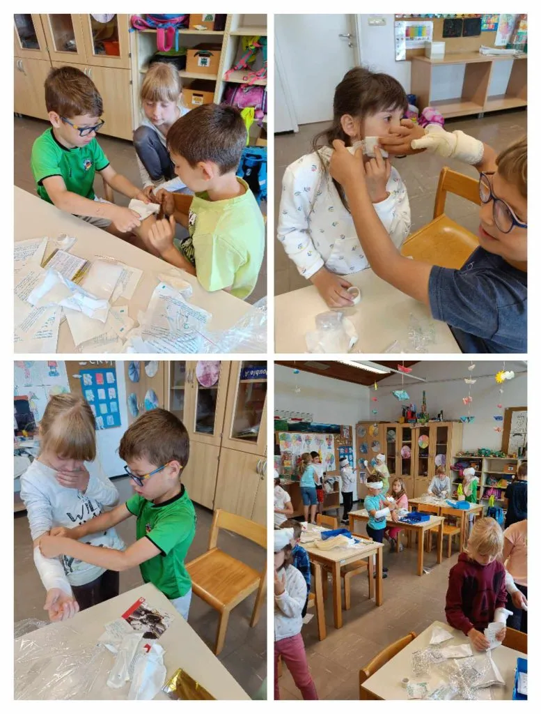V parih in skupinah so pregledali škatle prve pomoči ter se samostojno obvezali.