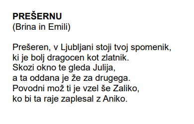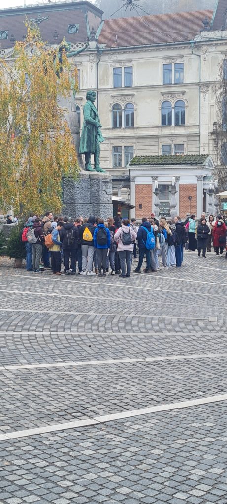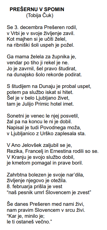 Najprej smo obiskali Ljubljano, kjer smo na »Prešercu« spoznali oba naša vodiča – Uršo in Urbana. Razdelila sta nas v dve skupini in tako smo si v dveh urah ogledali vse pomembnejše kraje v Ljubljani, ki so povezani s Prešernovim življenjem. Po končanem ogledu smo se z avtobusom odpeljali v Kranj, kjer smo obiskali Prešernovo stanovanje in delovno mesto, ki sta sedaj preurejena v muzej, ter Prešernov gaj, kraj, kjer sta pokopana on in njegova druga hči, Ernestina. Na tem mestu smo izvedli tudi recitacije pesmi, ki smo jih napisali med vožnjo proti Kranju. Dve sta se nam najbolj vtisnili v spomin, zato vam jih predlagamo v branje.