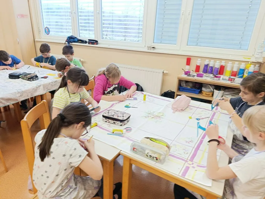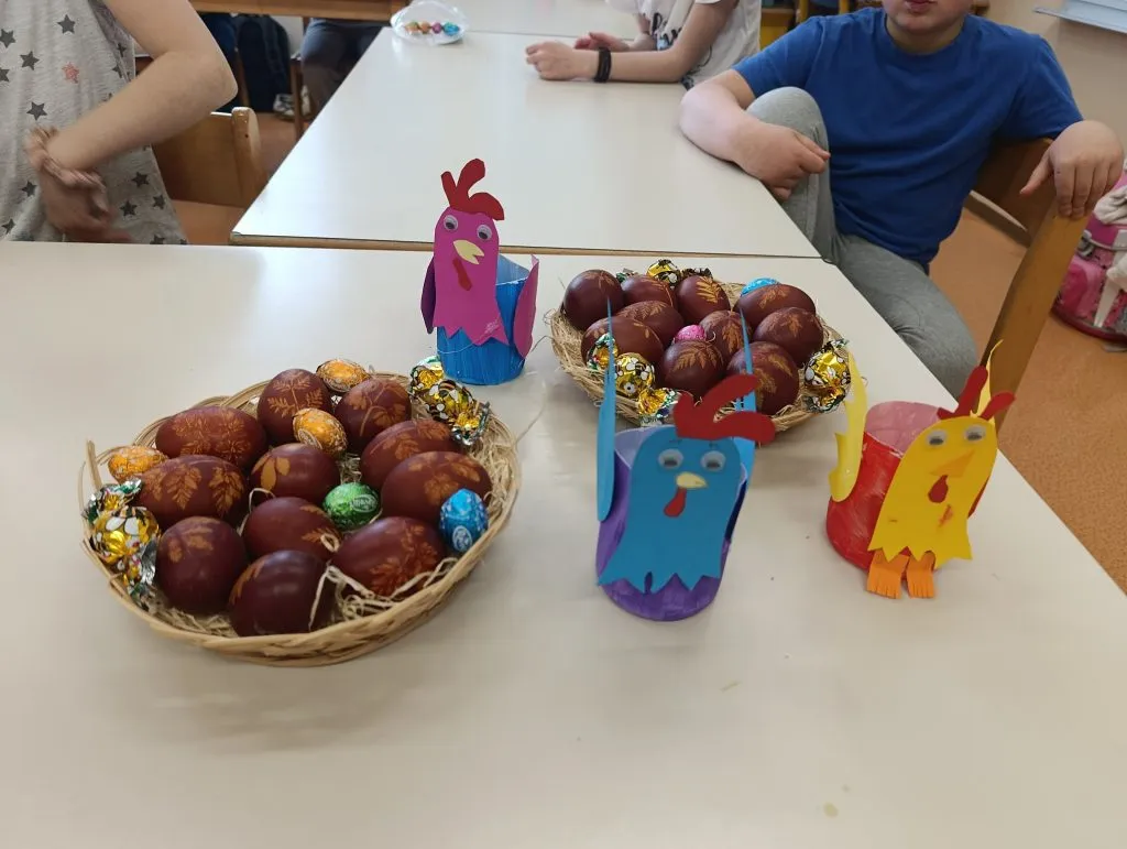 Ob koncu ustvarjalnega dne je učiteljica vanje v znak pohvale nasula čokoladne pirhe, kar je učence še posebej razveselilo.