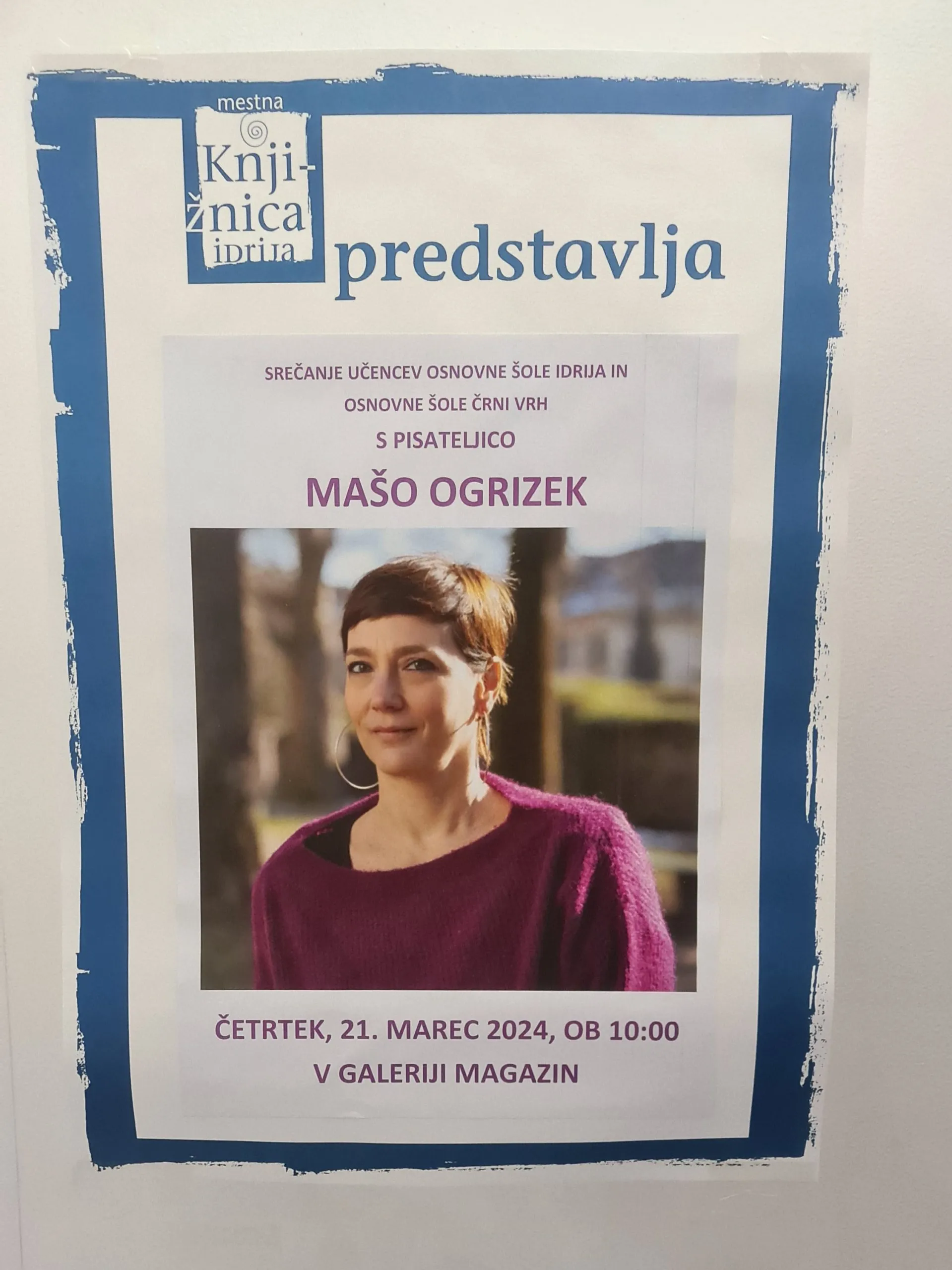 Na povabilo smo se odzvali tudi na naši šoli in se skupaj z nekaterimi učenci odpravili na srečanje s pisateljico Mašo Ogrizek. Ta nas je skozi sproščen pogovor z moderatorko, go. Trušnovec, popeljala po svojem literarnem opusu in povedala, da se ji je začelo »dogajati«, ko je objavila knjigo Gospa s klobukom. Zanjo je prejela tudi nagrado večernica za najboljše mladinsko leposlovno delo. Njena pisateljska pot se je strmo vzpenjala in letos dosegla vrhunec, ko so njeno knjigo Lisičja luna izbrali za Cankarjevo tekmovanje za 6. in 7. razred in ji podelili tudi nekaj nagrad. Ob koncu srečanja je prijazno in z nasmeškom na obrazu odgovarjala na številna radovedna vprašanja mladih nadobudnežev ter se poslovila z napovedjo, da že piše nadaljevanje Lisičje lune.