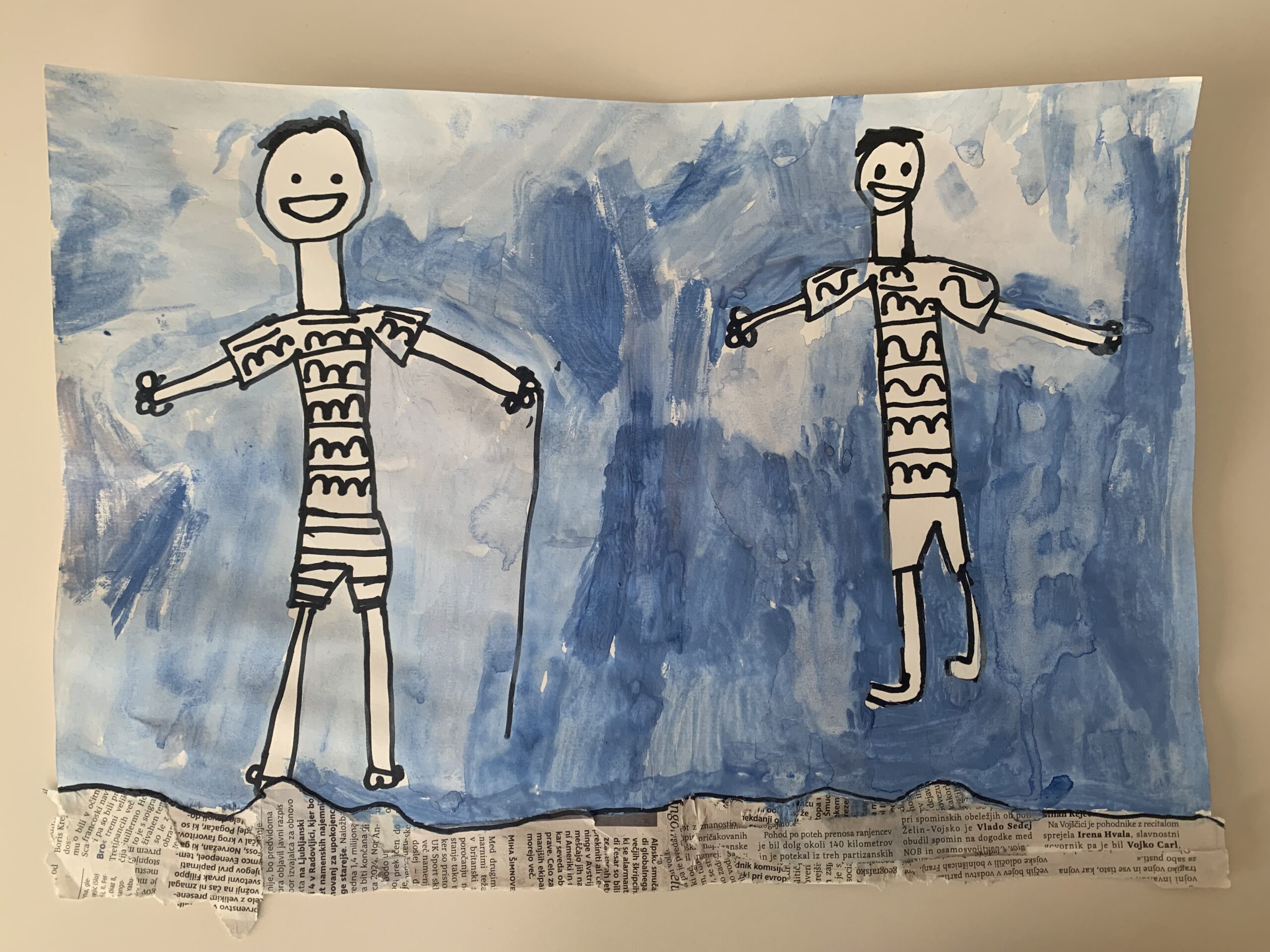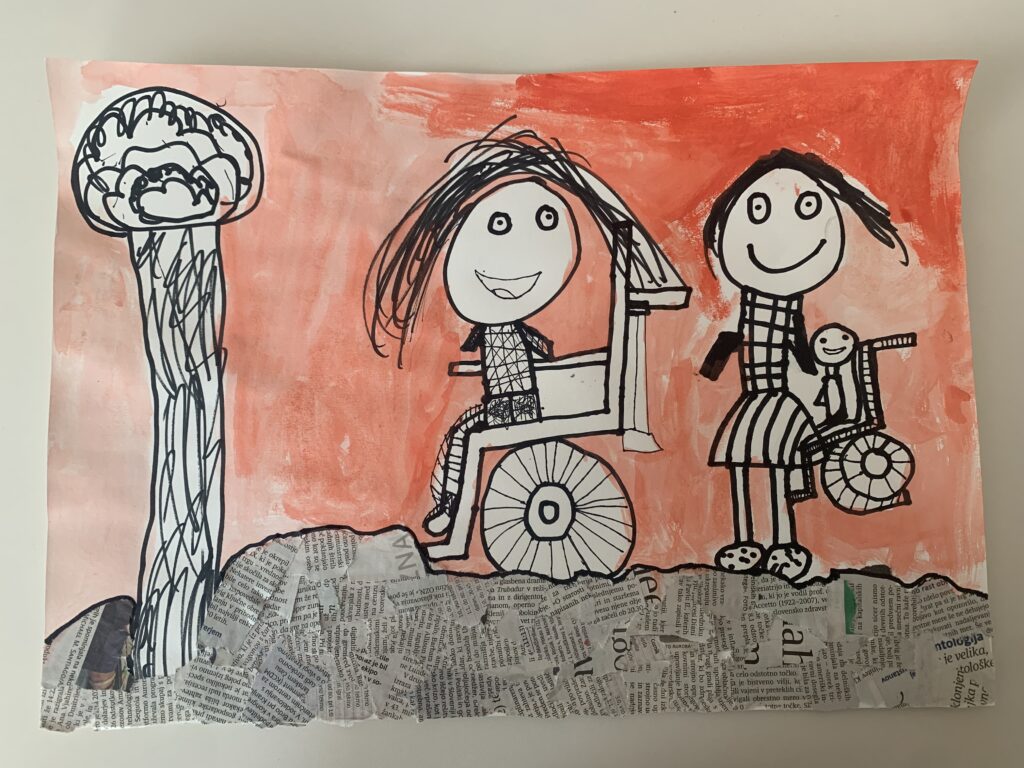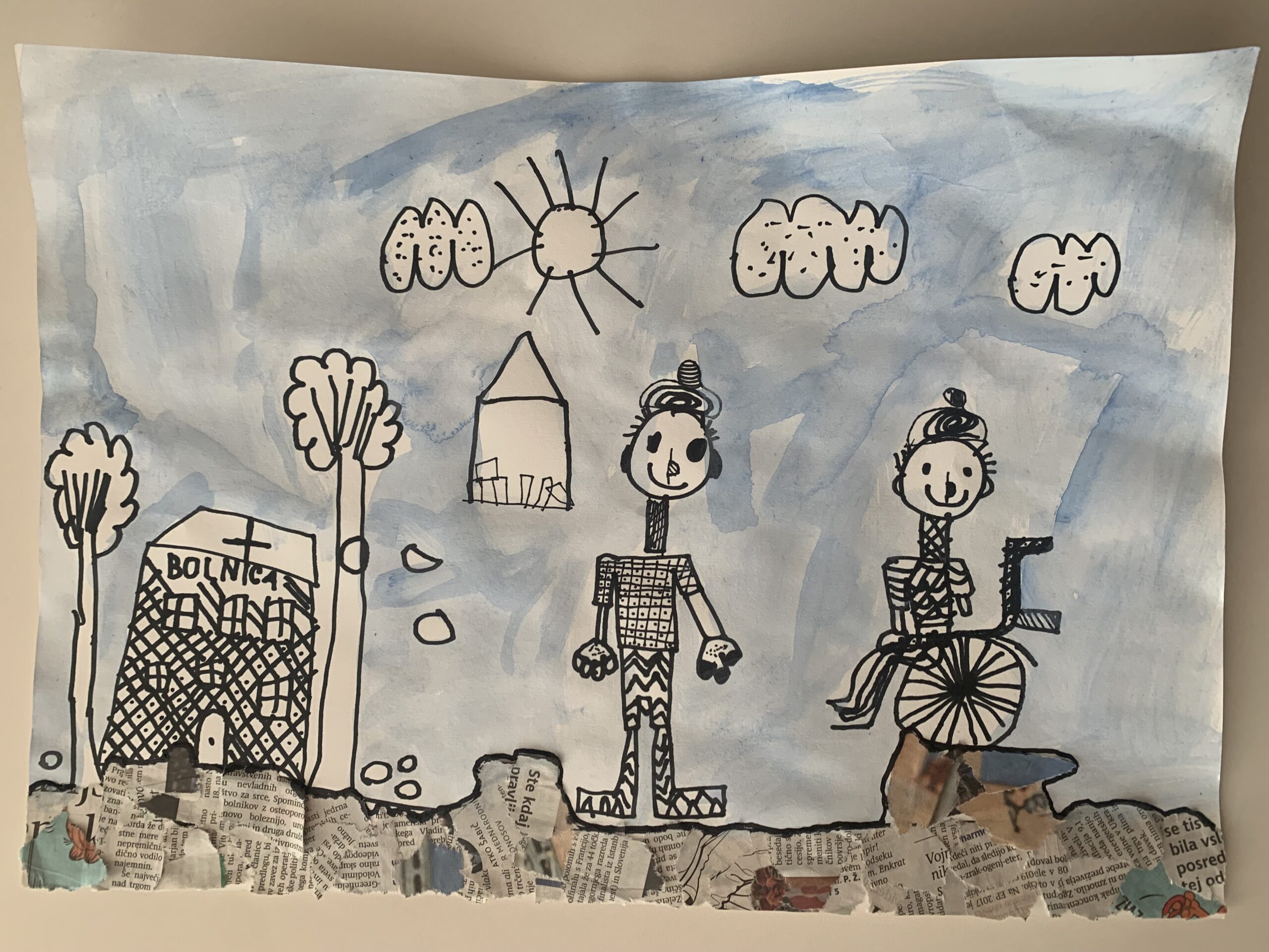 Uprava Republike Slovenije za zaščito in reševanje je v šolskem letu 2022/2023 razpisala natečaj »Naravne in druge nesreče – Pomoč potrebujemo vsi.«Naravne in druge nesreče se dogajajo vsakodnevno. Ob naravnih in drugih nesrečah nam pomagajo reševalci, pa tudi vsak posameznik po svojih močeh in sposobnostih. V letošnjem natečaju smo poseben poudarek posvetili invalidom, ki živijo, se šolajo in delajo med nami. Invalidi zaradi različnih oblik invalidnosti ob naravnih in drugih nesrečah potrebujejo dodatno pomoč. Pri pouku smo se pogovarjali o katastrofalnem potresu v Turčiji. Prvošolci so nato v mesecu februarju ustvarjali likovne izdelke na temo Pomoč potrebujemo vsi. Pri ustvarjanju so uporabili kombinacijo različnih likovnih tehnik. Najprej so natrgali in prilepili koščke časopisnega papirja, ki so predstavljali ruševine. Nato so s črnim flomastrom narisali otroke, ki pomagajo invalidnim otrokom. Na koncu pa so z izbrano barvo pobarvali še ozadje.
