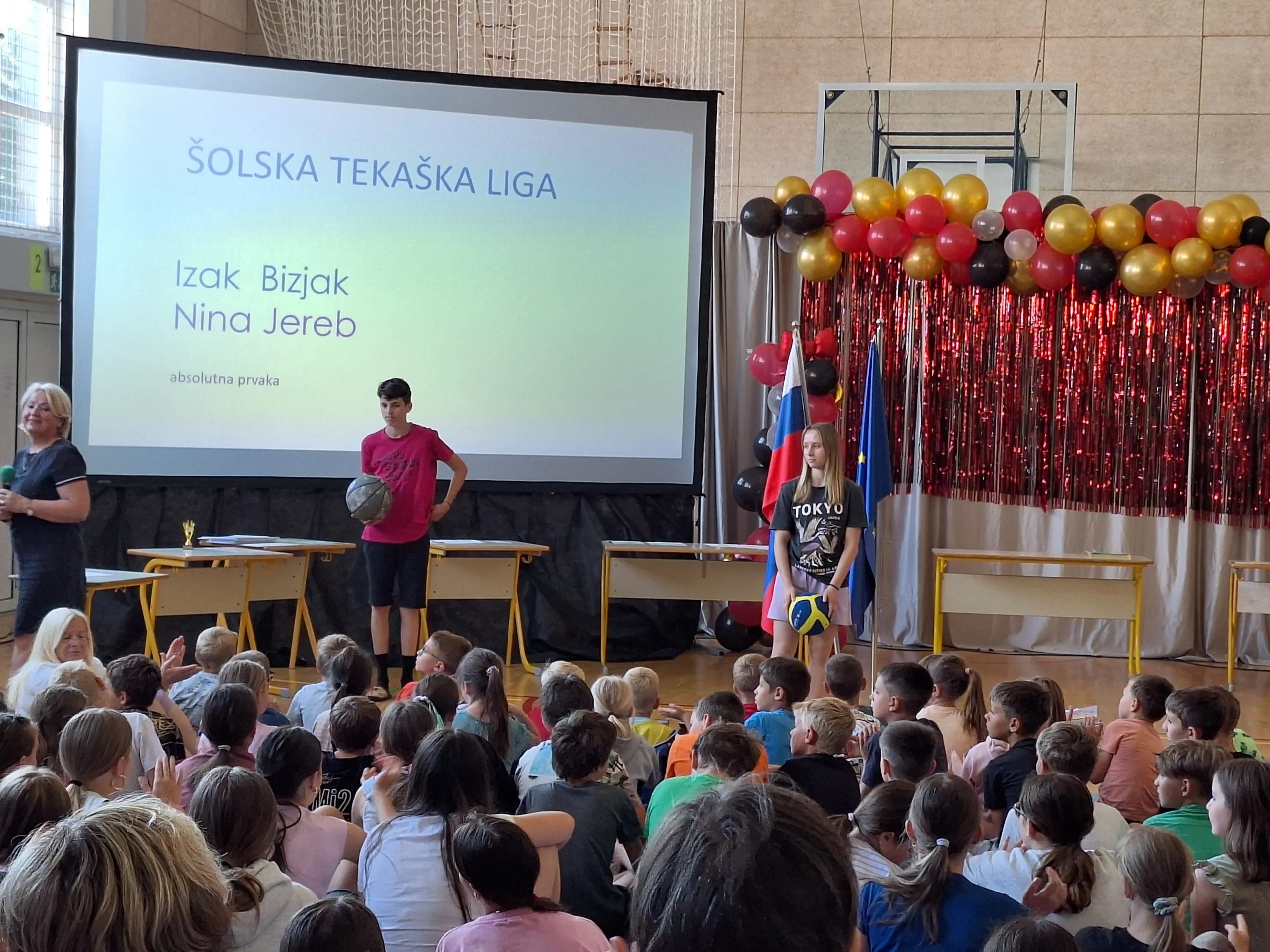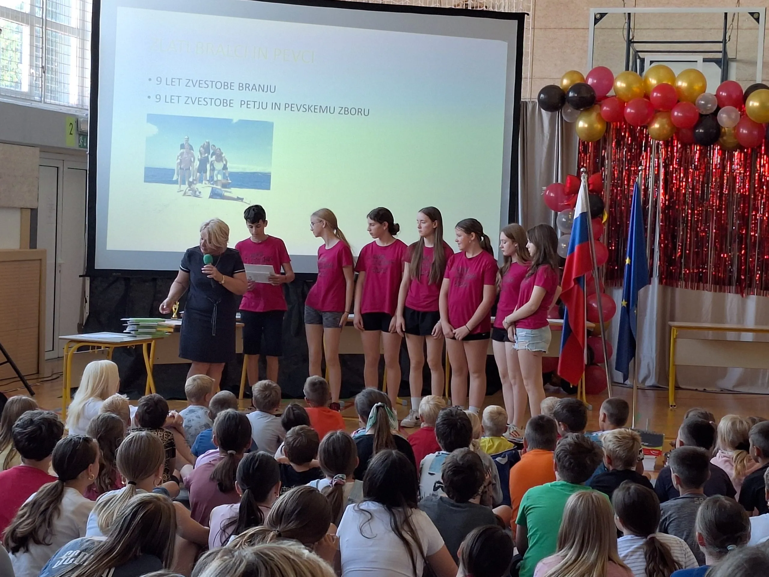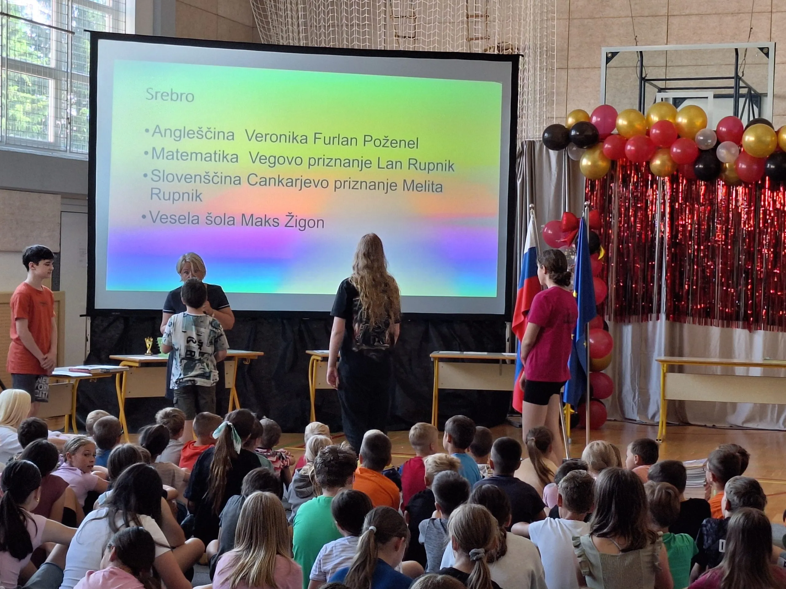 Slovesno in ponosno smo v petek, 13. junija 2025, v šolski telovadnici počastili s priznanji in nagradami učence, ki so dosegli srebrna in zlata priznanja na državni ravni tekmovanja posamično ali pa skupinsko. Visoki doseženi rezultati posameznikov in skupin so rezultat dela, znanja, sposobnosti ter nekaj talenta. Ti dosežki so sporočilo o kvalitetnem delu učiteljev, ki znajo učence motivirati pri šolski uri in še posebej pri urah dodatnega pouka, kjer priprave na tekmovanje zahtevajo veliko piljenje znanja. Najvišje so posegli: srebrni Maks, Veronika F.P., Melita in Lan, ter zlata Ema M. in Urban F., srebrne plesalke skupinsko Emili, Anika, Brina, Nika, Larissa in Nuša in srebrni Urban F., Aljaž M., Lucija R. in Fran T. na Lego- robotiki. Visoka priznanja dosežena v osmem in devetem razredu dajejo učencu možnost za kandidaturo za Zoisovo štipendijo, štipendijo, ki jo država Slovenija podeljuje učno zelo uspešnim otrokom. Upoštevajo se posamični dosežki, skupni rezultati pa se delijo glede na število članov v skupini oz. ekipi.