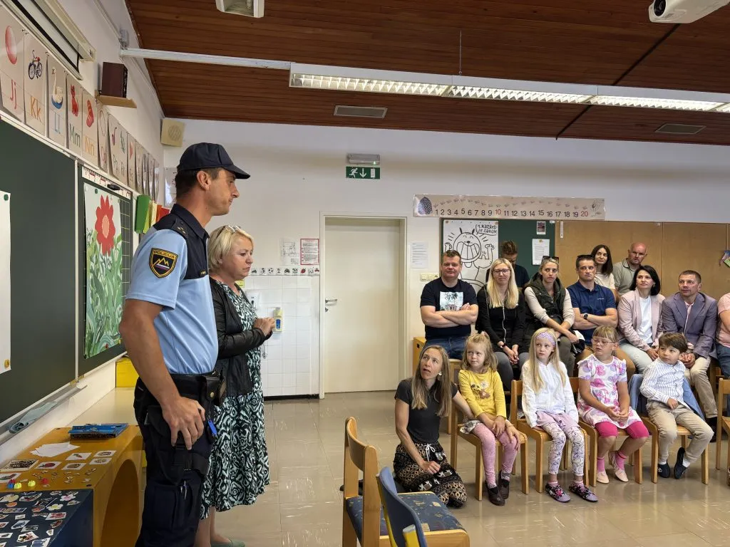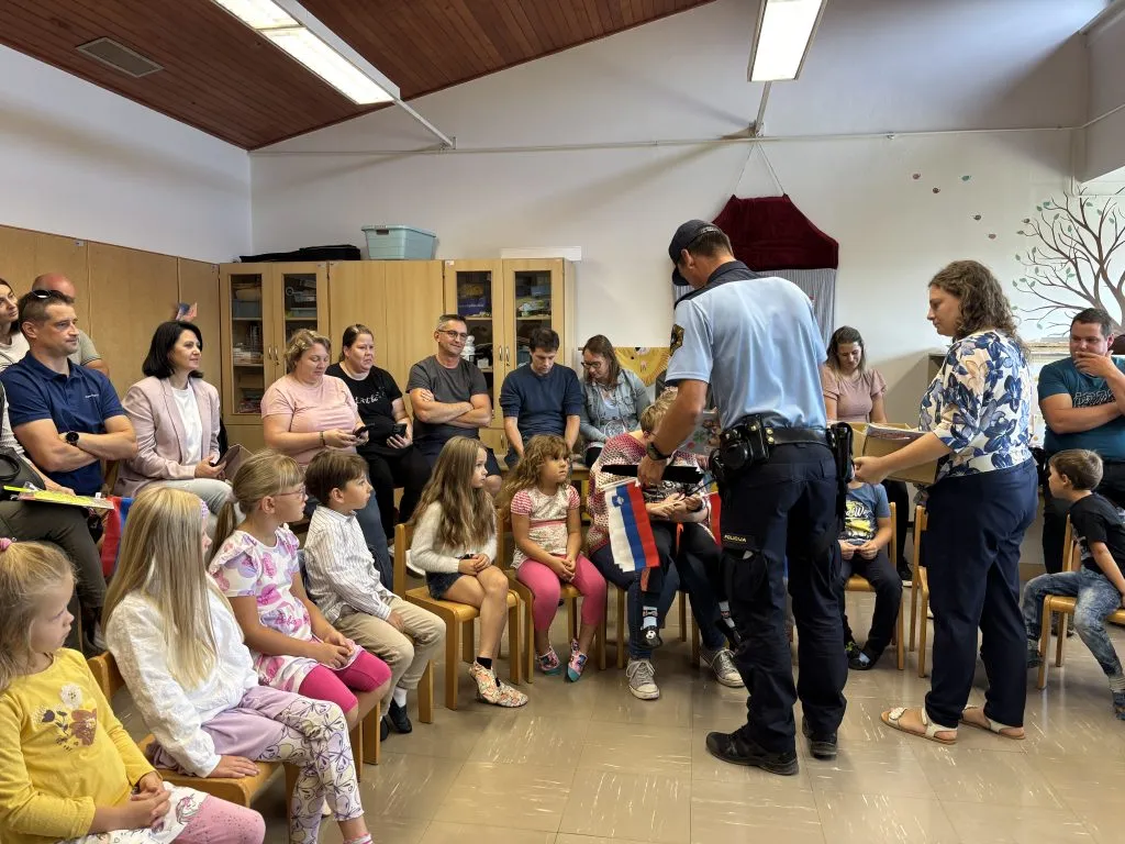 Pozdravil ter nagovoril jih je tudi policist, ki jim je izročil rutke, odsevnike in revije Ciciban ter slovensko zastavo.