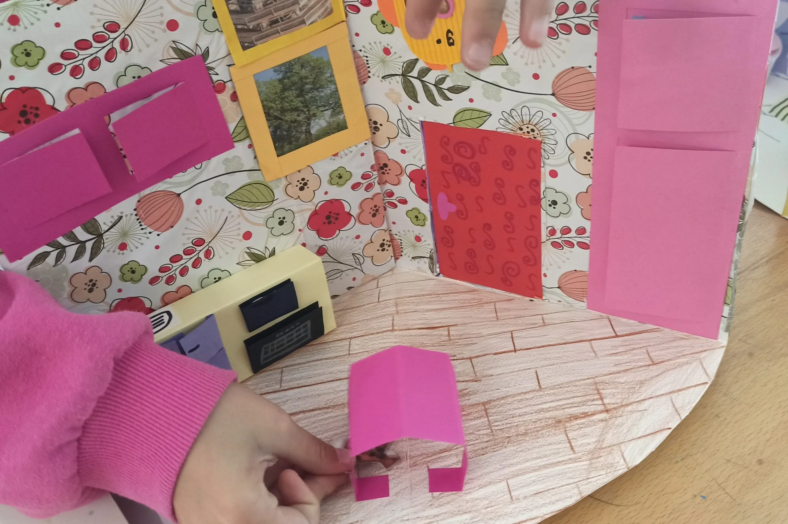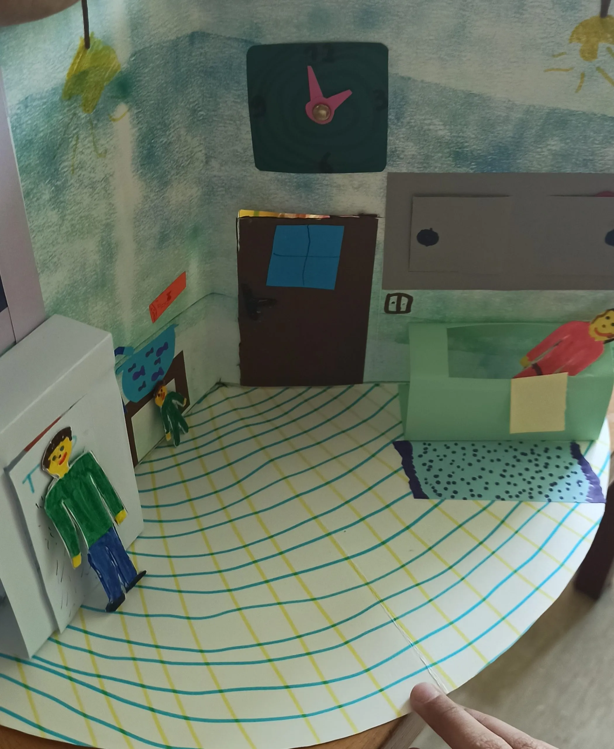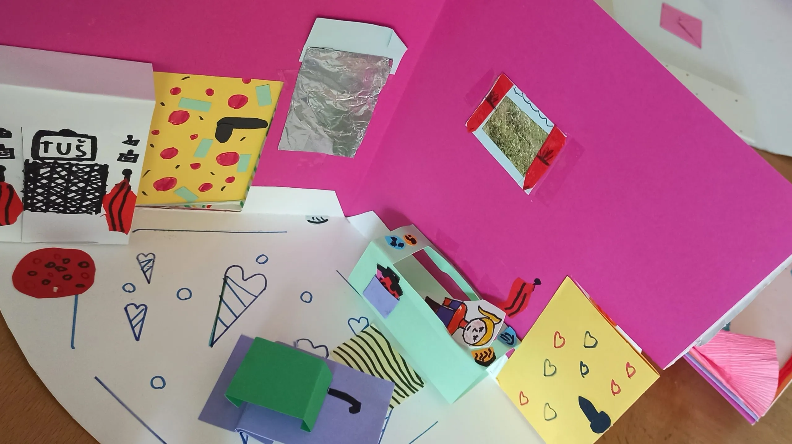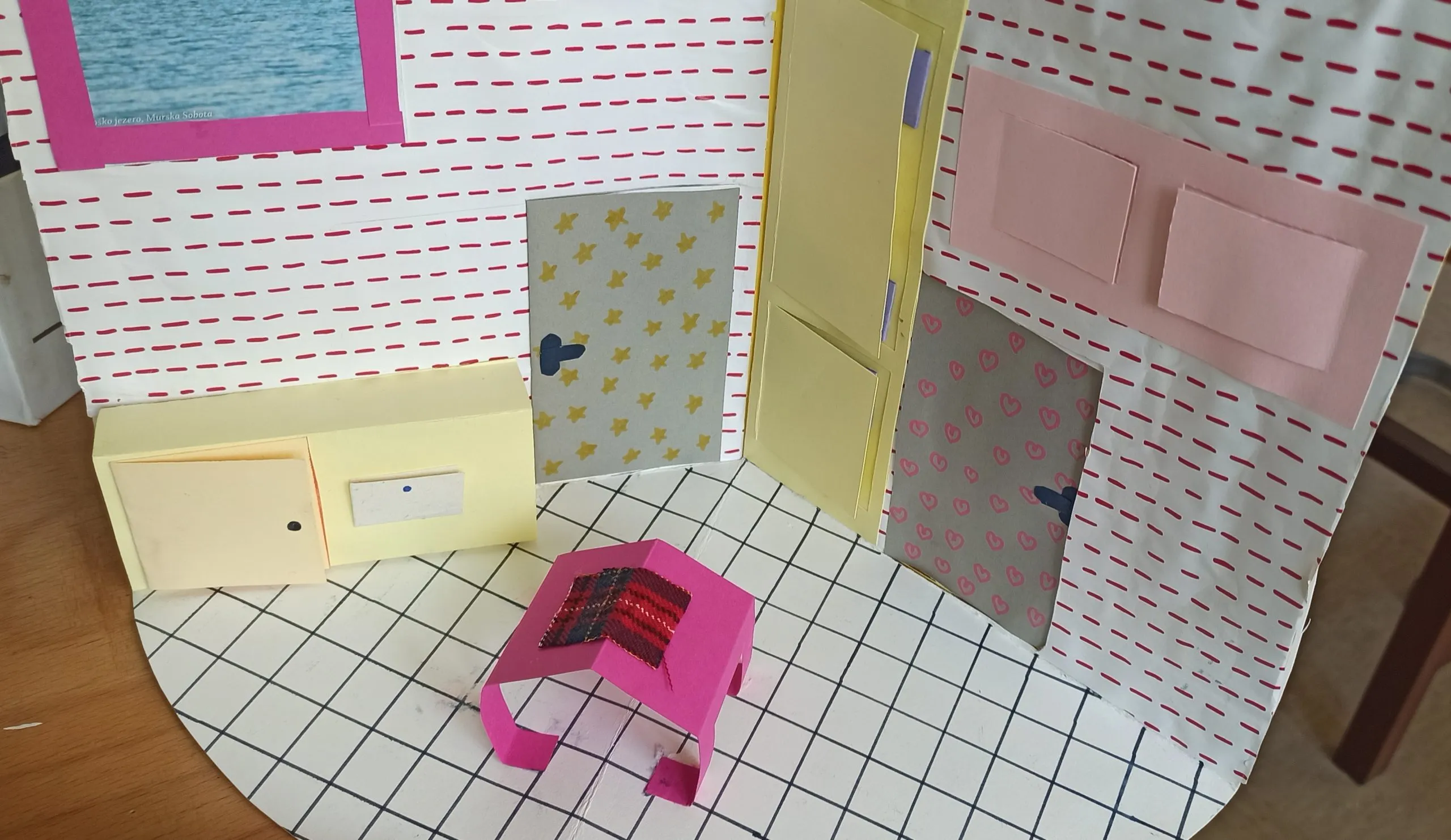 Učenke so se z veliko navdušenja posvetile večmesečnemu projektu, kjer so izdelovale trisobno stanovanje, ki je narejeno v tehniki pop up. Stanovanje namreč lahko zložiš in nastane oblika knjige. V njem so z mnogimi podrobnostmi narejeni stanovanjski elementi in seveda tudi stanovalci. In igra se lahko začne 🙂