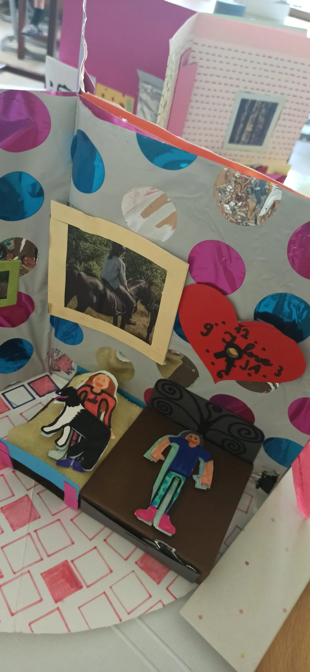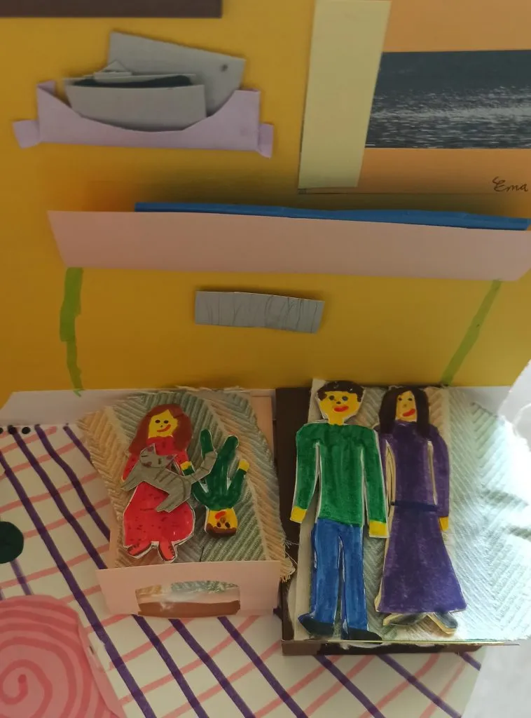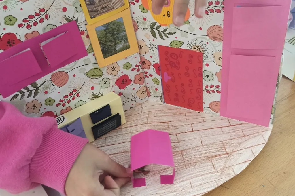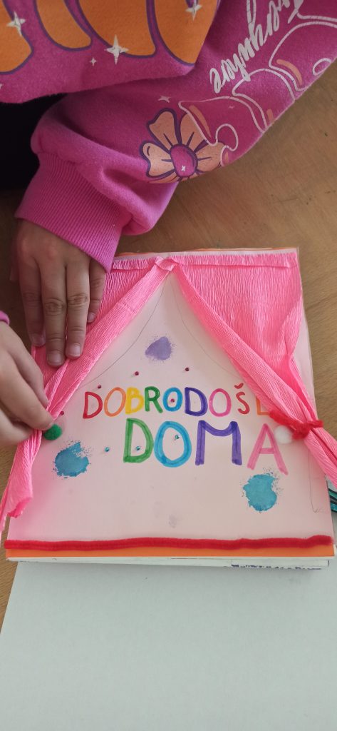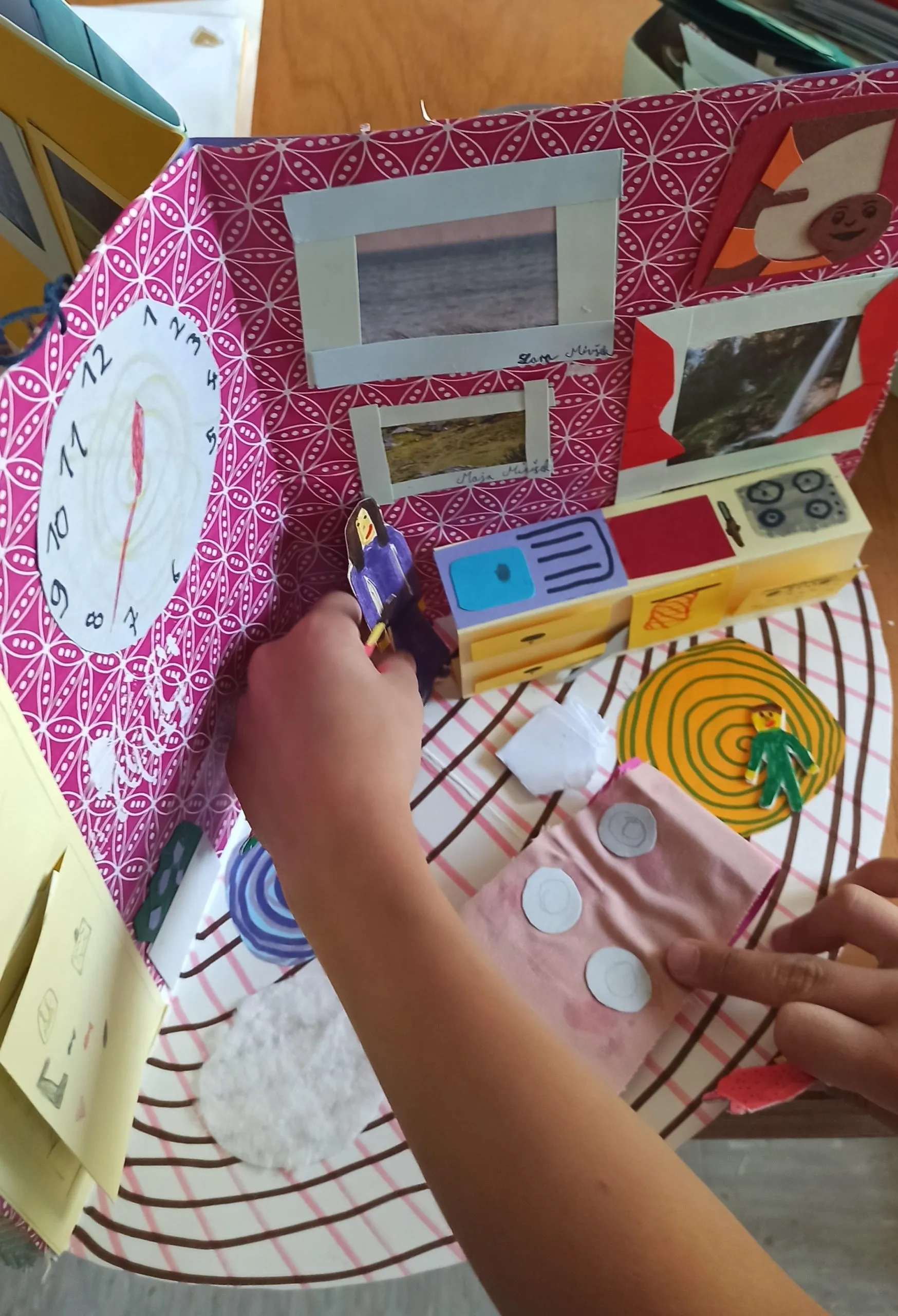 Učenke so se z veliko navdušenja posvetile večmesečnemu projektu, kjer so izdelovale trisobno stanovanje, ki je narejeno v tehniki pop up. Stanovanje namreč lahko zložiš in nastane oblika knjige. V njem so z mnogimi podrobnostmi narejeni stanovanjski elementi in seveda tudi stanovalci. In igra se lahko začne 🙂