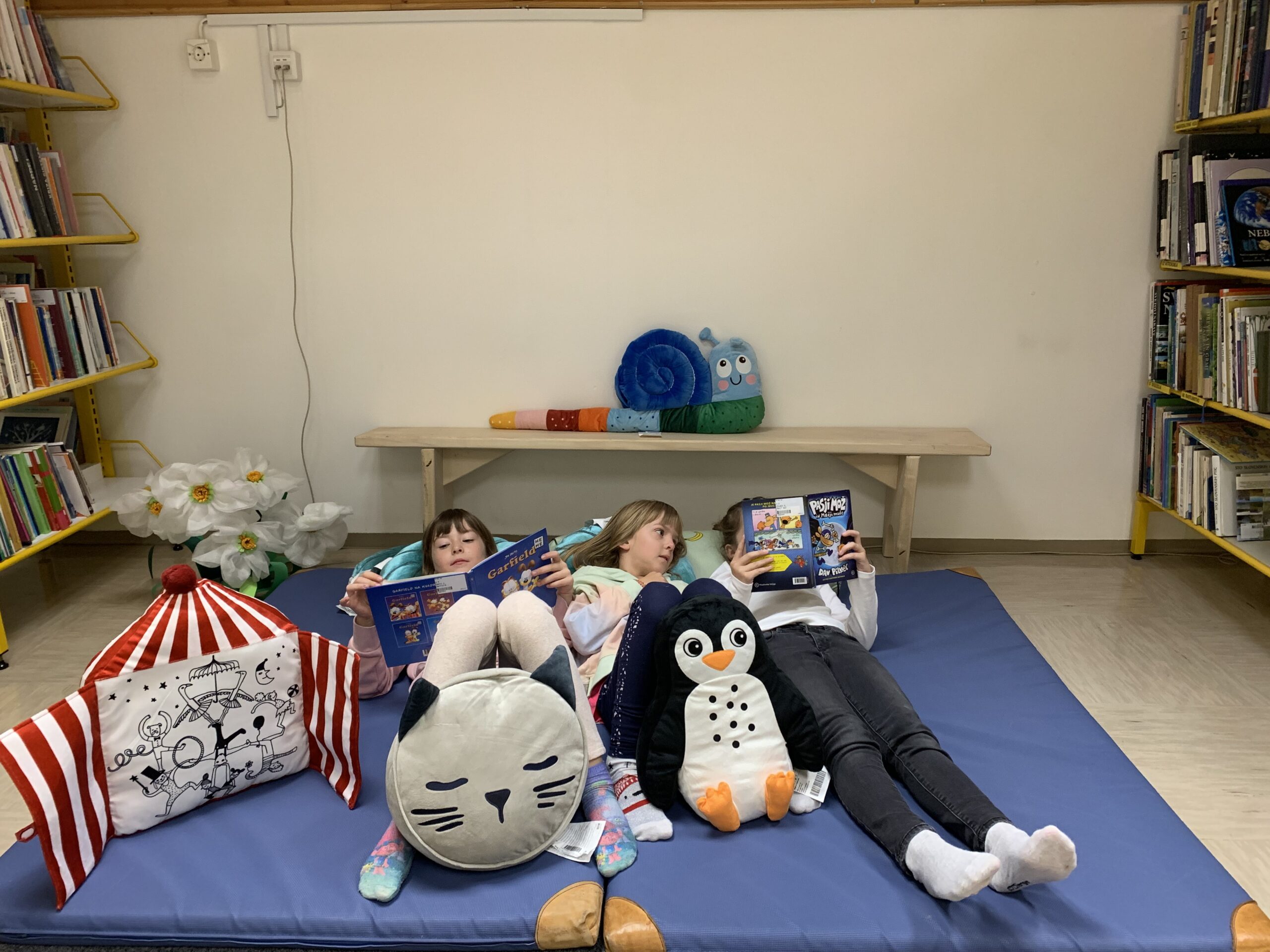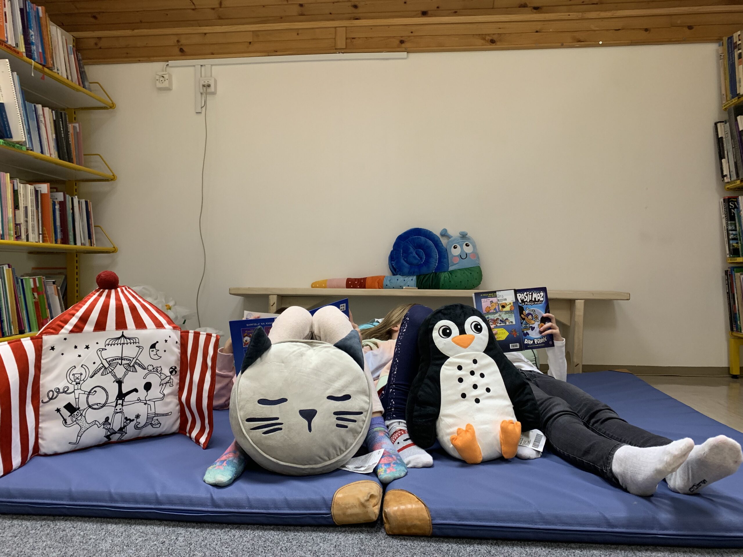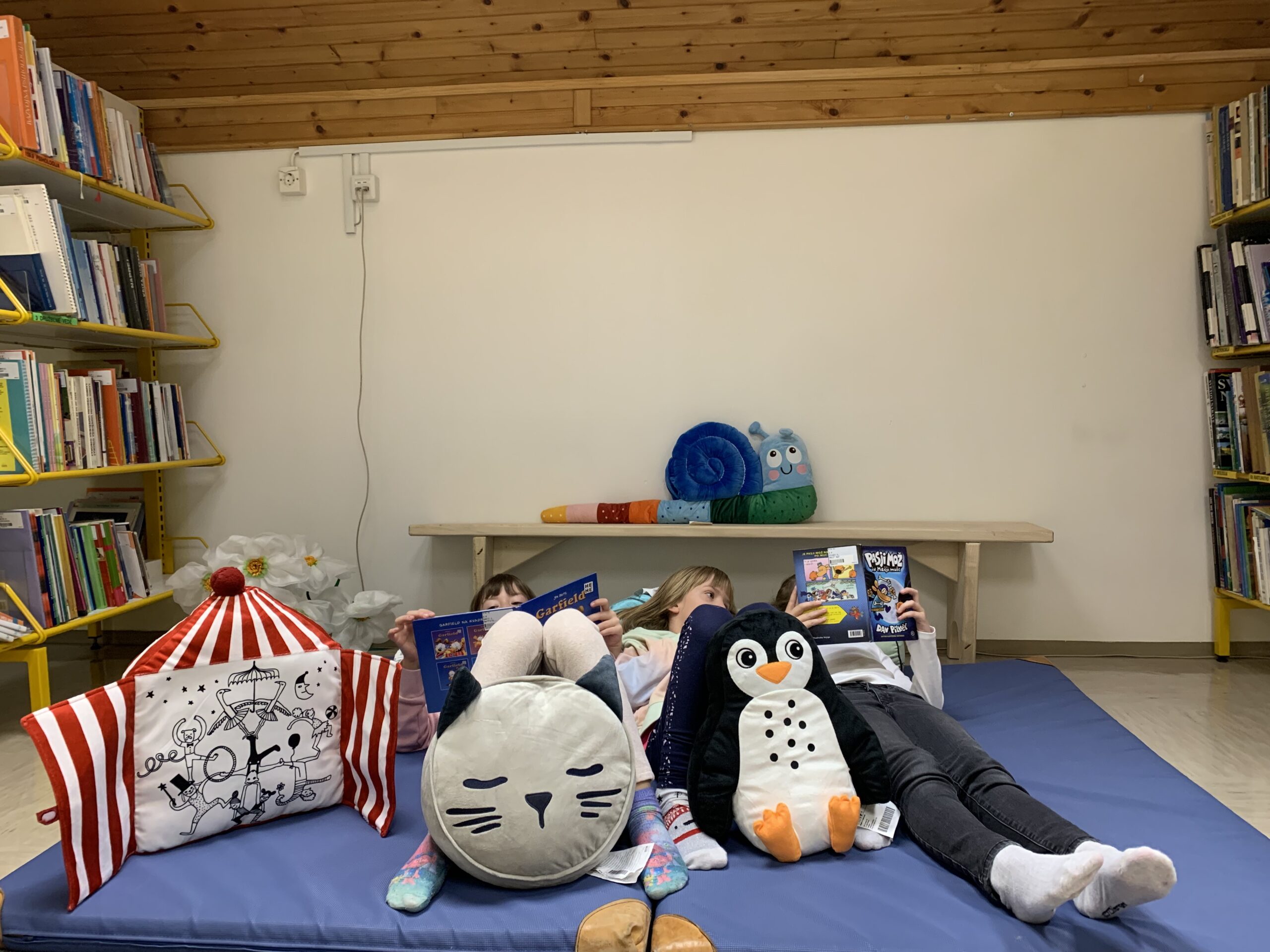 Da bo branje prijetnejše, so se v bralni kotiček v knjižnici, naselile prav posebne blazine. Učence vabijo, da se na njih naslonijo in vzamejo najljubše knjige v roke. Pozdravite gospoda Polža Mavričnega, Muco Okroglolično in Pingvina Severnega. Kaj pa se skriva za vrati rdeče-belo progaste blazine, odkrijte sami.