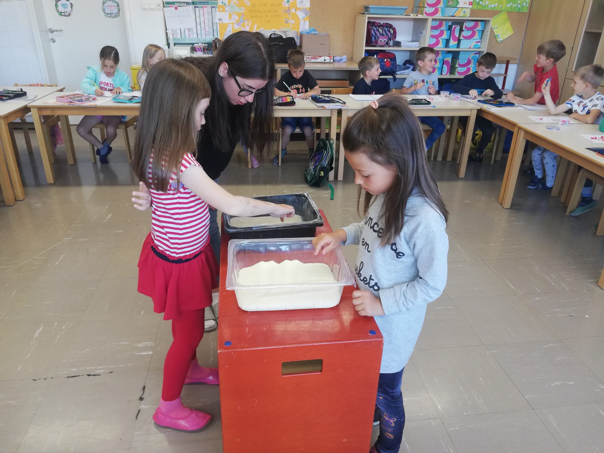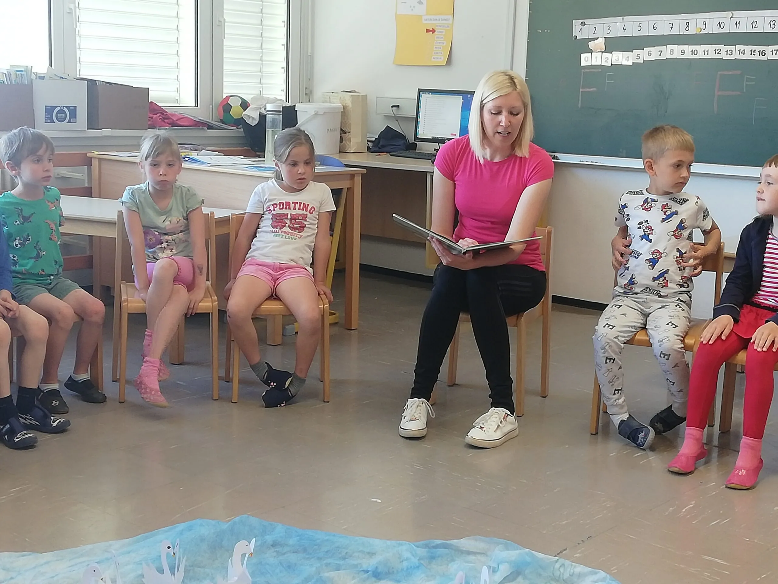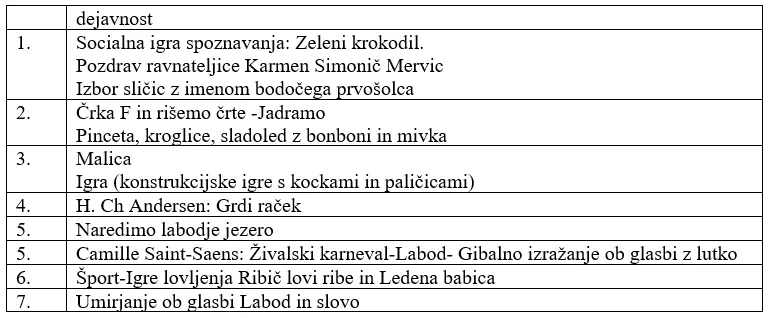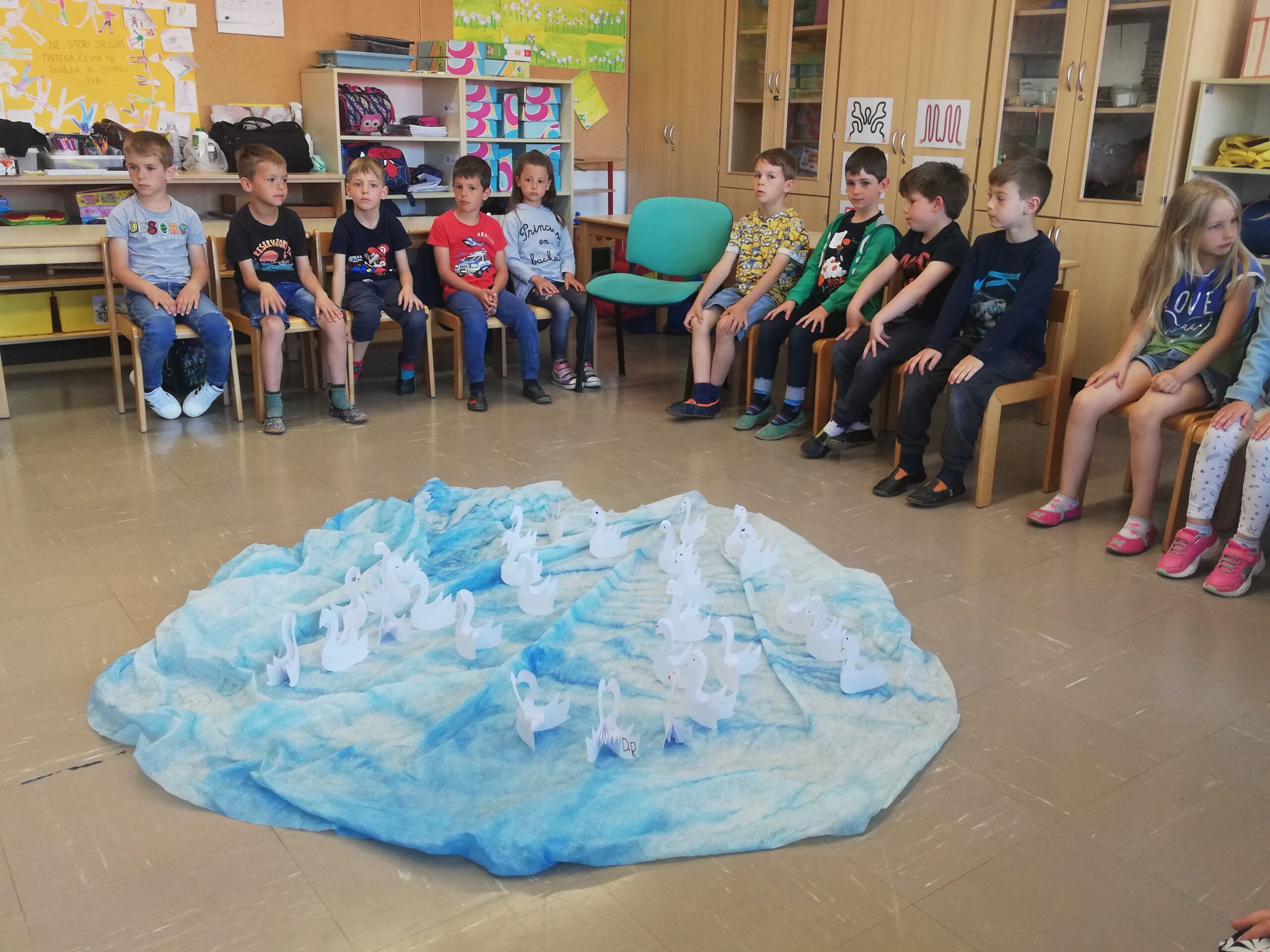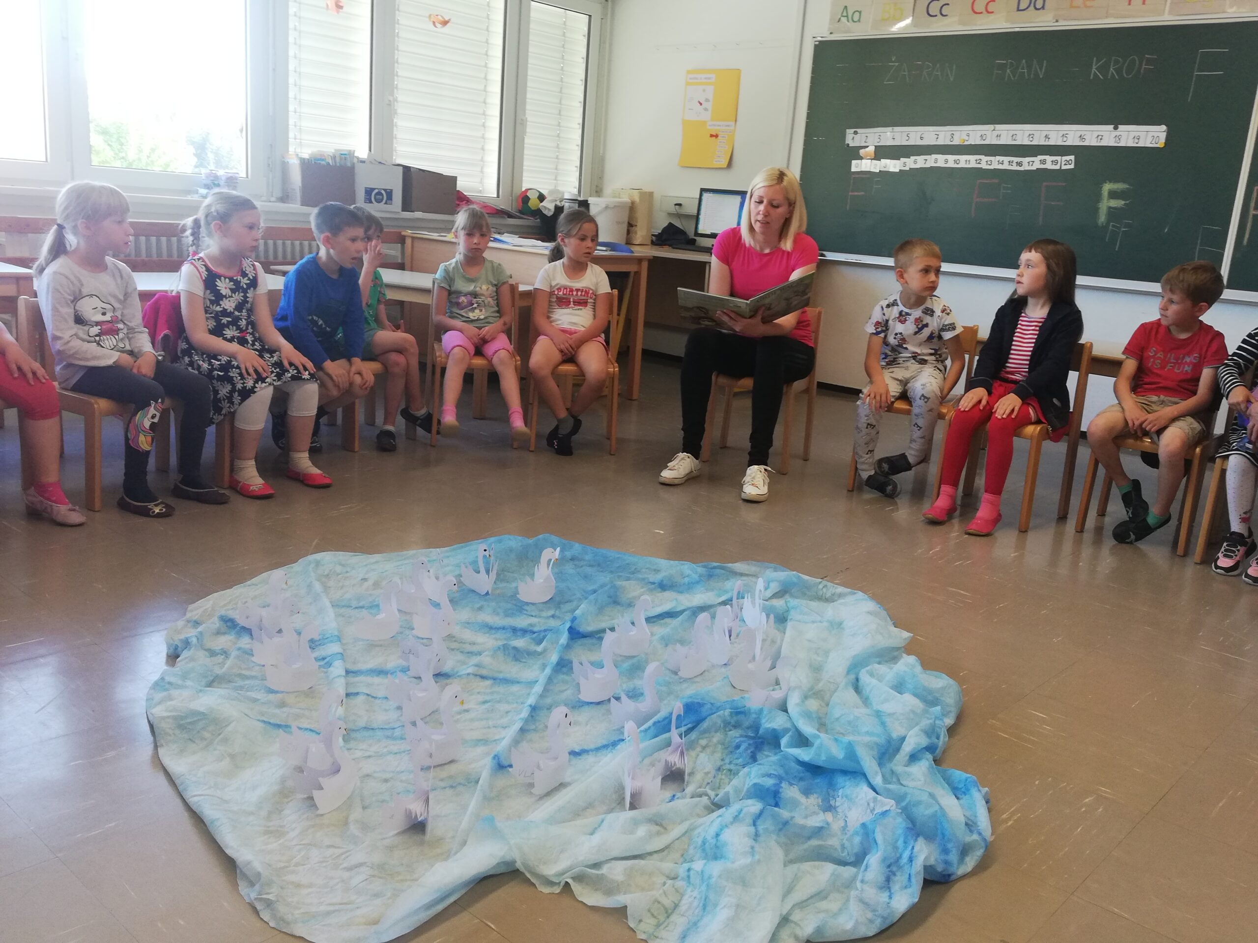 Dan je potekal sproščeno in igrivo. Otroci so spoznali zadnjo veliko tiskano črko F, zbrano poslušali pravljico Grdi raček, ki jo je doživeto pripovedovala učiteljica Andreja Rupnik, zaplesali z lutko laboda ob čudoviti glasbi Labod, naredili labodje jezero in se čisto zares igrali. Po ličkih je steka tudi kakšna solza, trije otroci pa so podrsali kolena.