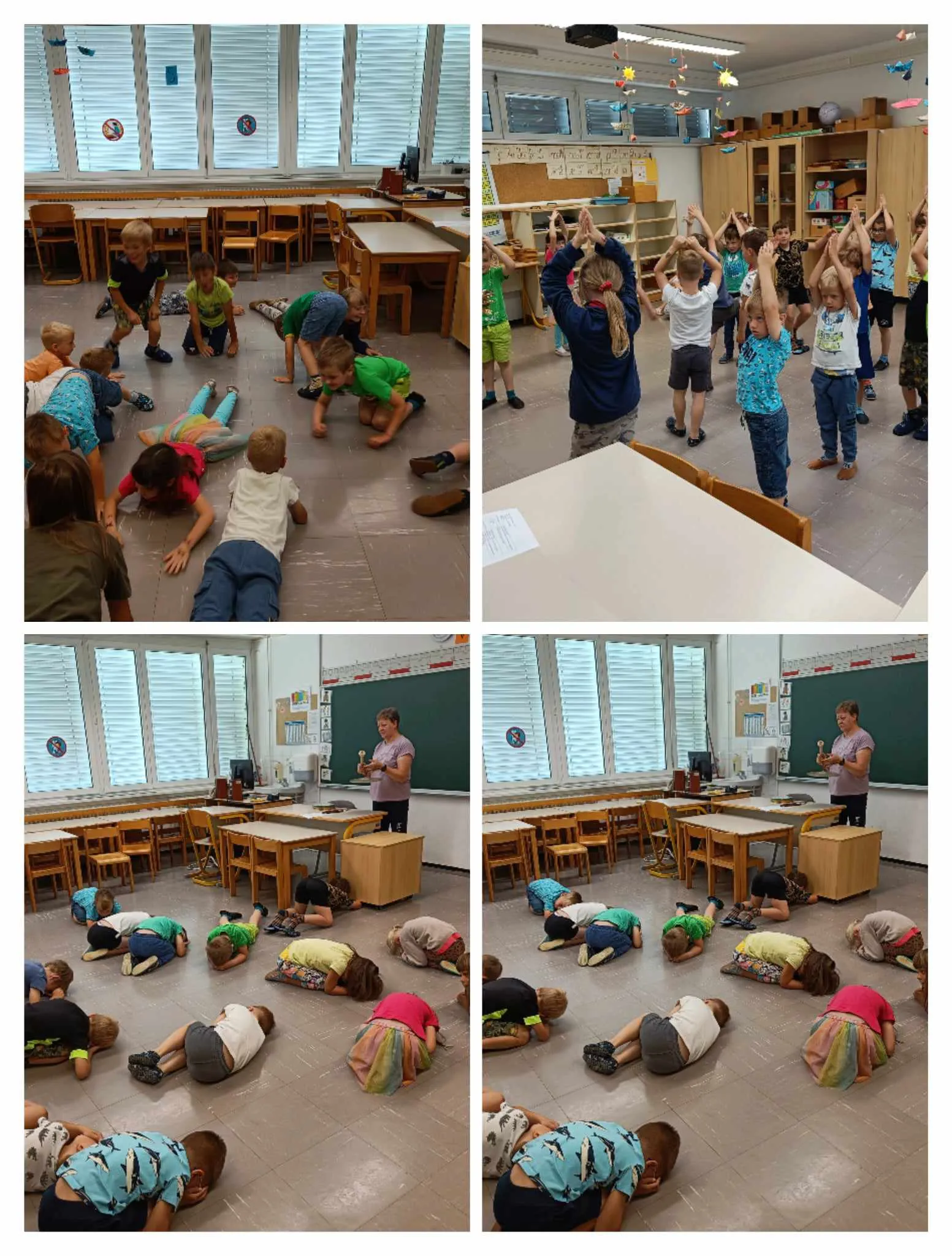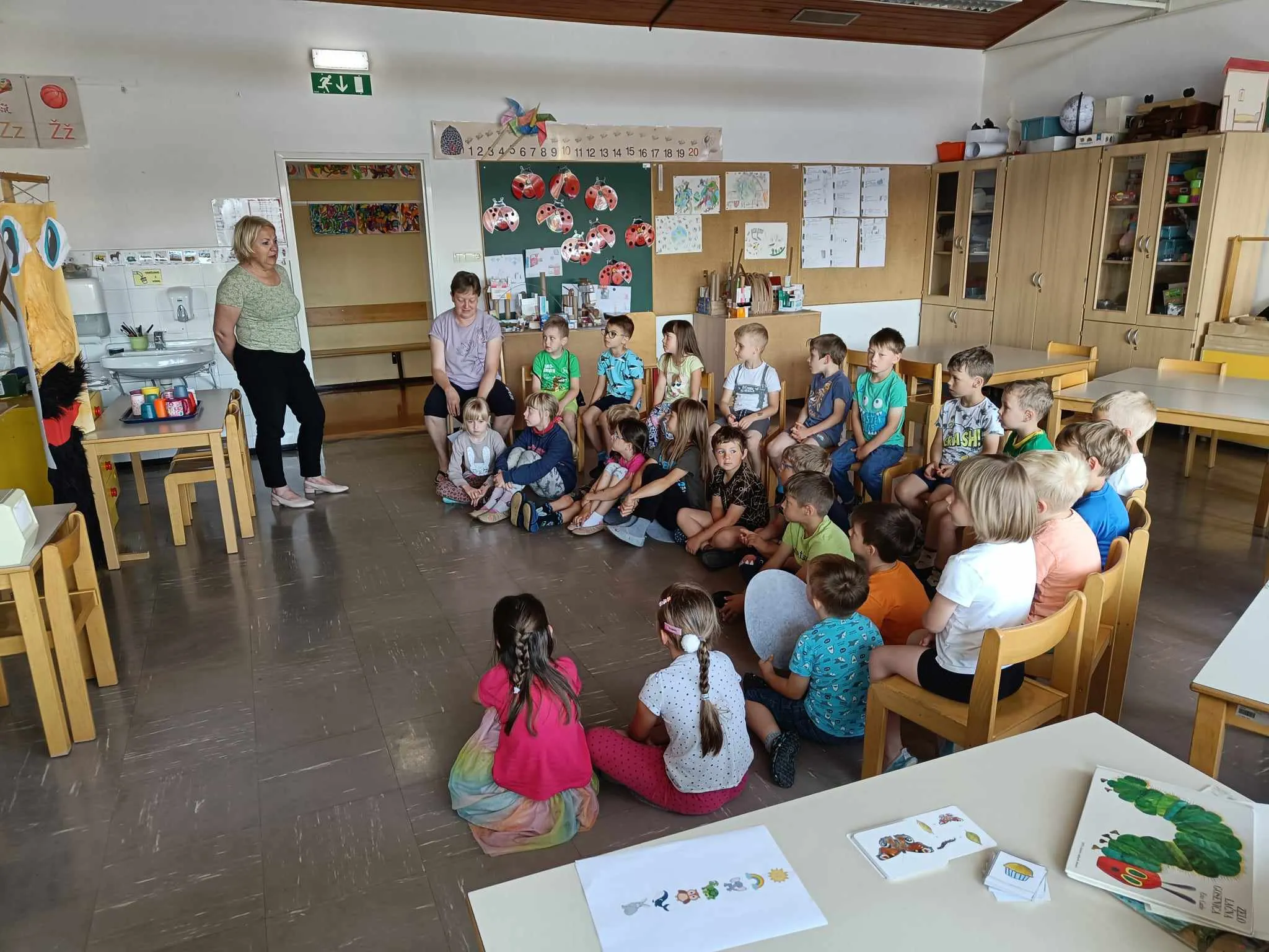 Dan smo začeli s poslušanjem zgodbe Erica Carla: Zelo lačna gosenica. Zgodbo smo nadgradili s spoznavanjem razvojnega cikla gosenice – metulja, gibanjem kot razvojne faze metulja, likovnim ustvarjenem pisanih metuljev, glasbenim ustvarjanjem in ritmiziranjem.