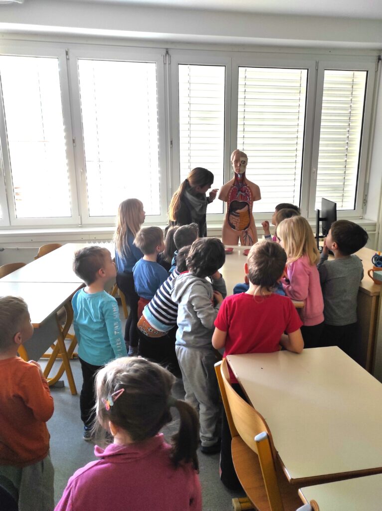 Otroci so precej radovedni in zvedavi, v vrtcu pa se trenutno pogovarjajo o človeškem telesu ter njegovi zgradbi. Da si delovanje človeškega telesa lažje predstavljajo, so prišli na obisk v šolsko naravoslovno učilnico, kjer so si pogledali model človeškega skeleta in model človeškega telesa. Ogledali so si tudi model zobovja ter se še poučili o najmanjših koščicah, ki jih najdemo v ušesu. Kot učiteljica biologije sem nad njihovim znanjem in zanimanjem navdušena.