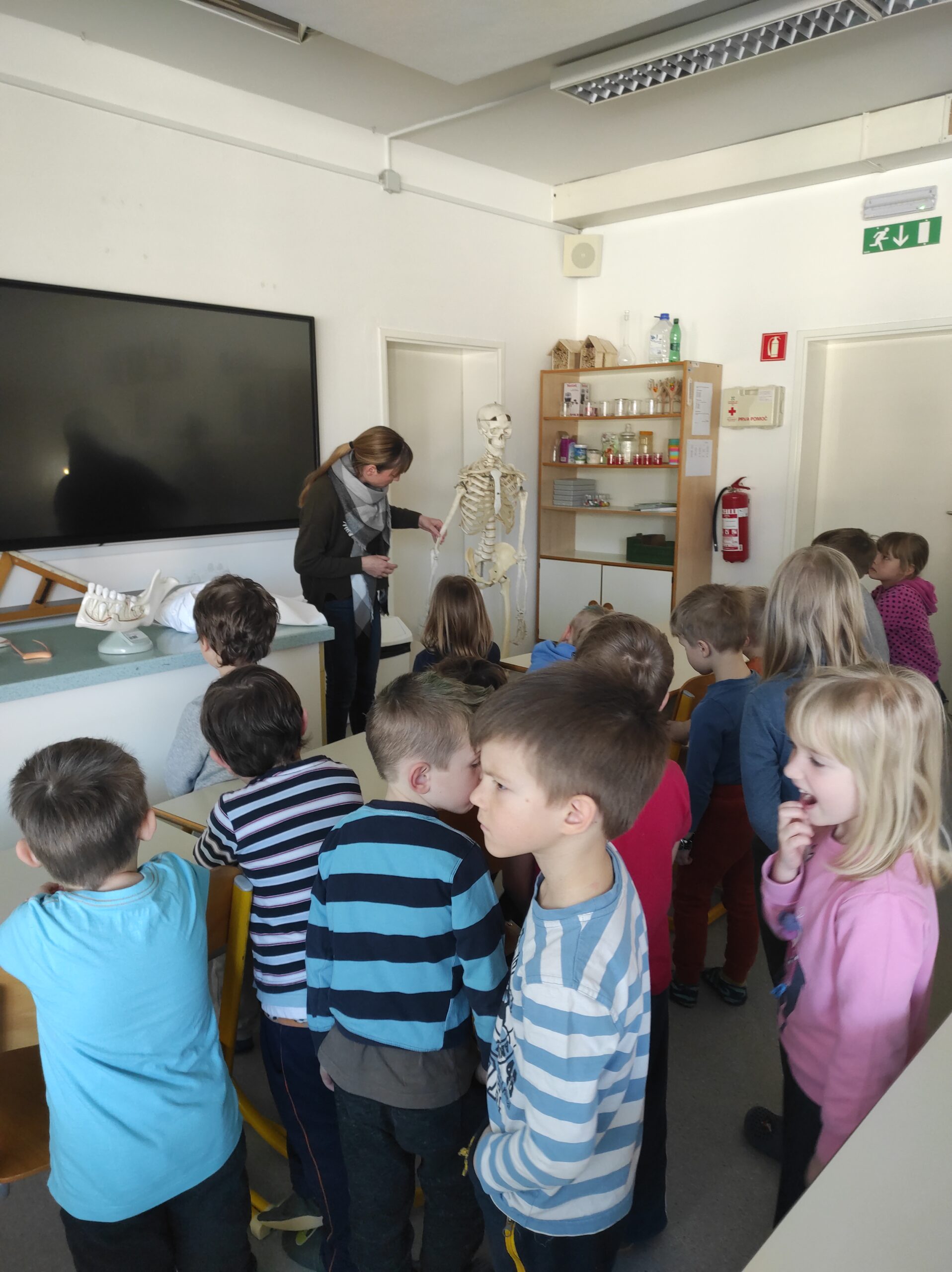 Otroci so precej radovedni in zvedavi, v vrtcu pa se trenutno pogovarjajo o človeškem telesu ter njegovi zgradbi. Da si delovanje človeškega telesa lažje predstavljajo, so prišli na obisk v šolsko naravoslovno učilnico, kjer so si pogledali model človeškega skeleta in model človeškega telesa. Ogledali so si tudi model zobovja ter se še poučili o najmanjših koščicah, ki jih najdemo v ušesu. Kot učiteljica biologije sem nad njihovim znanjem in zanimanjem navdušena.
