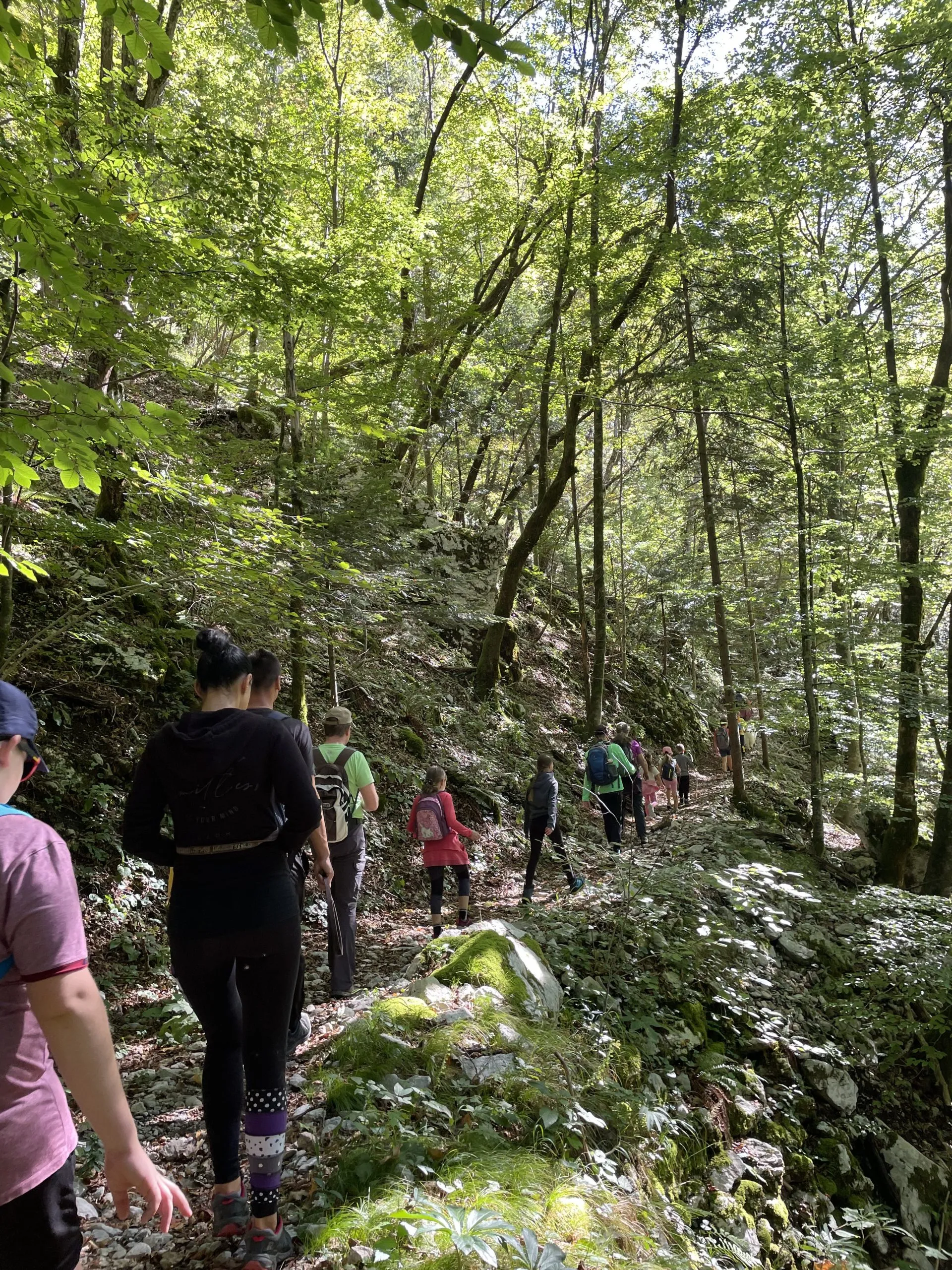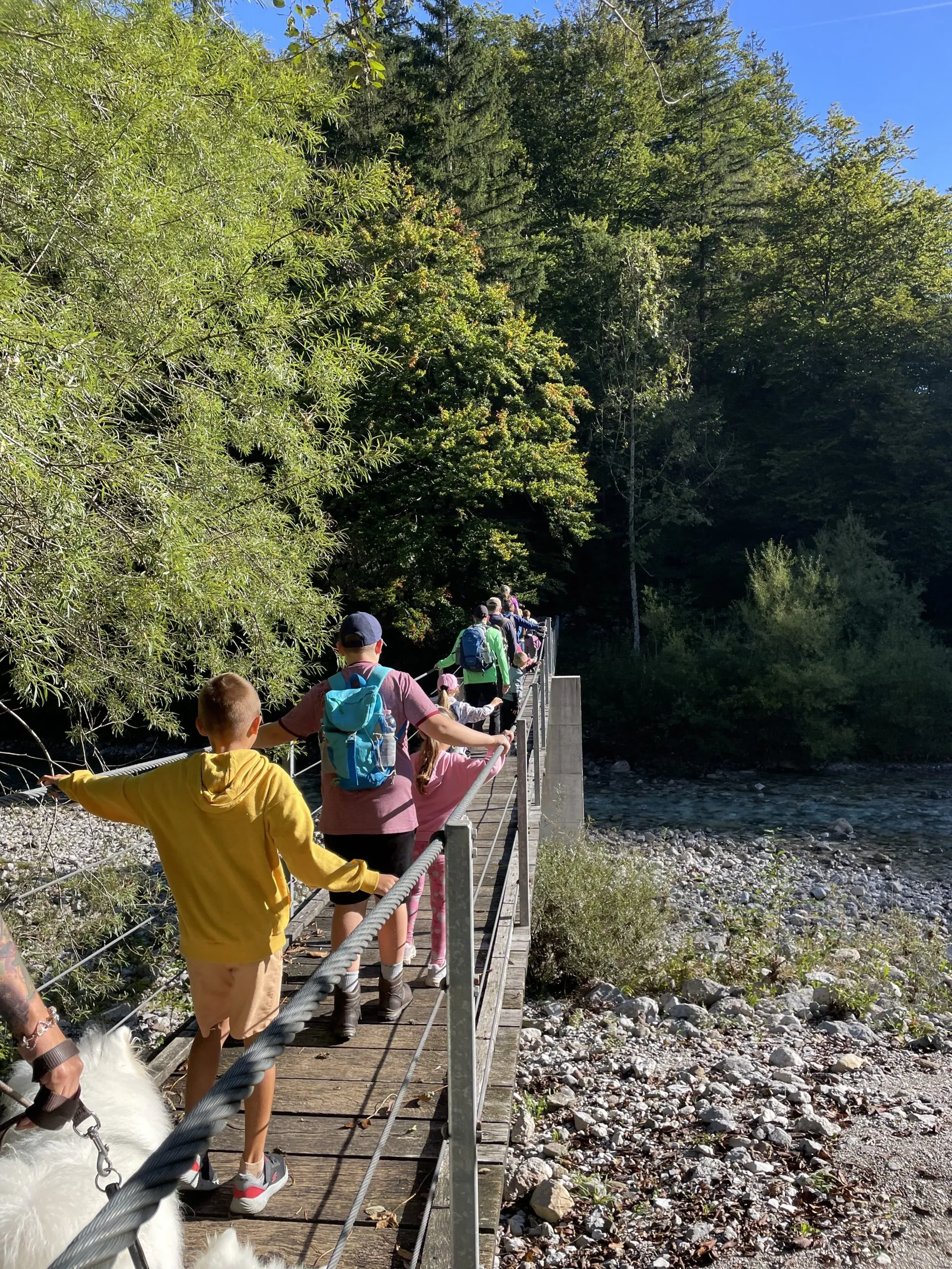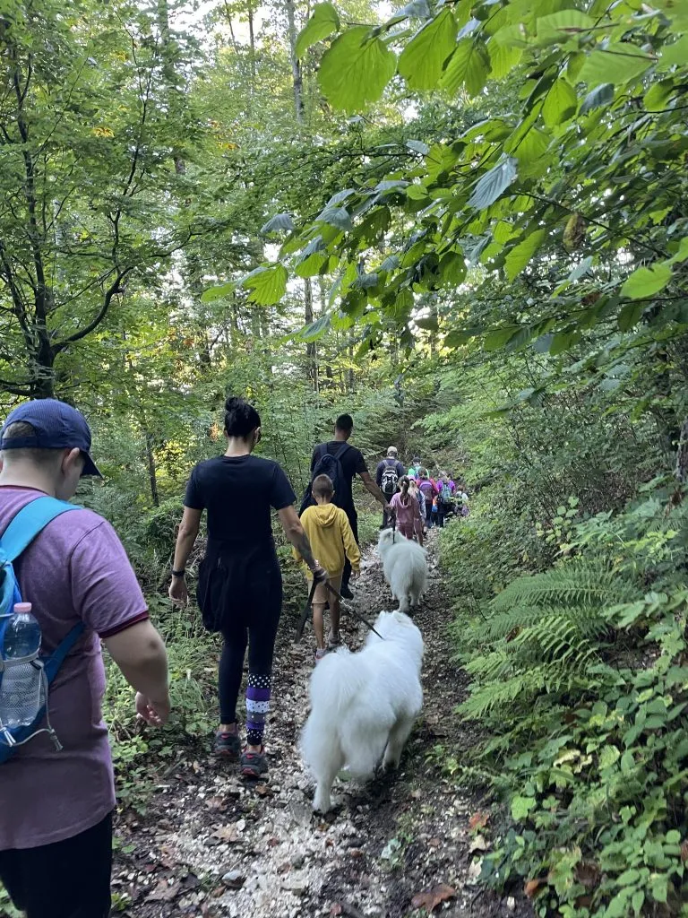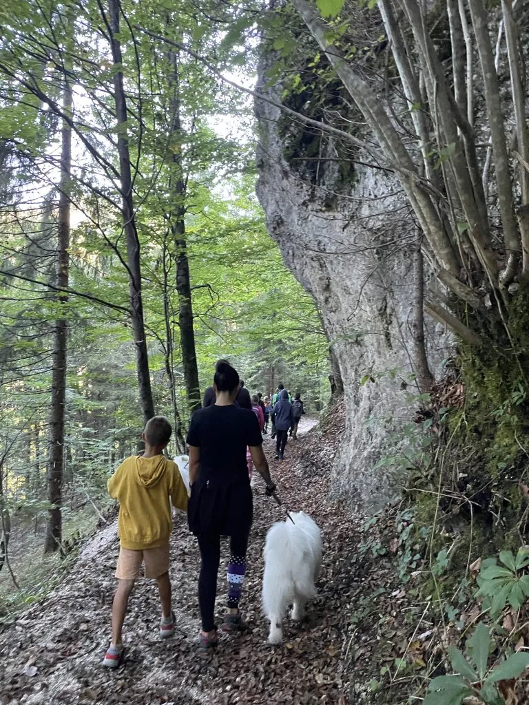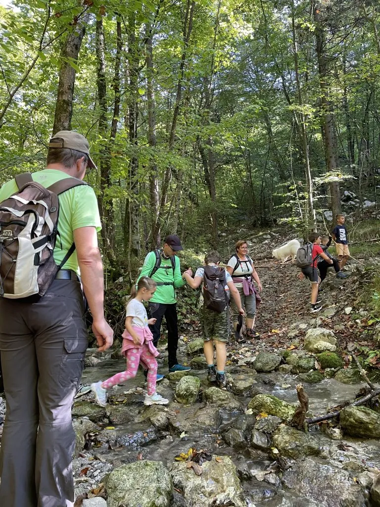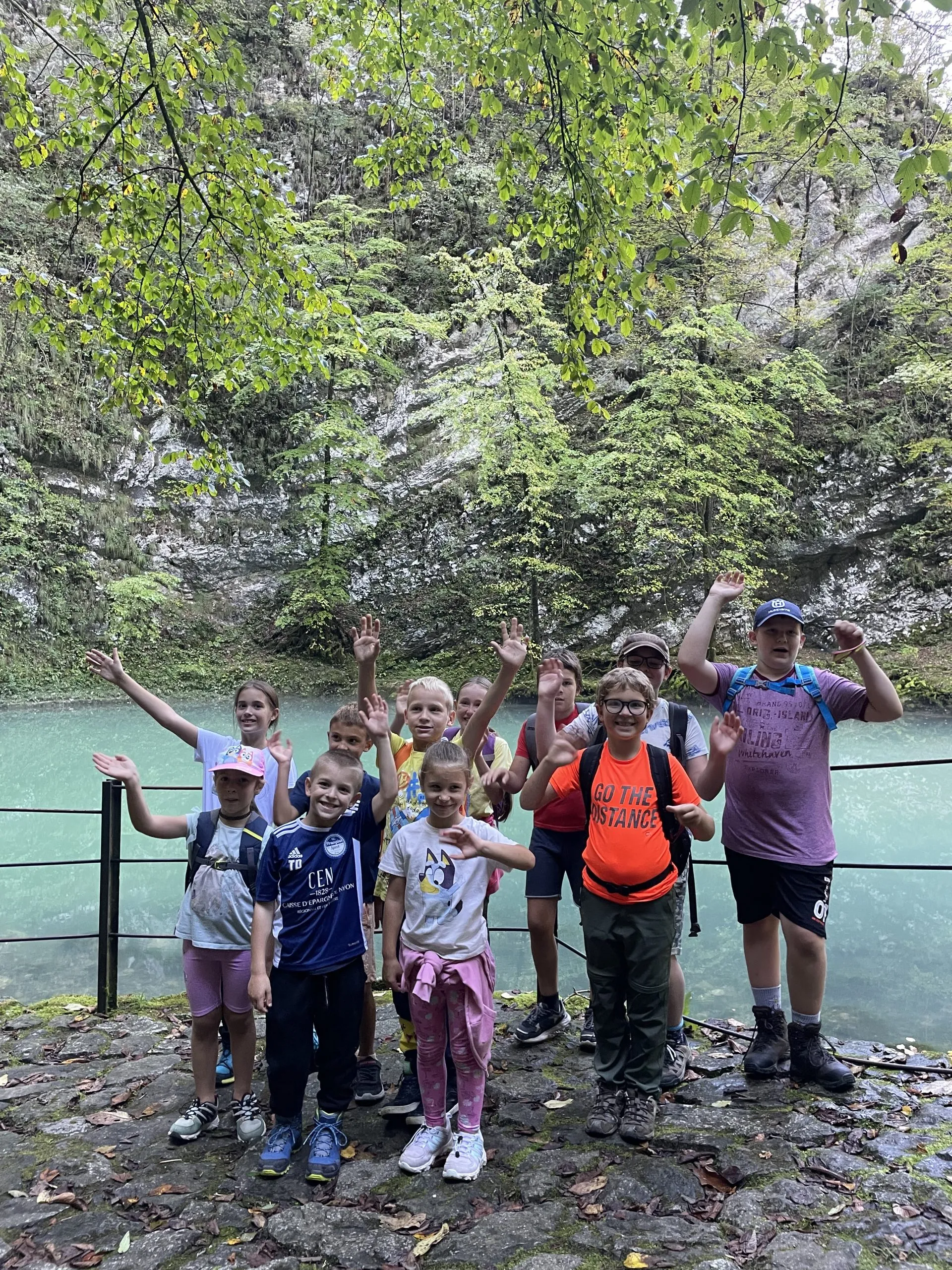 V soboto smo se ob 8.30 številčno zbrali v Zadlogu pri Kosmač. Na pohod so prišli učenci, njihovi starši, pa tudi nekaj štirinožnih prijateljev, kar nas je zelo razveselilo. Pot smo začeli po makadamski cesti navzdol, nato pa nadaljevali po stezi do Idrijske Bele. Presenetilo nas je, kako hitro smo prispeli tja. Po cesti smo pot nadaljevali do Lajšta, kjer smo si privoščili malico. Od tam smo se podali proti Fežnarju, nato pa še šest kilometrov po stezi do našega cilja –Divjega jezera, ki smo ga dosegli okoli 12. ure. Na poti smo prečkali nekaj potočkov, visečih mostov in preskočili nekaj podrtih dreves, kar je pohod naredilo še bolj zanimiv. Dan je bil popoln: topel, sončen in idiličen, pravšnji za družinski pohod.