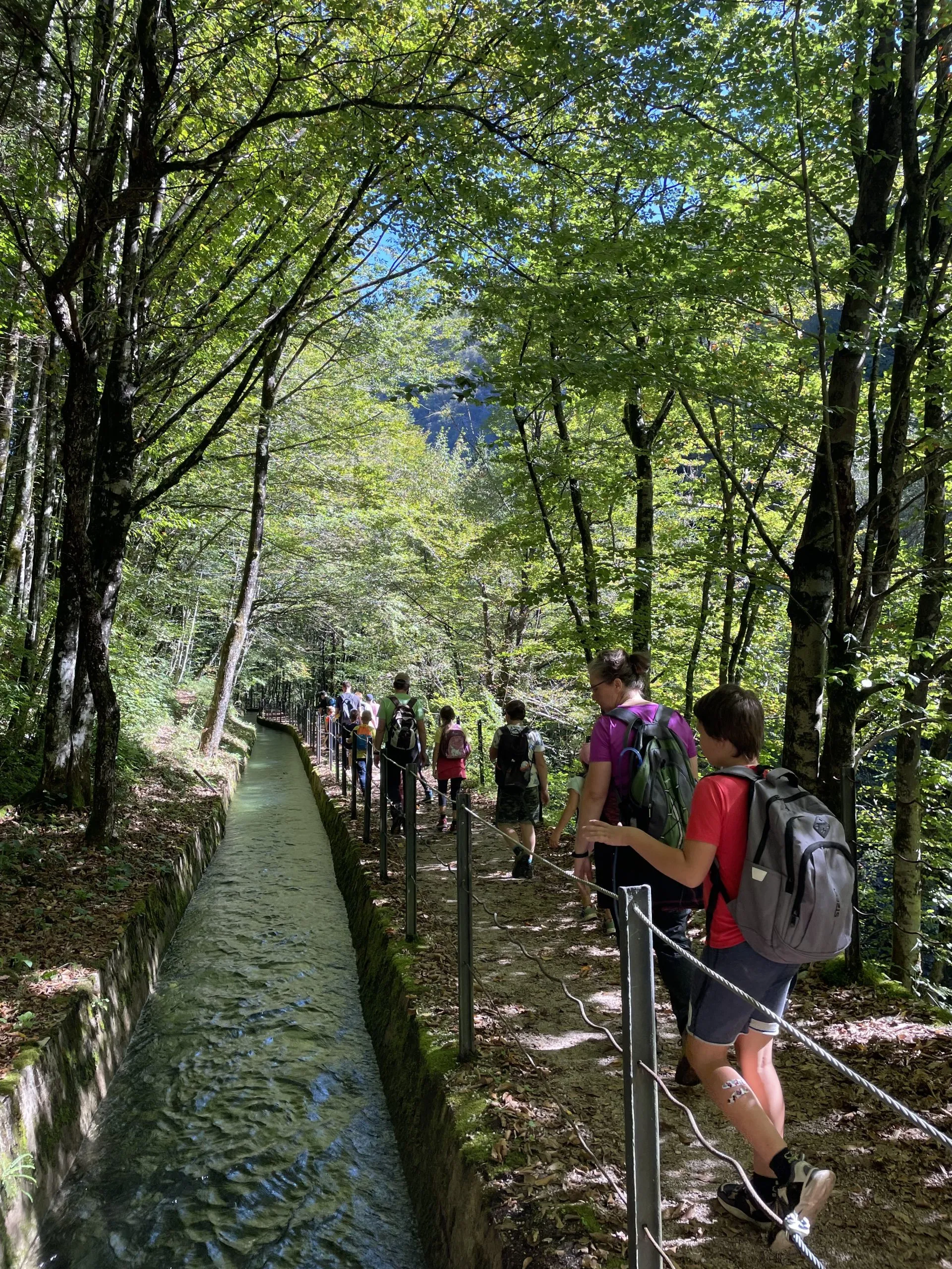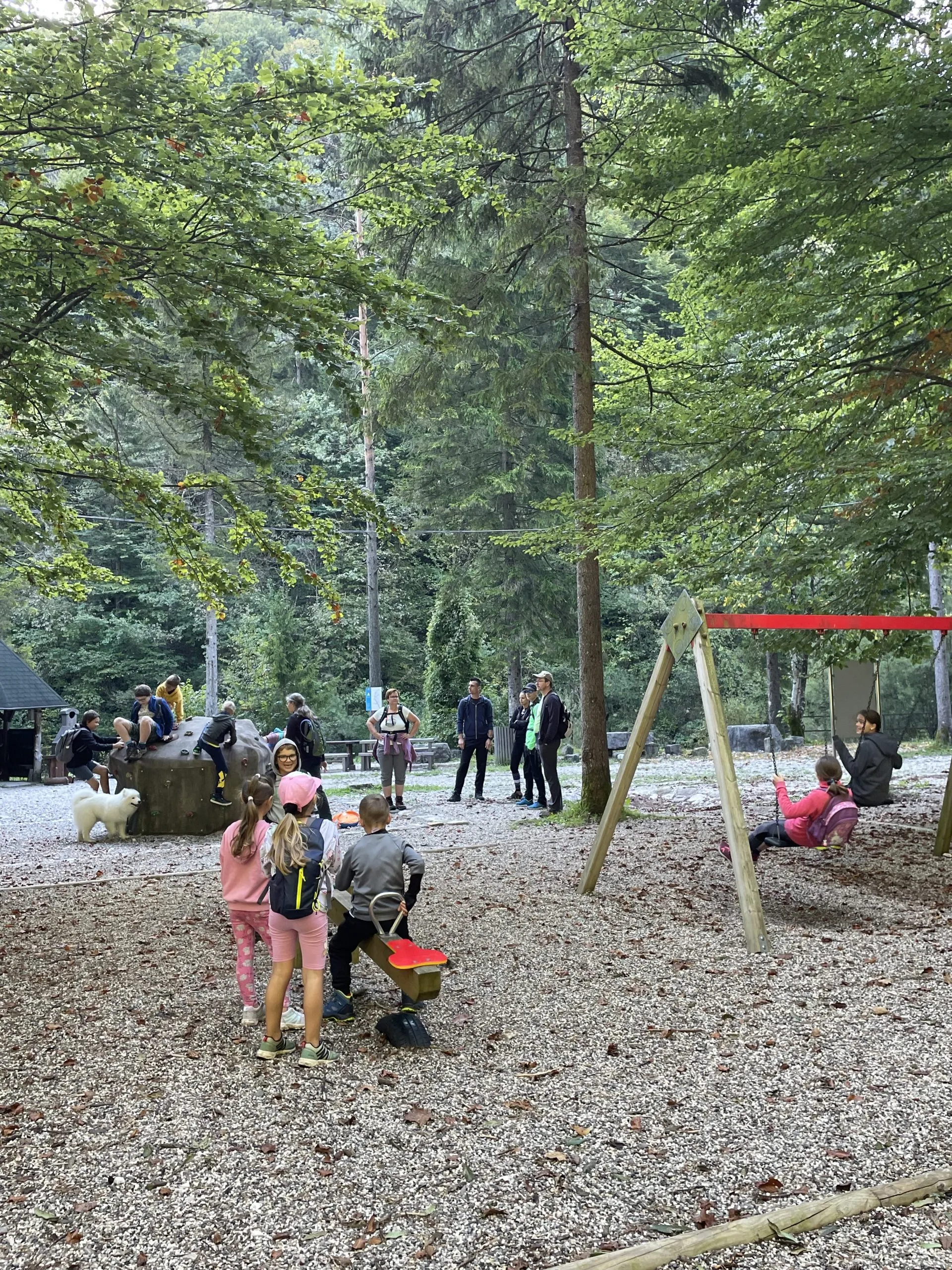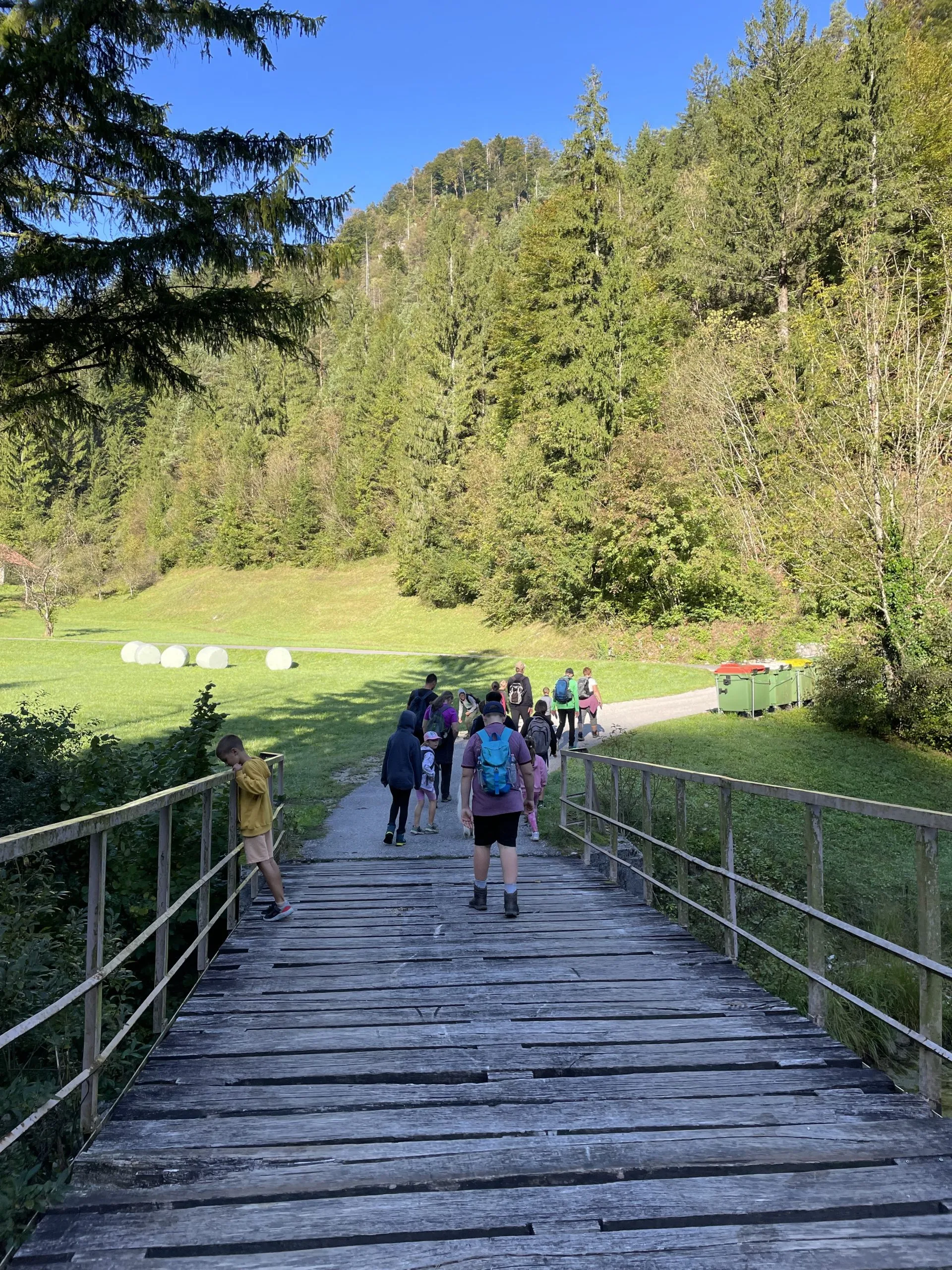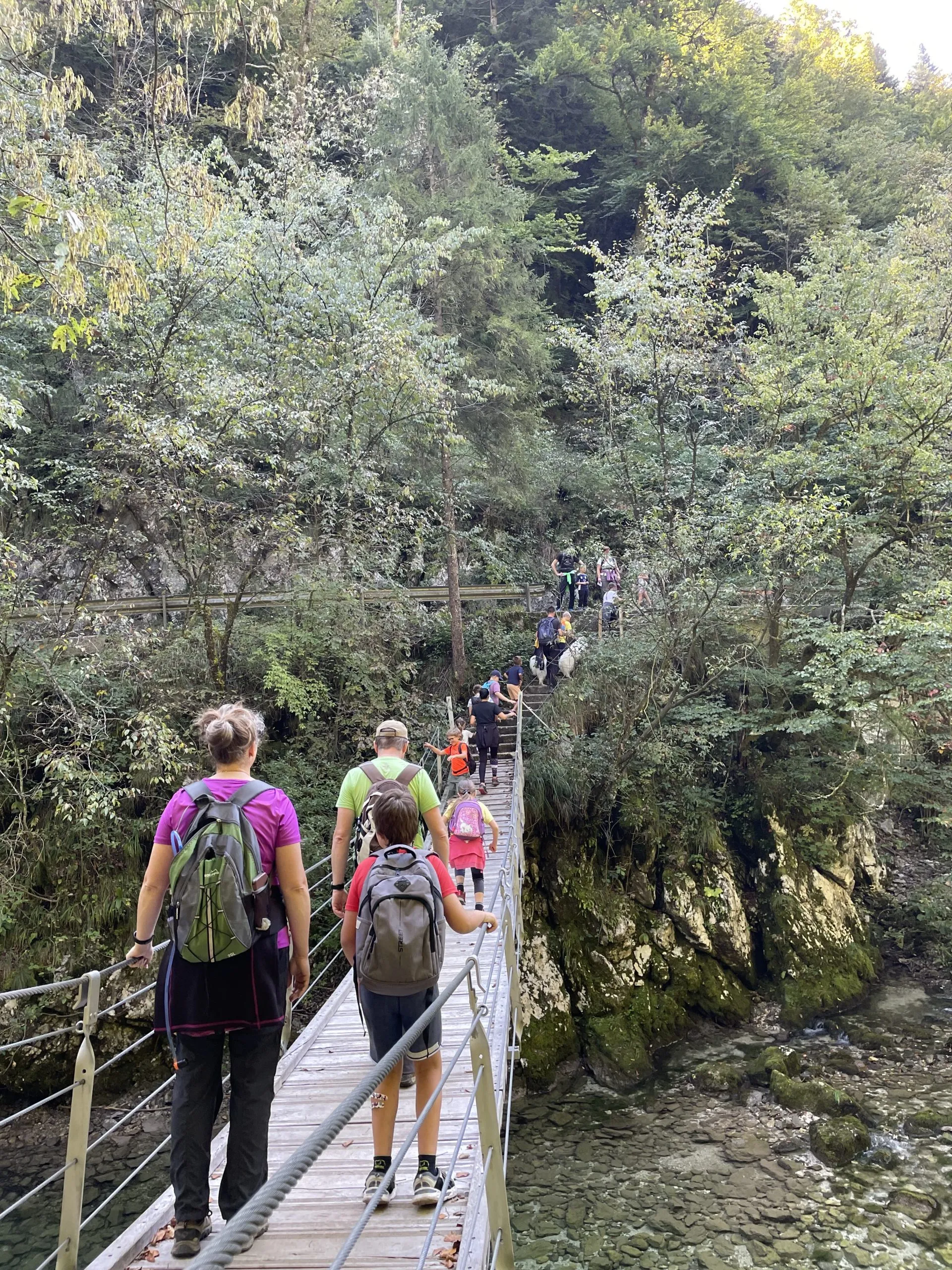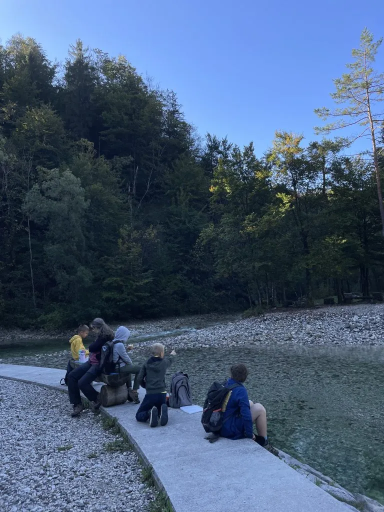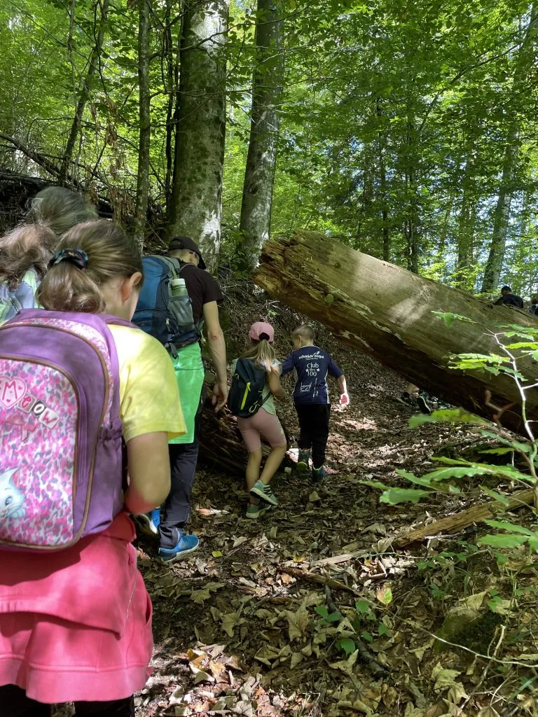 V soboto smo se ob 8.30 številčno zbrali v Zadlogu pri Kosmač. Na pohod so prišli učenci, njihovi starši, pa tudi nekaj štirinožnih prijateljev, kar nas je zelo razveselilo. Pot smo začeli po makadamski cesti navzdol, nato pa nadaljevali po stezi do Idrijske Bele. Presenetilo nas je, kako hitro smo prispeli tja. Po cesti smo pot nadaljevali do Lajšta, kjer smo si privoščili malico. Od tam smo se podali proti Fežnarju, nato pa še šest kilometrov po stezi do našega cilja –Divjega jezera, ki smo ga dosegli okoli 12. ure. Na poti smo prečkali nekaj potočkov, visečih mostov in preskočili nekaj podrtih dreves, kar je pohod naredilo še bolj zanimiv. Dan je bil popoln: topel, sončen in idiličen, pravšnji za družinski pohod.