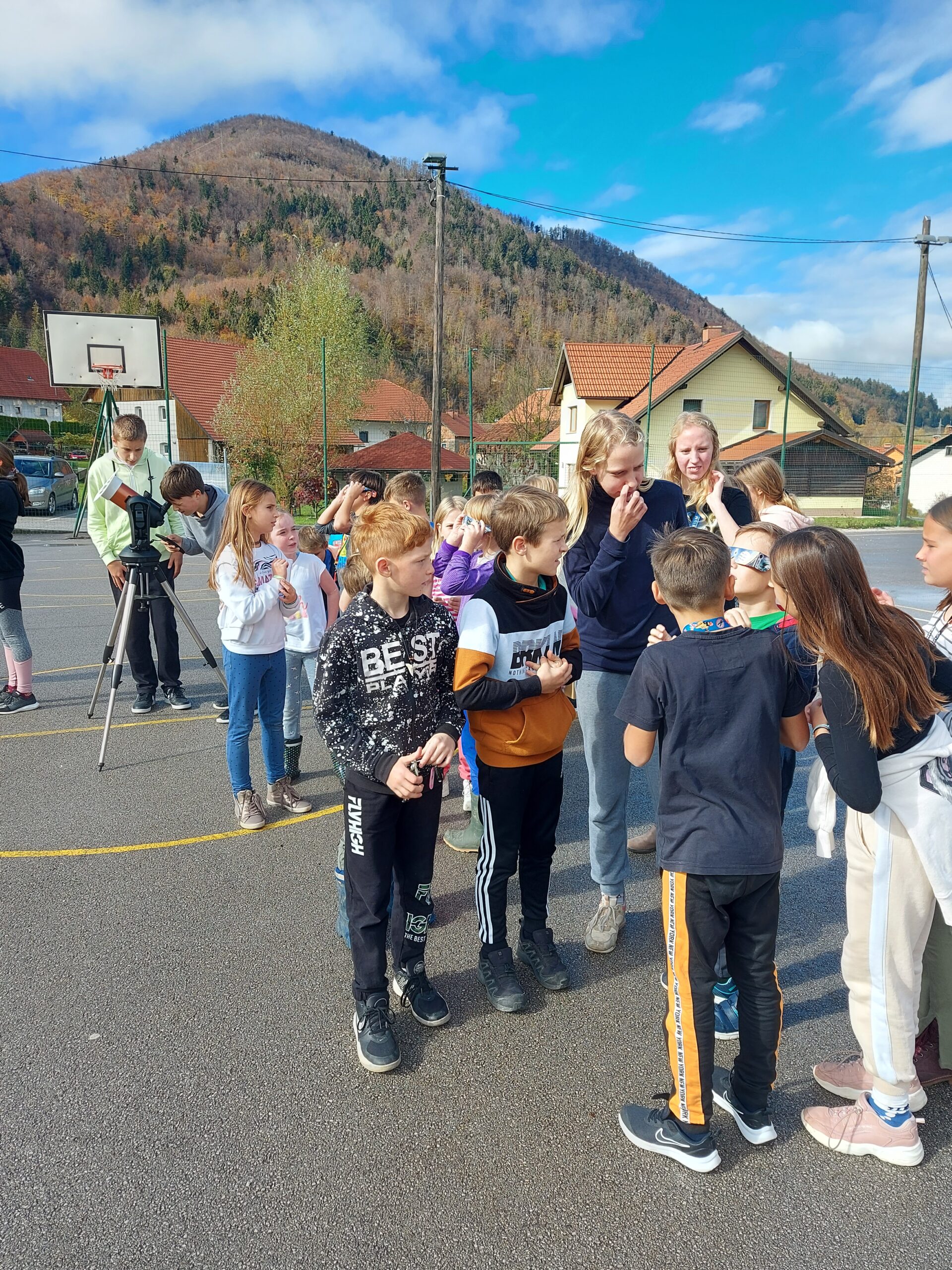 Člani astronomskega krožka smo se že od začetka šolskega leta veselili današnjega dne, saj smo vedeli, da nas čaka delni Sončev mrk. Ko je že kazalo, da nam bo opazovanje preprečilo slabo vreme, so se tik pred pričetkom mrka začeli oblaki umikati Soncu in skozi oblake smo lahko videli, kako Luna vedno bolj zastira Sonce. Ker Sonca ne smemo gledati s prostim očesom, smo za opazovanje uporabili posebno zaščitno folijo. Mrk je bil lepo viden, ogledali pa so si ga lahko vsi učenci. Tisti, ki mrka niste uspeli videti, pa si ga poglejte na fotografiji.