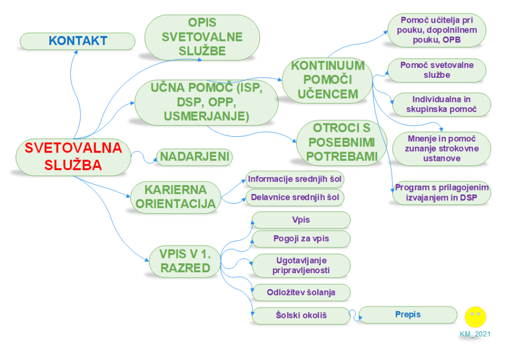 S svetovalno službo se prvič otrok sreča ob vstopu v osnovno šolo in ostane njegov sopotnik do konca osnovnošolskega izobraževanja, ko je pred njim odločitev o nadaljevanju šolanja. Šolska svetovalna služba je na tej poti spremljevalec, ki poskuša pristopiti, ko nastanejo težave, zmanjka moči, se zazdi, da se vse rešitve izmikajo.