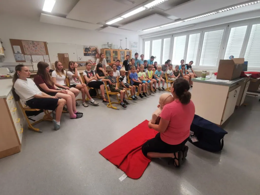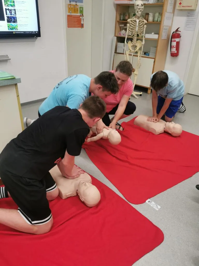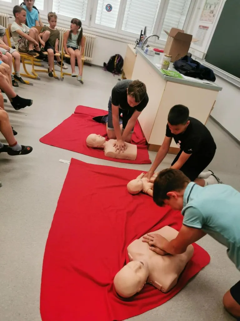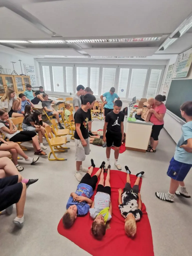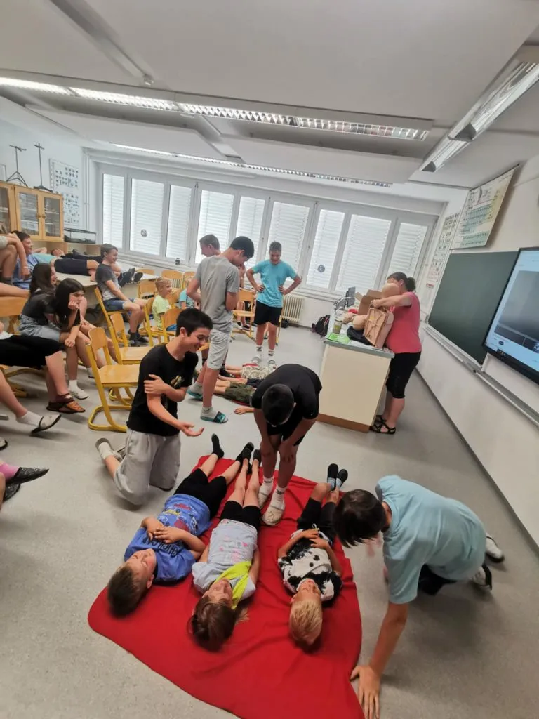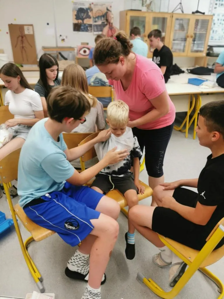 Danes (ponedeljek, 23. 6. 2025) so imeli osmošolci prav poseben pouk – preizkusili so se v osnovah prve pomoči. Pod vodstvom učiteljice gospe Bajc Hlad, ki sicer poučuje v prvem razredu, so izvedli krajši prikaz nudenja prve pomoči ob različnih poškodbah.