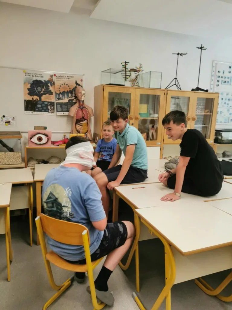Pri tem so jim na zanimiv in igriv način pomagali učenci prvega razreda, ki so se prelevili v »poškodovance«. Z velikim veseljem so sodelovali in se zelo vživeli v svoje vloge.