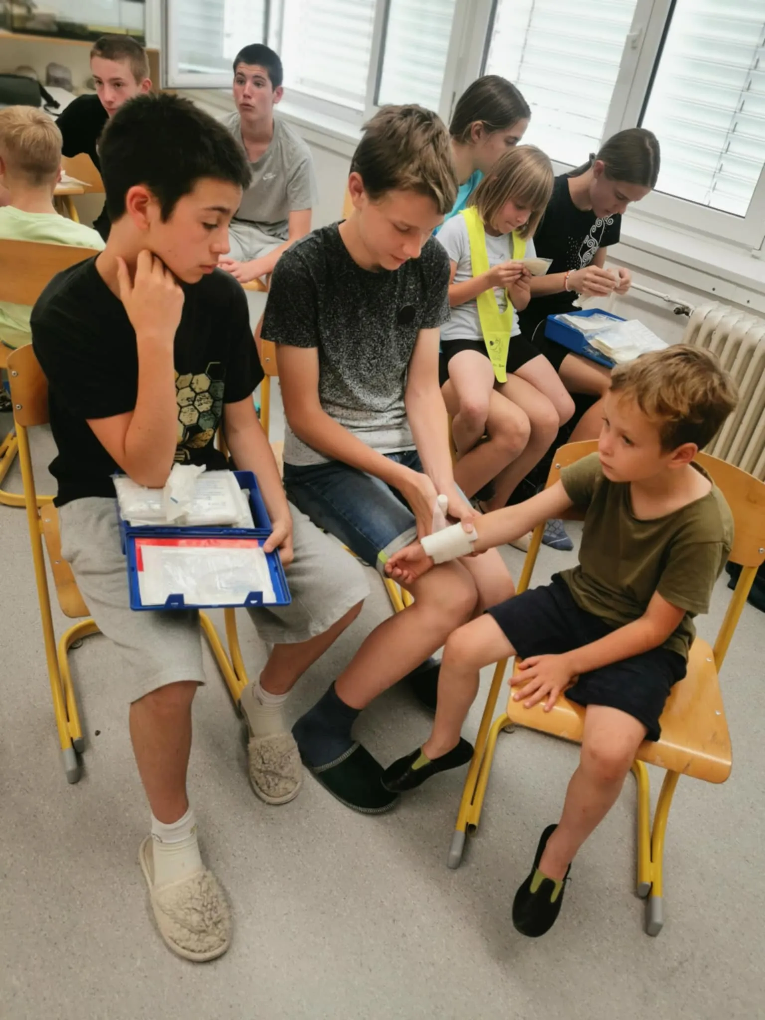 Danes (ponedeljek, 23. 6. 2025) so imeli osmošolci prav poseben pouk – preizkusili so se v osnovah prve pomoči. Pod vodstvom učiteljice gospe Bajc Hlad, ki sicer poučuje v prvem razredu, so izvedli krajši prikaz nudenja prve pomoči ob različnih poškodbah.
