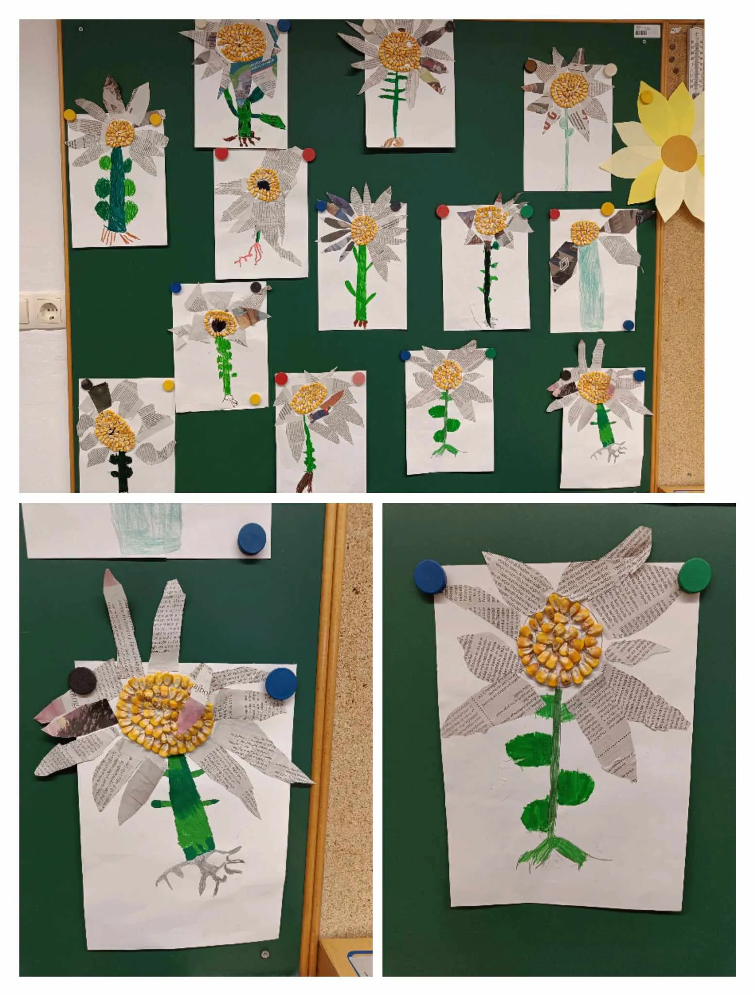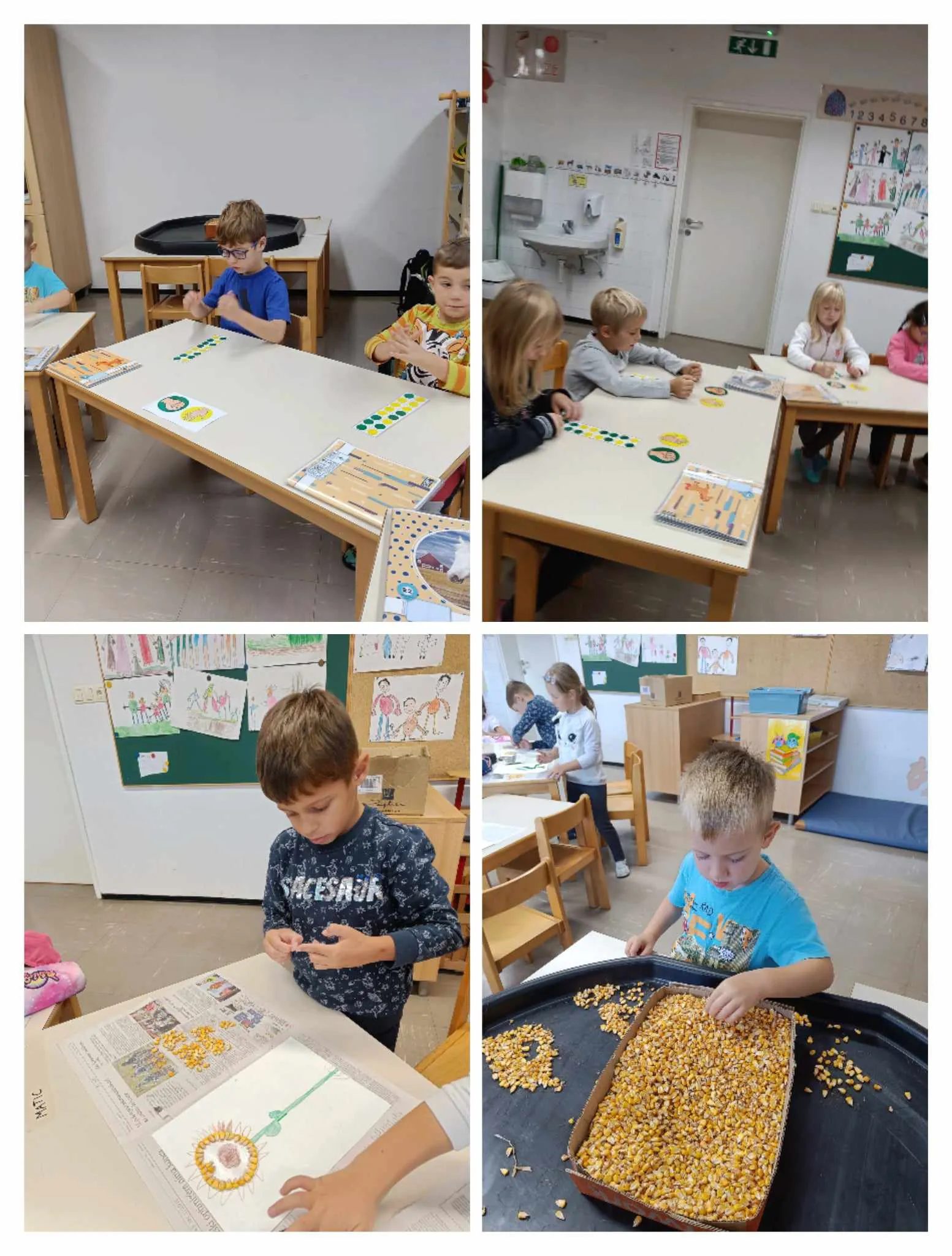 Fino motoriko in pincetni prijem smo urili s prebiranjem koruznih zrn in izdelovanjem sončnice.
