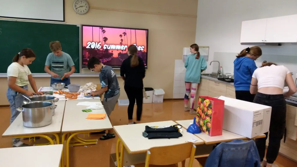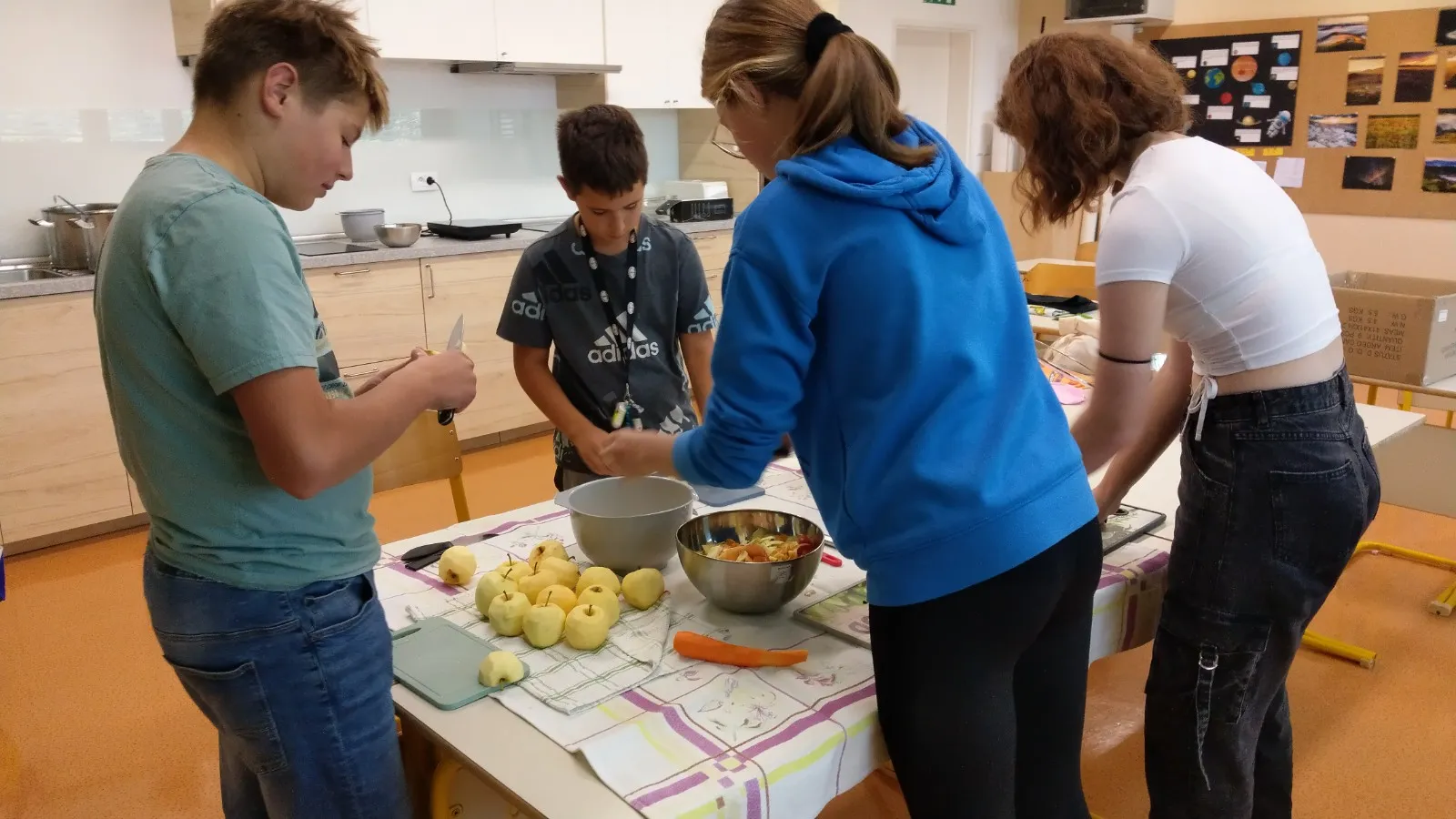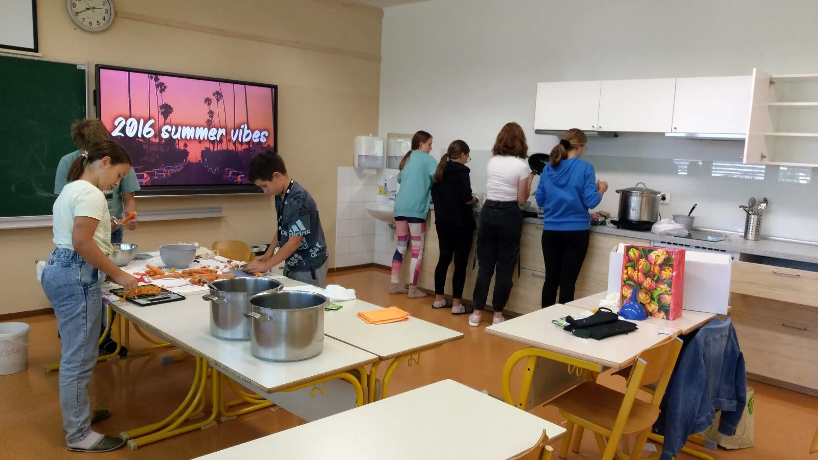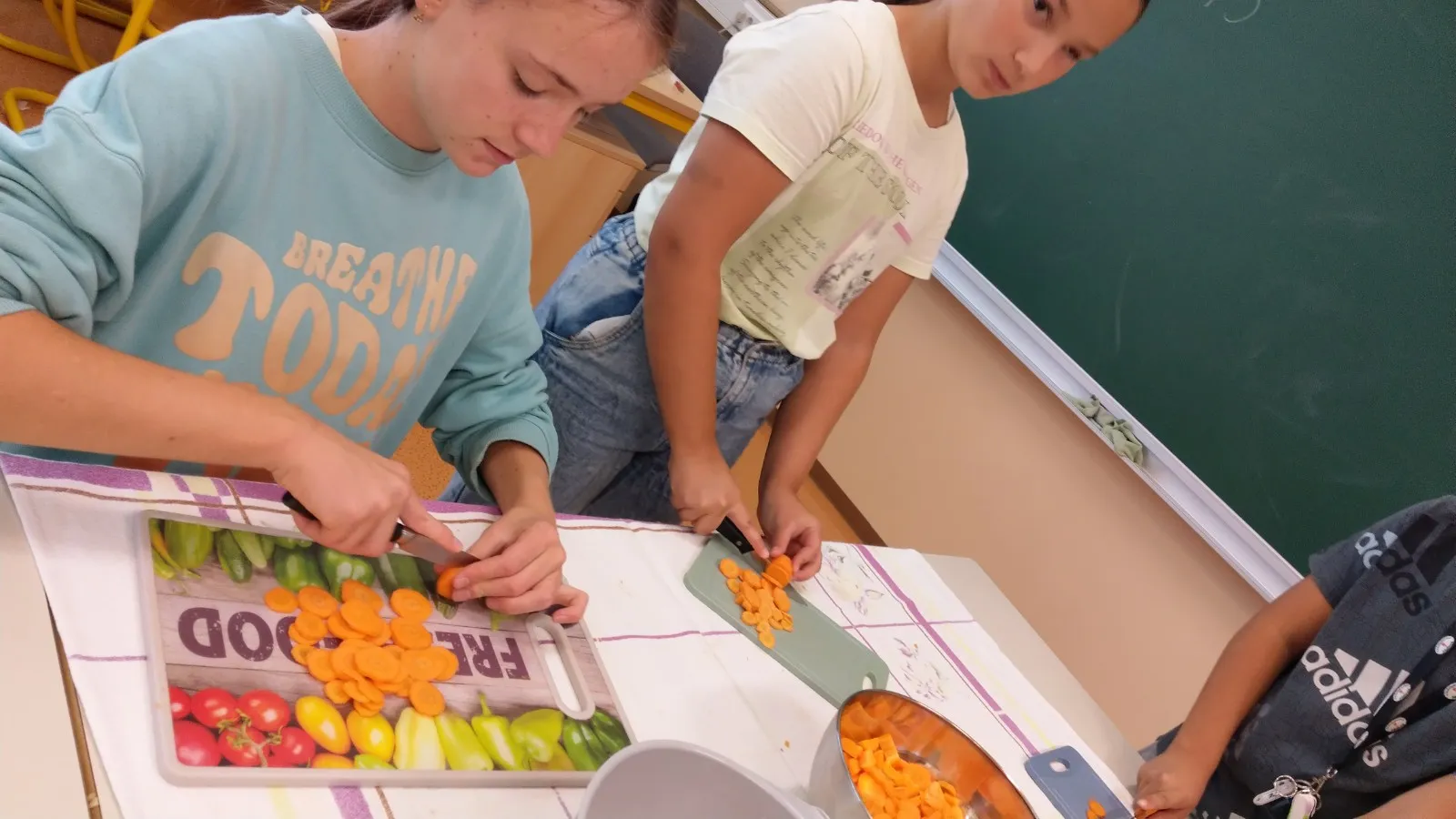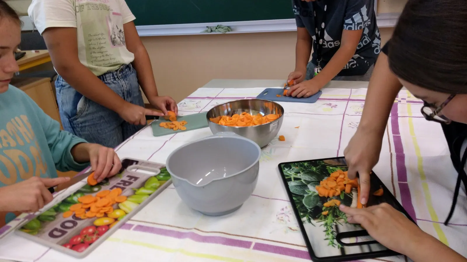V četrtek smo imeli prvo srečanje z gospodinjskim krožkom. Naš projekt je bil naravni korenčkov sok, ki ga bomo ponujali kot energijski napitek pred našo športno soboto. Srečanje smo začeli z zbiranjem ter se takoj zatem lotili dela. Najprej smo olupili korenje in jabolka, nato pa jih narezali na majhne koščke, skuhali ter zmiksali v gladke pireje.