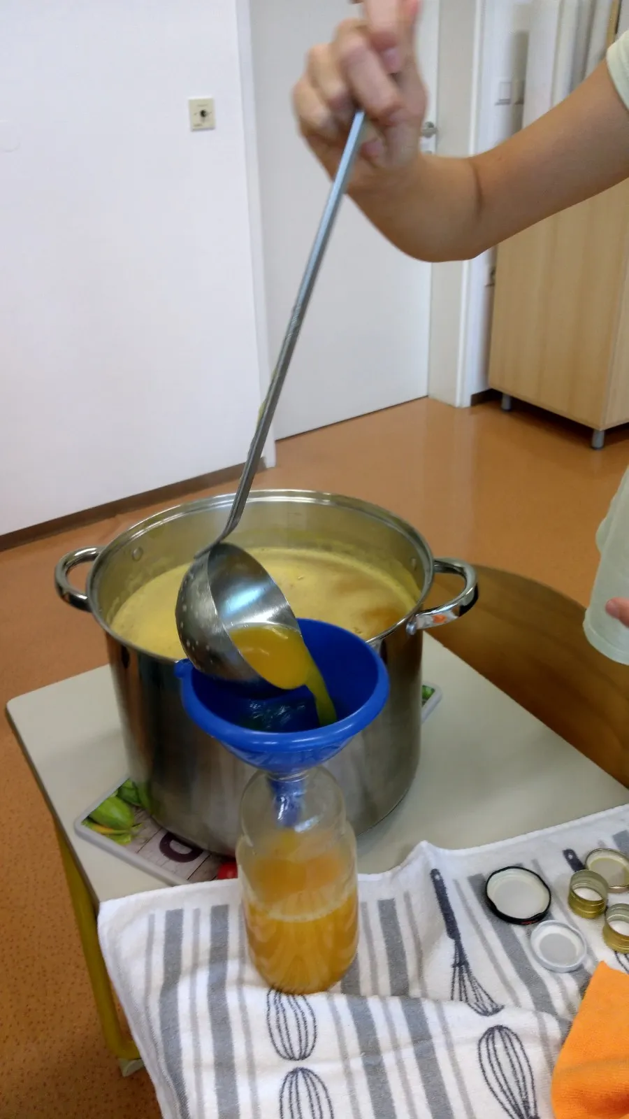 Naše pireje smo zredčili, dodali začimbe ter še naprej kuhali. Med kuhanjem smo v pečici segreli – sterilizirali steklenice. Po končanem kuhanju smo iz pečice vzeli steklenice ter jih ter jih počasi polnili. Z izdelkom smo bili zelo zadovoljni, saj smo ga naredili sami iz naravnih sestavin.