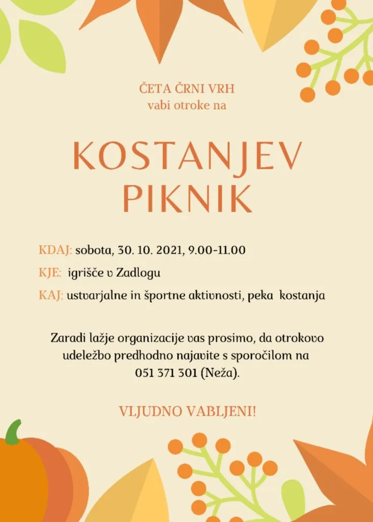 Črnovrški taborniki vas 30. oktobra 2021 vabijo na ustvarjalne dejavnosti in kostanjev piknik.