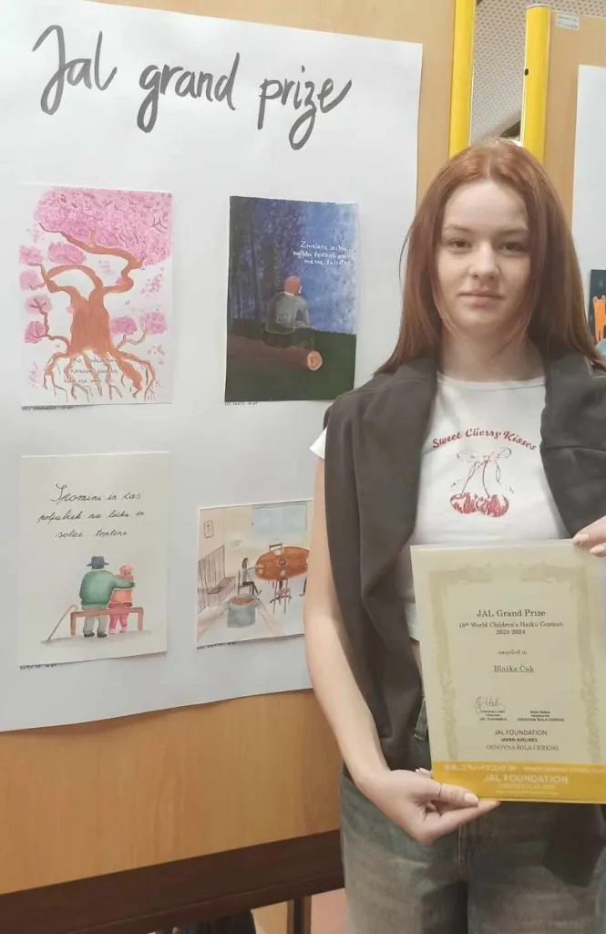 Že v aprilu smo poročali, da sta učenki Sara Mivšek in Blažka Čuk (zdaj že dijakinja) dosegli prav poseben uspeh. Na svetovnem natečaju za najboljši otroški haiku, ki ga organizira Jal fundacija na Japonskem, je Sarin haiku prejel nagrado »Jal prize«, Blažkin pa »Jal grand prize«.